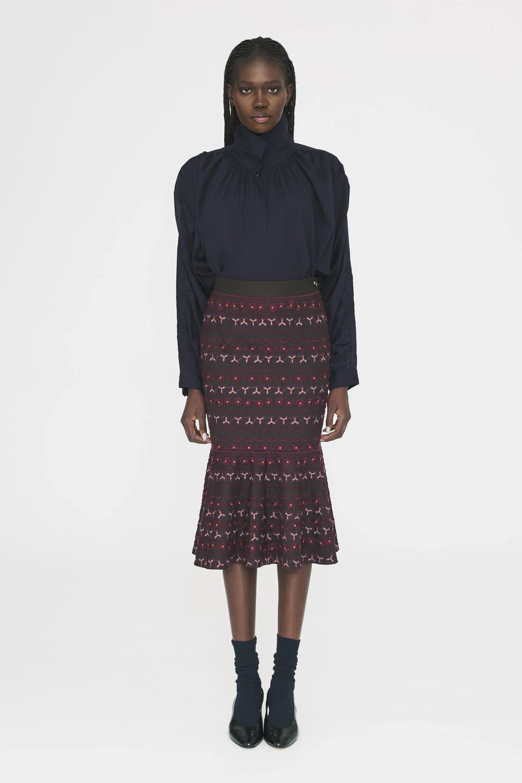 Blouse en voile de coton. Coupe ample. Manches ballon froncées. Double ganse à la couture. Col montant. Patte de boutonnage dissimulée qui permet de porter la blouse ouverte.