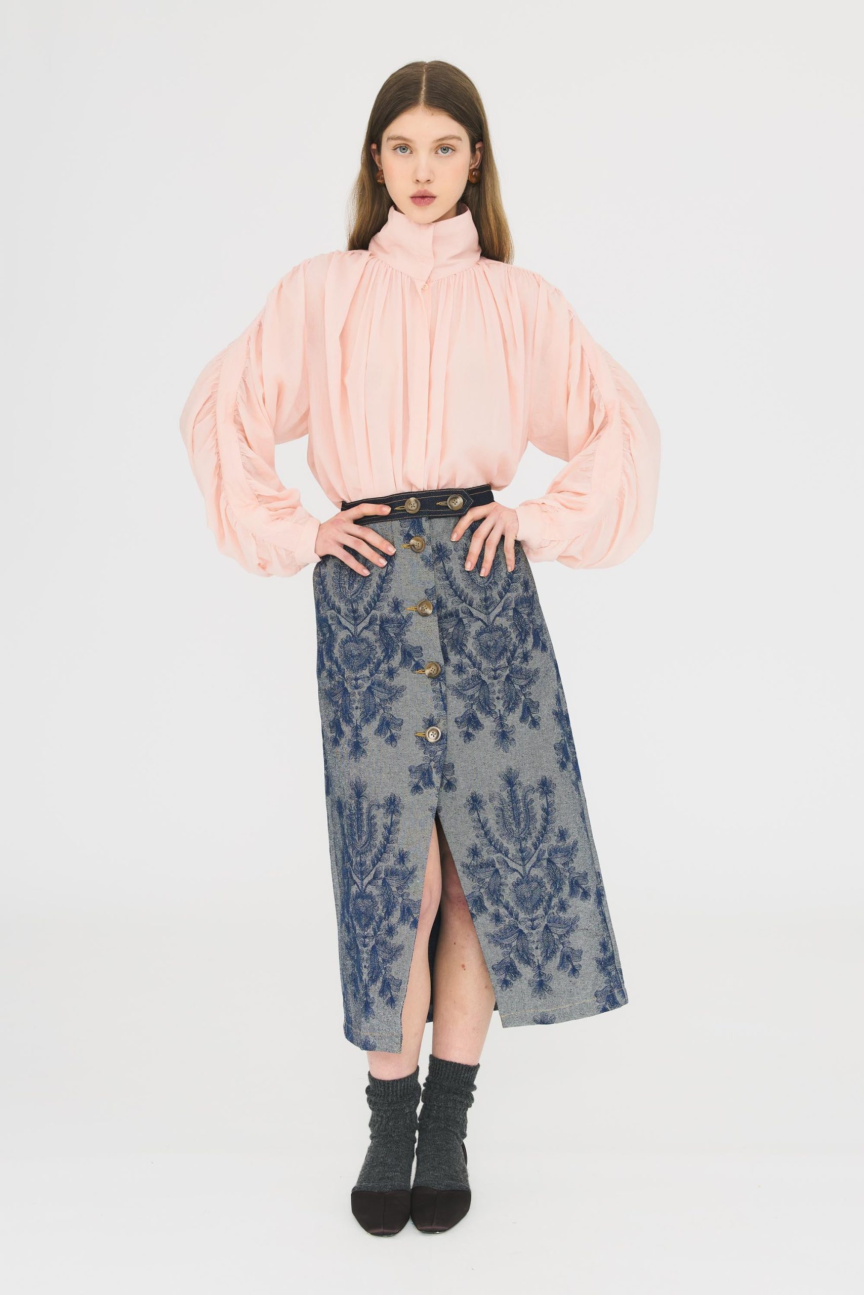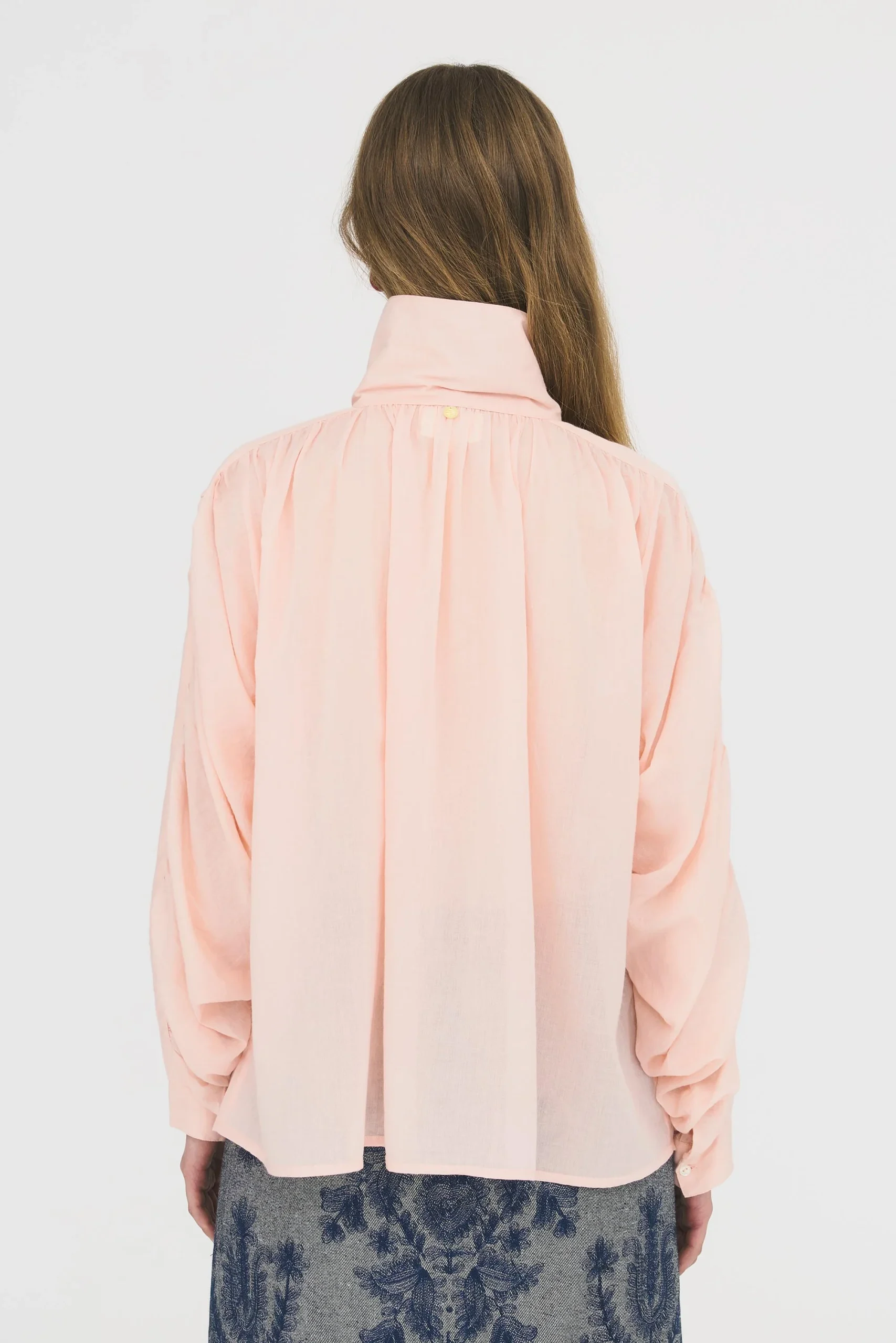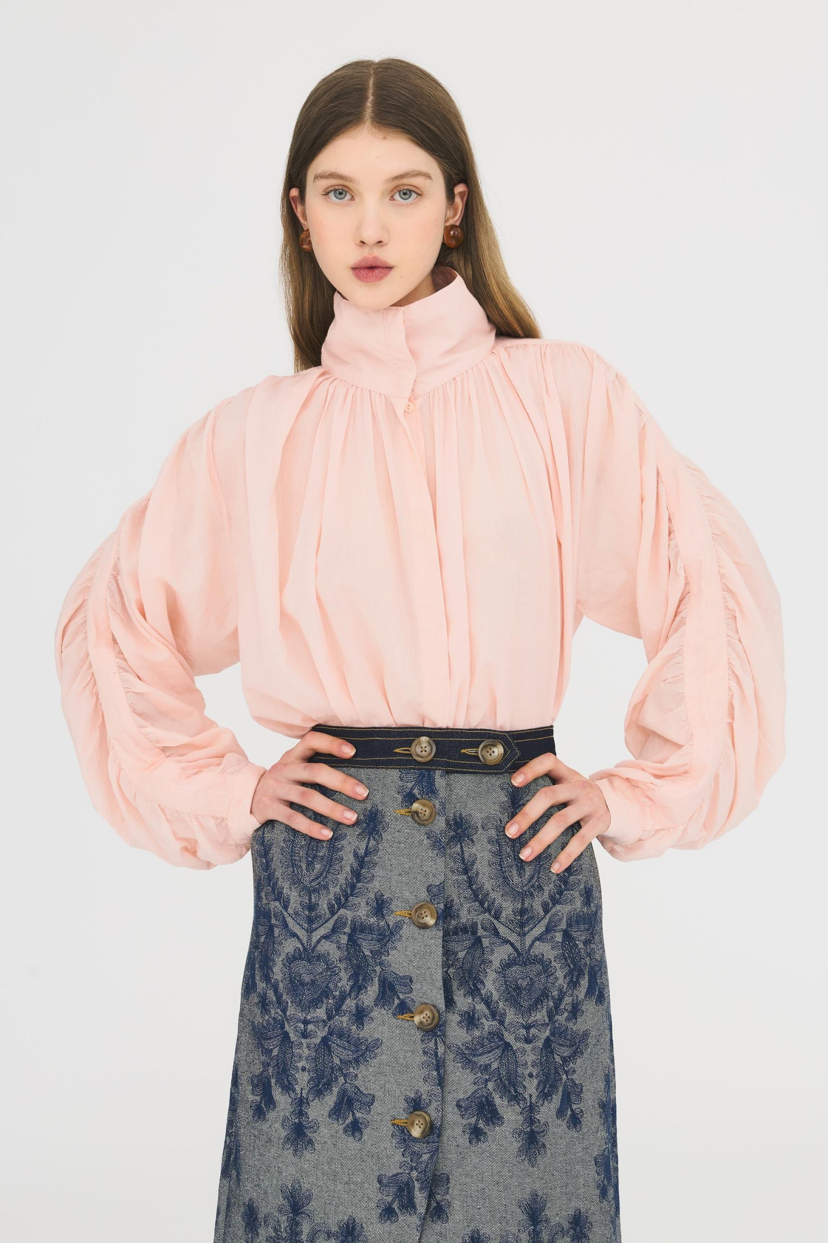 Blouse en voile de coton. Coupe ample. Manches ballon froncées. Double ganse à la couture. Col montant. Patte de boutonnage dissimulée qui permet de porter la blouse ouverte.