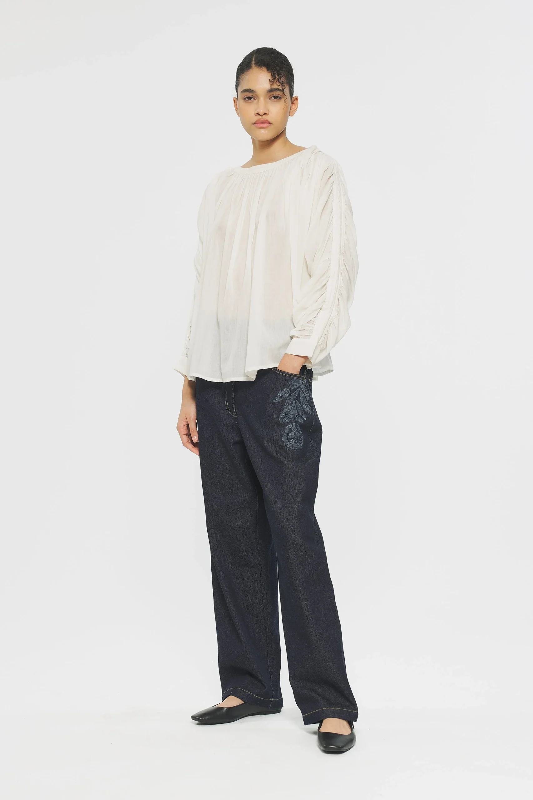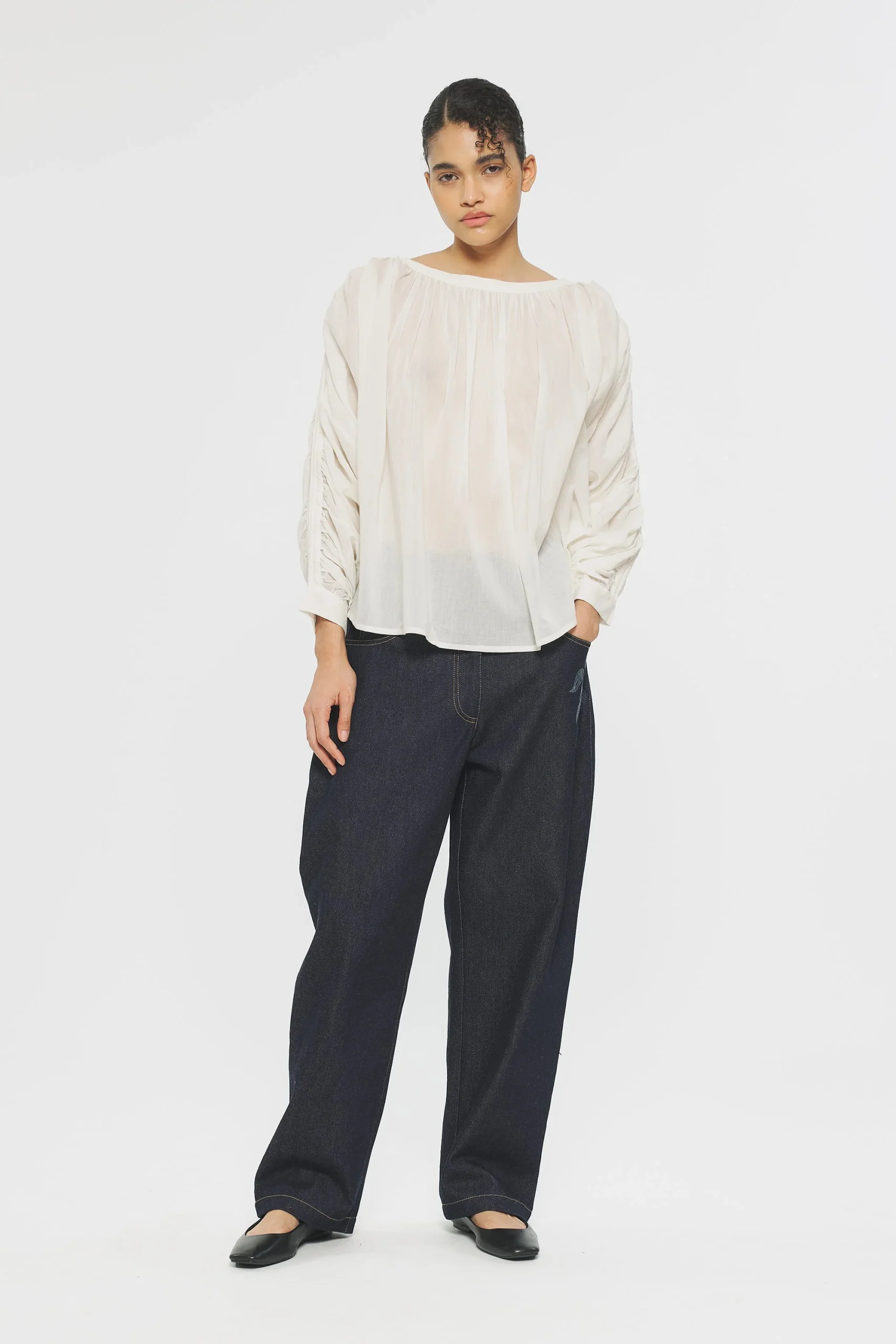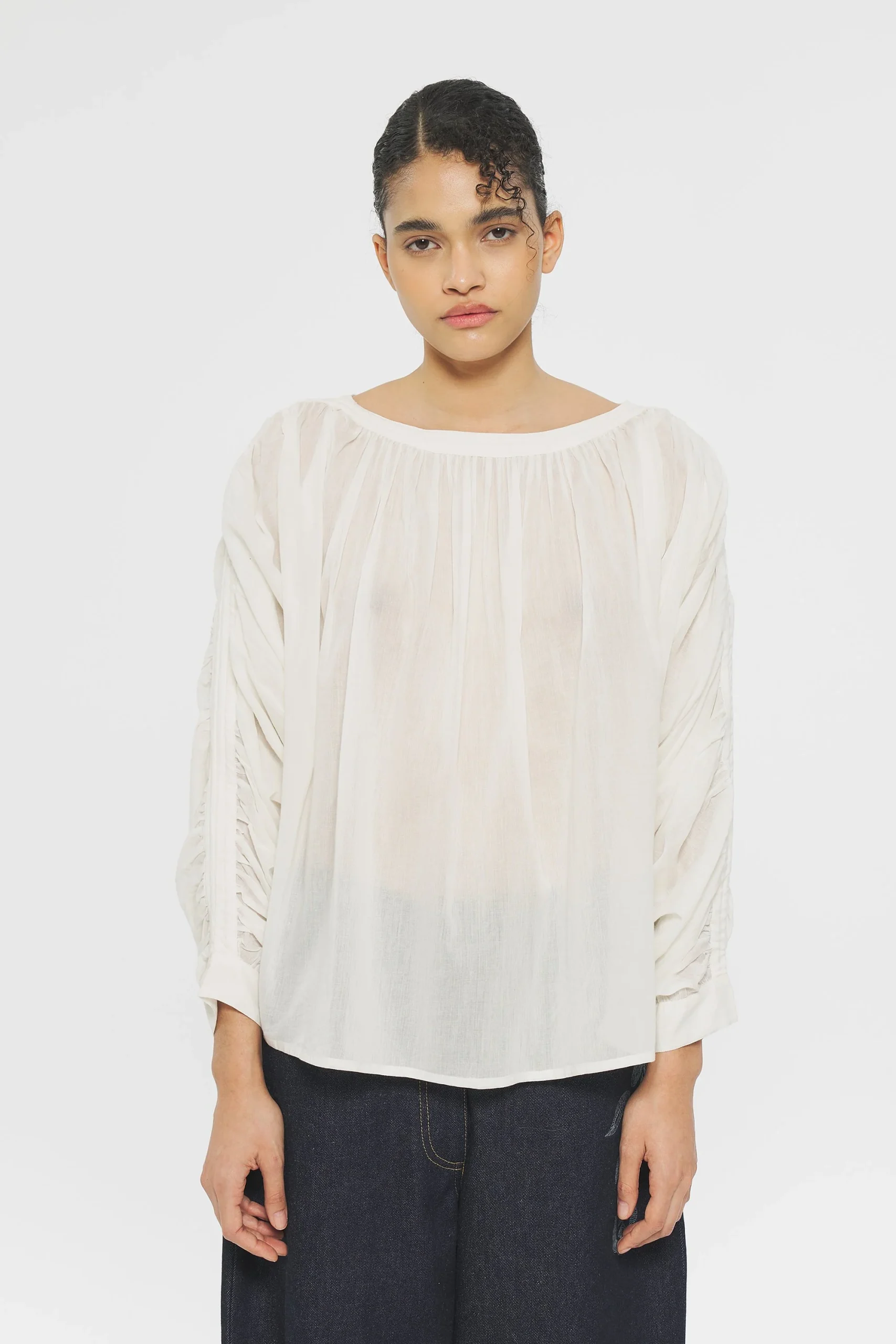 Blouse en voile de coton. Manches froncées. Double ganse à la couture. Boutons aux poignets en nacre naturelle.