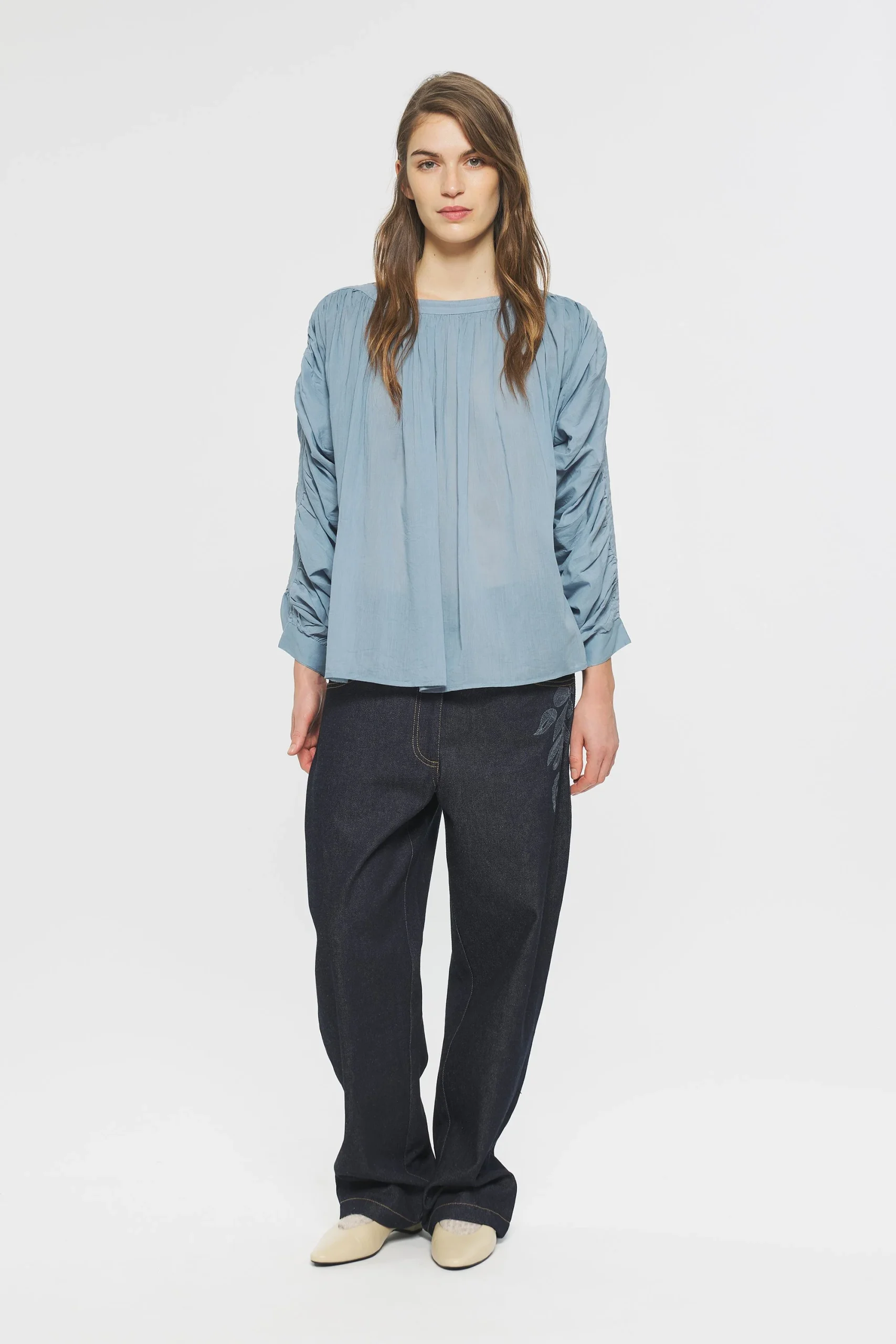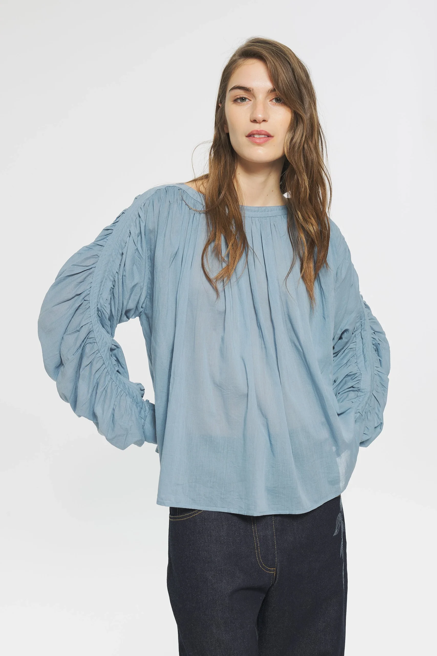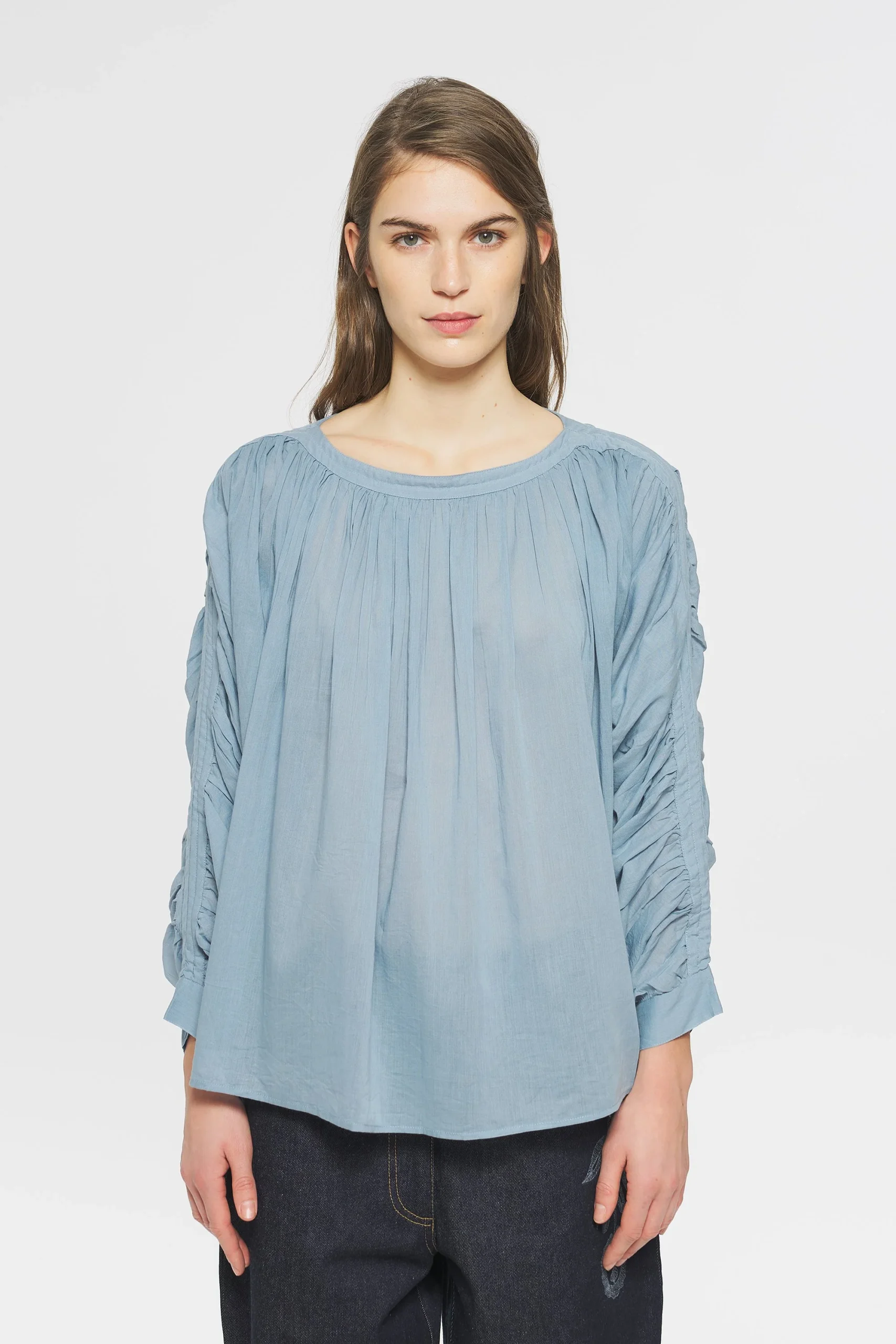 Blouse en voile de coton. Manches froncées. Double ganse à la couture. Boutons aux poignets en nacre naturelle.
