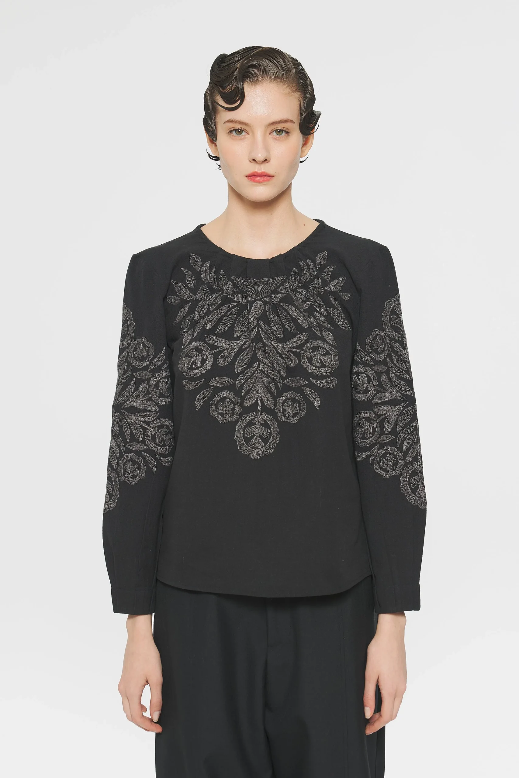 Blouse en coton brodée artisanalement sur le devant et sur les manches. Fermée aux poignets par des boutons en nacre. Fermeture dans le dos par un cordon en coton.