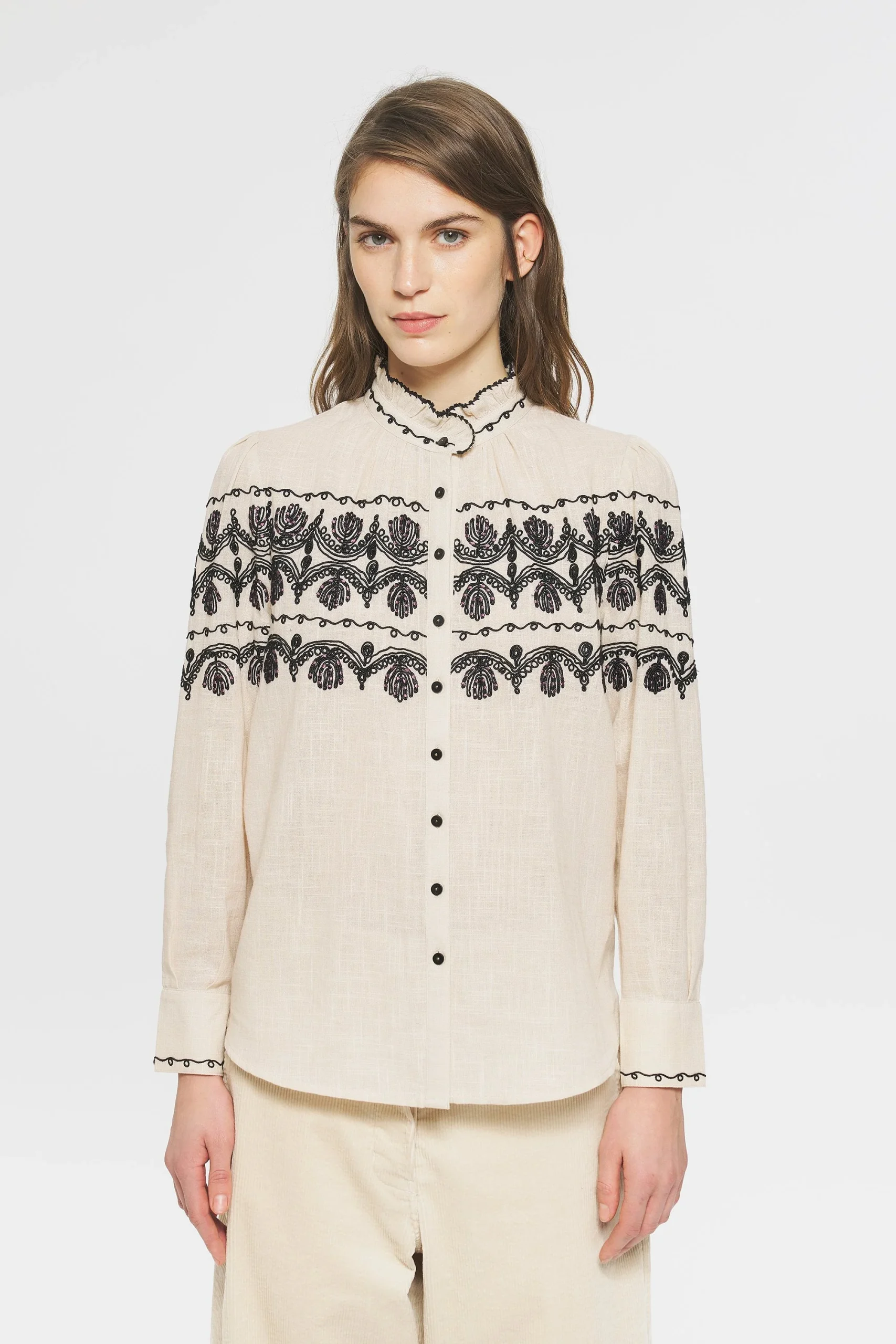 Blouse en coton. Broderies sur le devant et les manches réalisées de manière artisanale. Patte de boutonnage sur le devant et aux poignets. Manches ballon resserrées aux poignets par des boutons. Ruban en coton brodé au col.