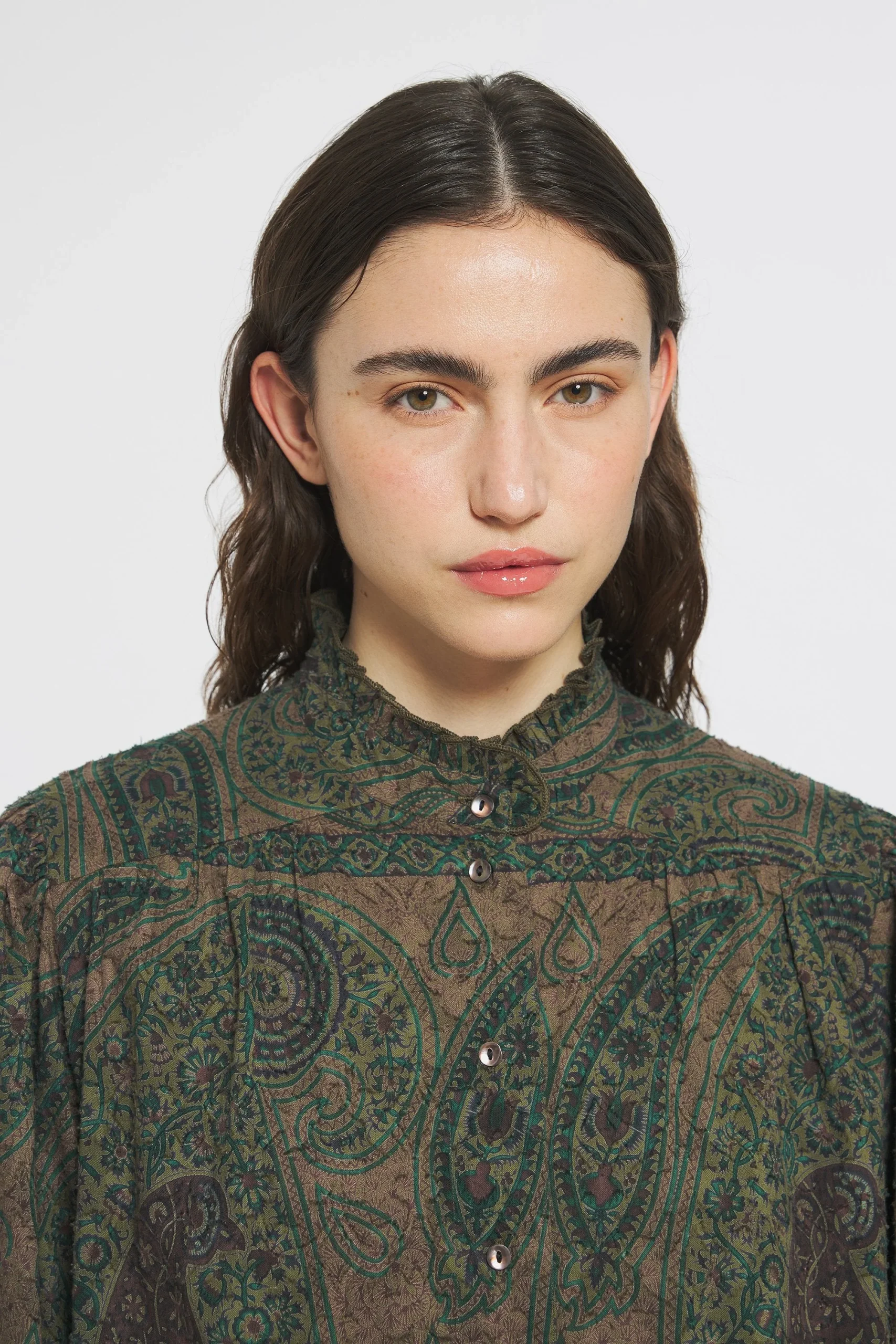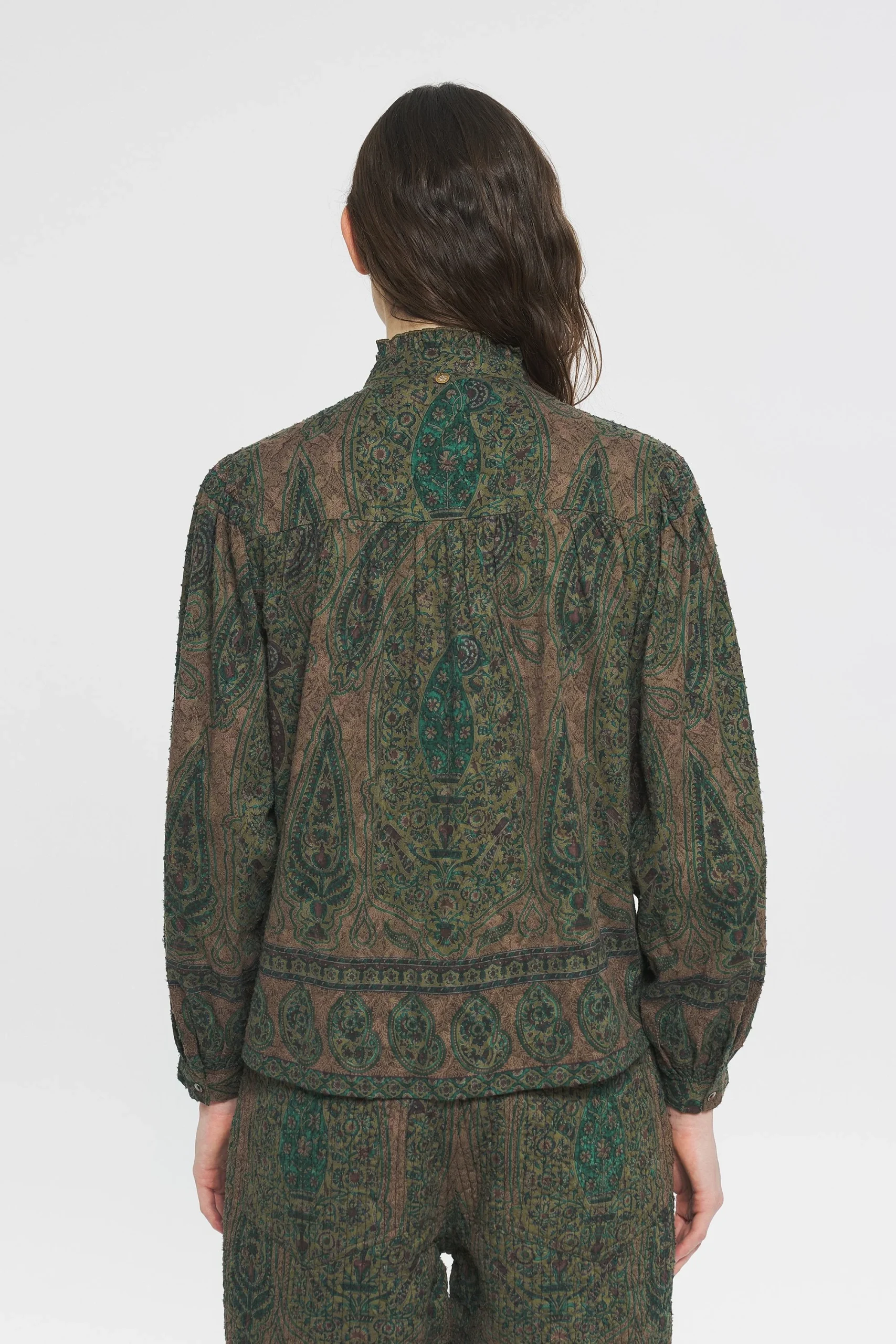 Blouse ample en voile de coton. Col rond et montant. Fermée dans le dos et aux poignets avec des boutons en nacre. Froncée aux épaules. Boutons en nacre.