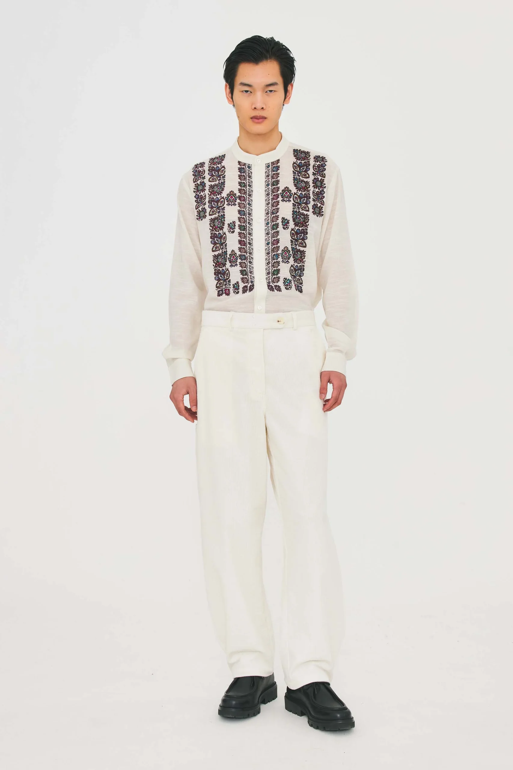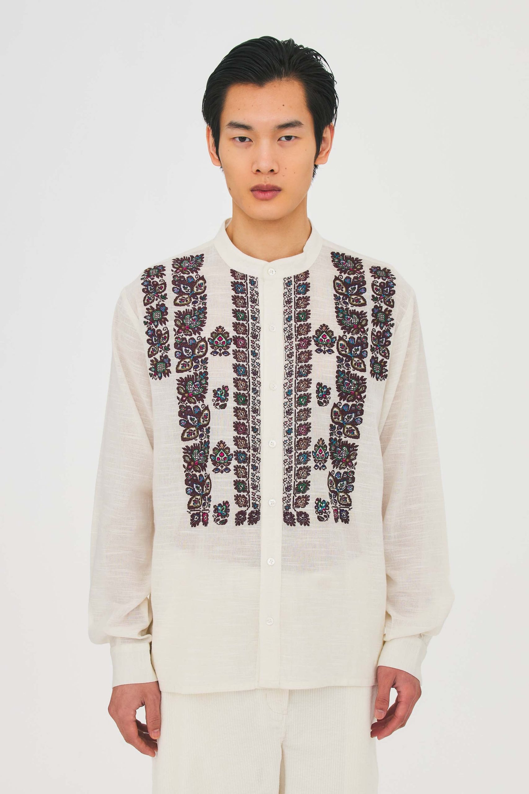 Chemisier brodé au point de croix d’inspiration hongroise en coton et crochet appliqué à la main.