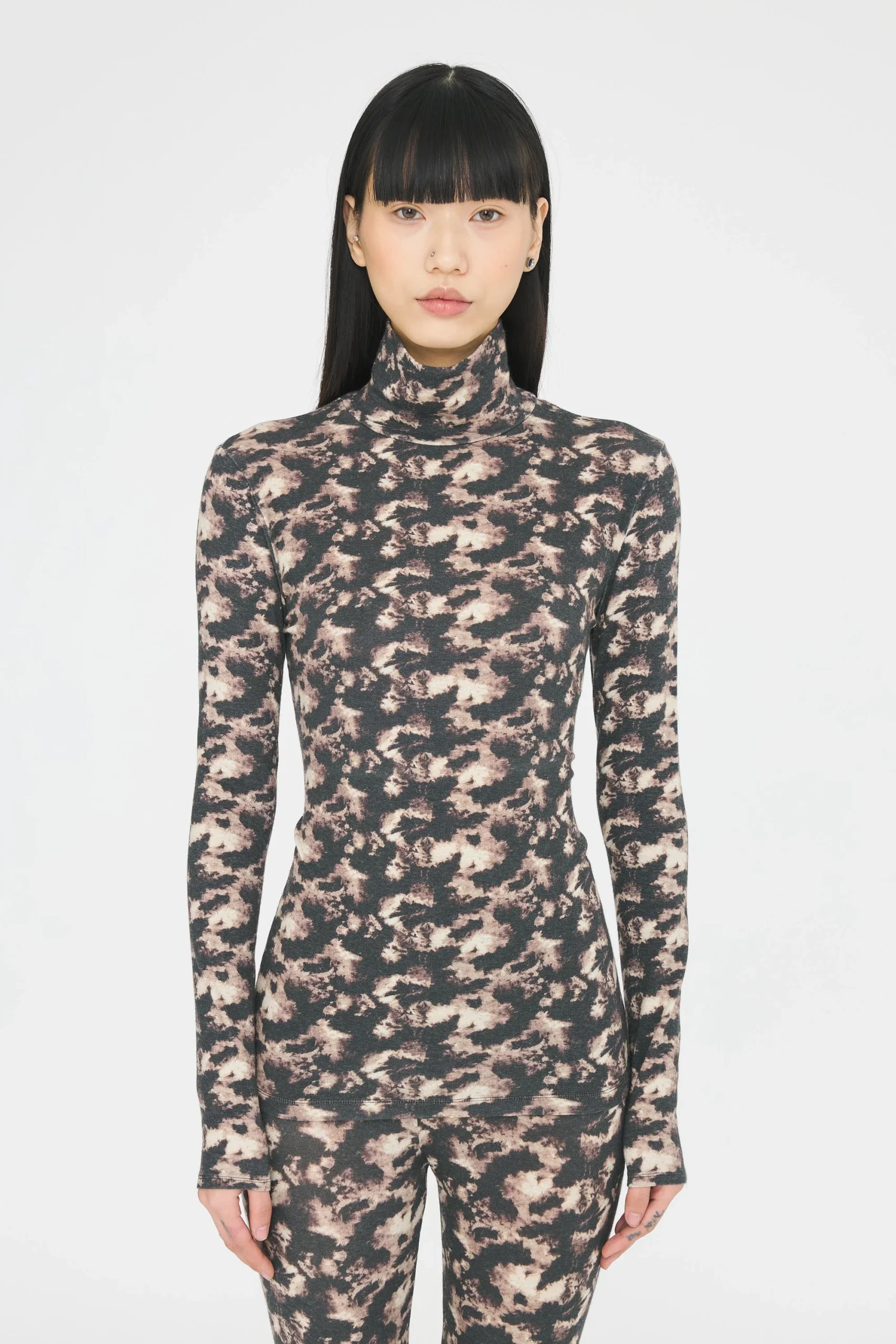 Col roulé imprimé. Coupe près du corps. Coupe « seconde peau ».