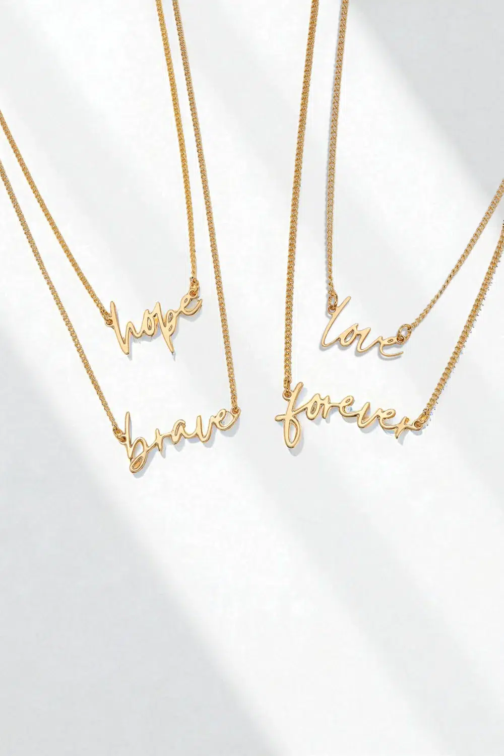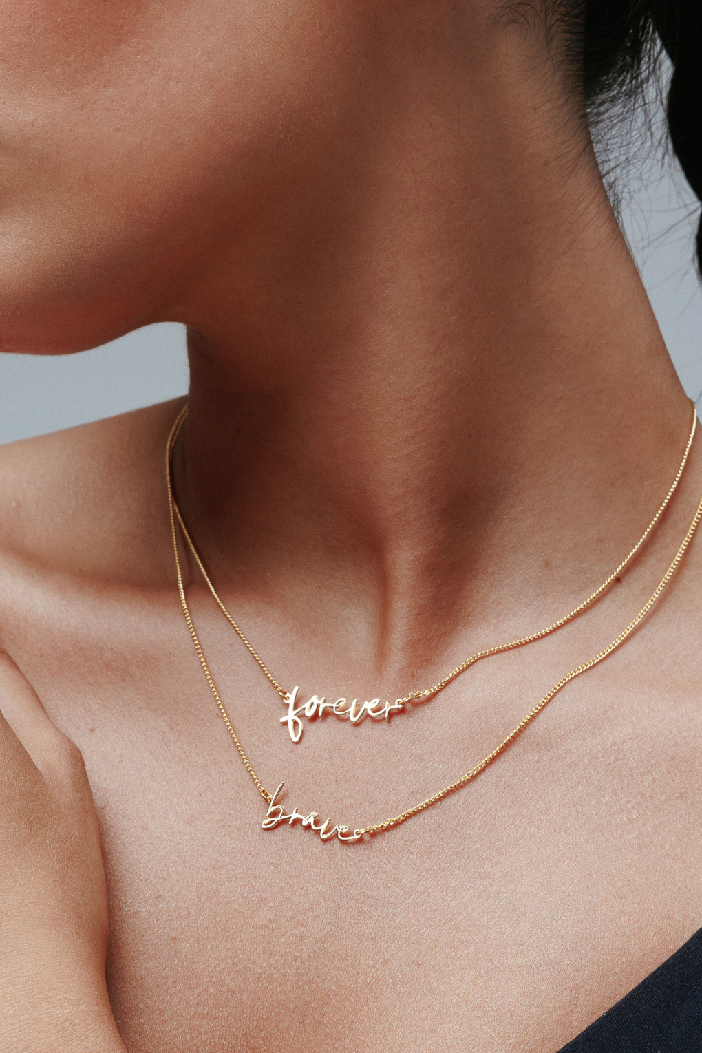 Fin et délicat, il se compose d’une chaîne légère et d’un pendentif gravé dans une écriture manuscrite élégante — love, brave, hope ou forever.