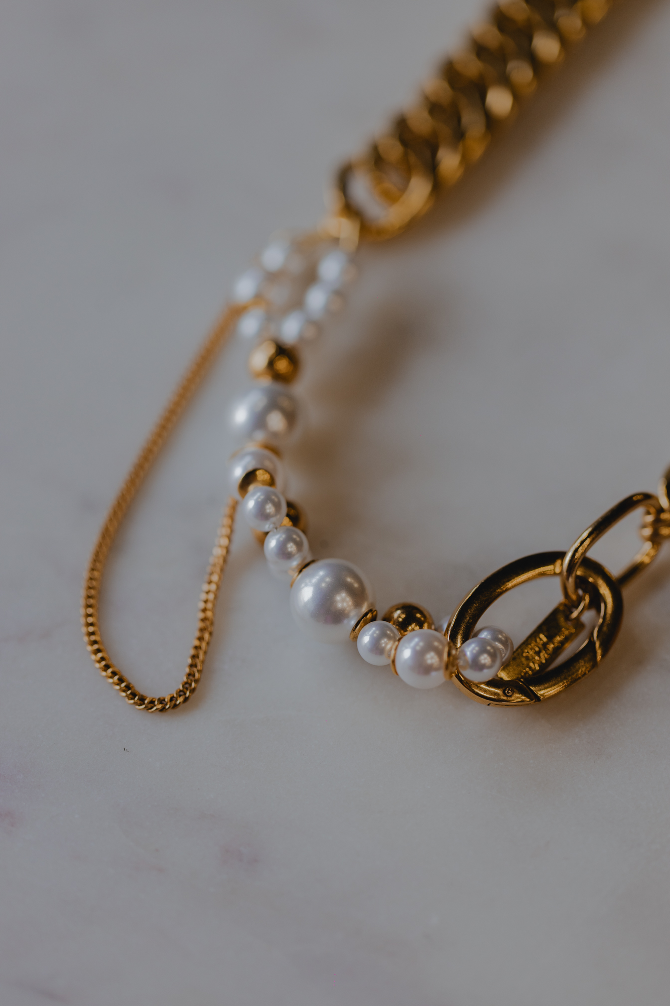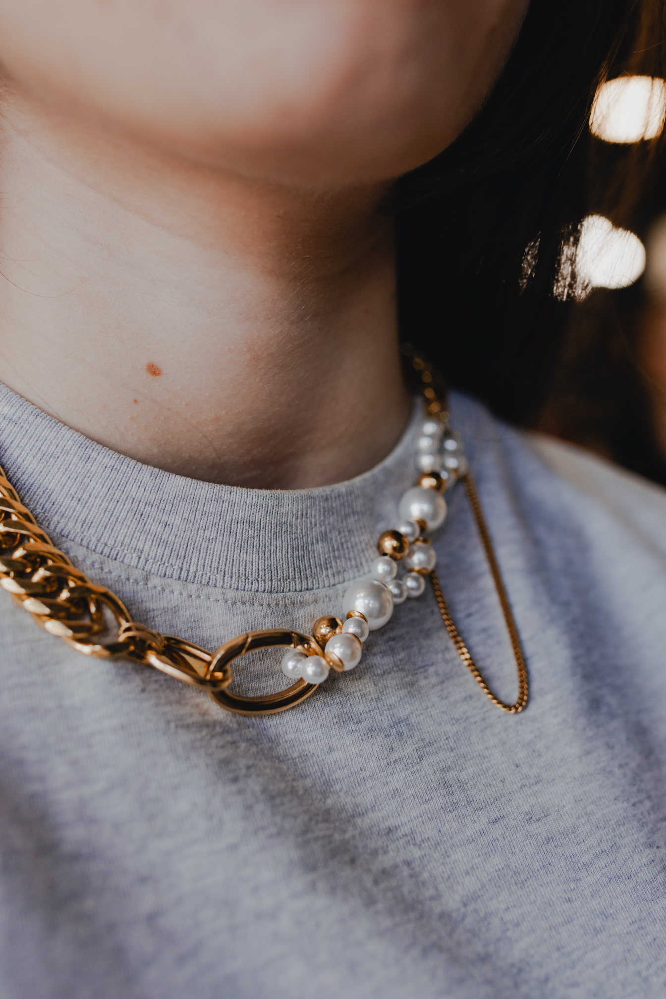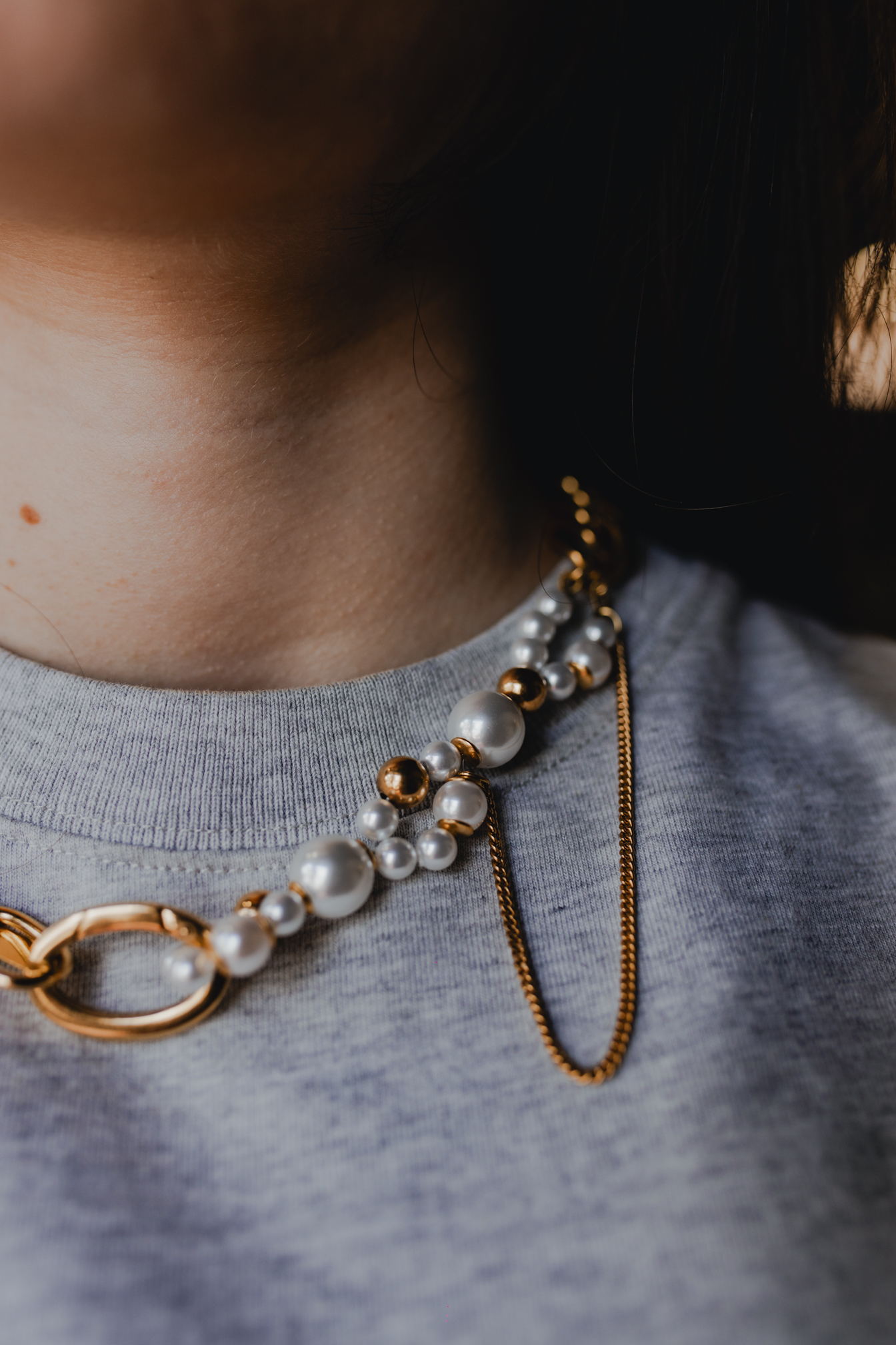 Le collier Anjou de Perrine Taverniti incarne l’équilibre parfait entre force et délicatesse. Il mêle une chaîne plaquée or massif au volume affirmé à une composition irrégulière de perles blanches nacrées, ponctuées de perles dorées pour une touche précieuse et contemporaine. Une pièce asymétrique et sophistiquée qui détourne les codes classiques de la perle pour mieux les sublimer.