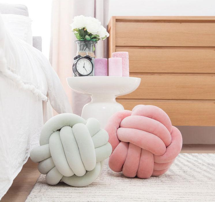 Notre Coussin Nœud, est composé d’un seul tube en tissus rembourré et noué pour former une pelotes moelleuse. Ce coussin à nœuds est une sphère parfaitement ronde grâce à ces 3 anneaux sur tous les côtés. Touchez-le maintenant et ressentez une douceur inégalée !
