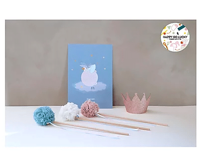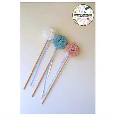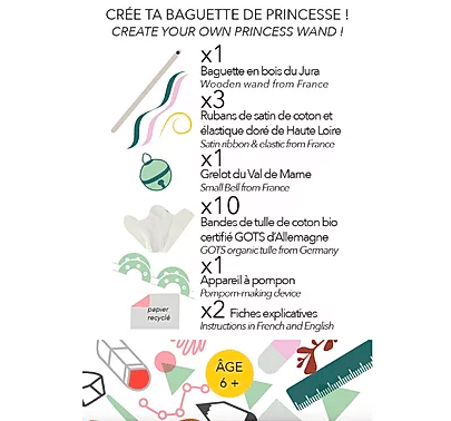 Happy go lucky est allé chercher dans le Jura une jolie baguette en bois, en Allemagne chez C.Pauli des bandes de tulle de coton biologique et en France un joli grelot et des beaux rubans de satin de coton. Ils ont rajouté un appareil à pompon grâce auquel vous pourrez confectionner le plus beau des pompons en tulle !