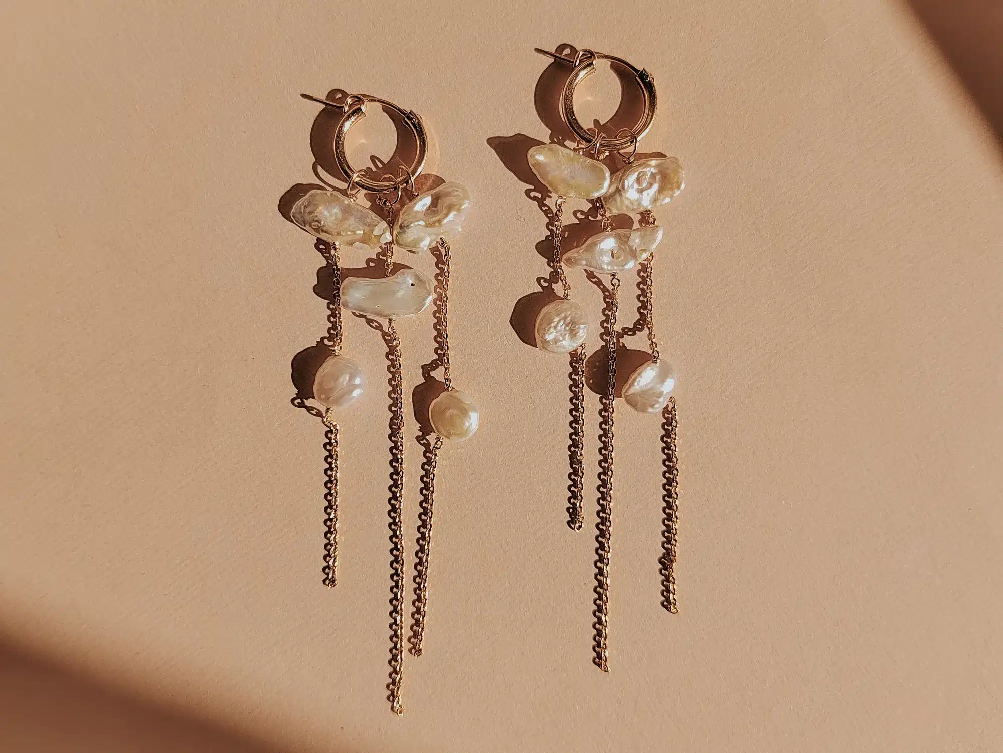Créoles de 12 cm de longueur, composées de chaînes fines agrémentée de perles d’eau douce baroques en forme de pétale de fleurs.