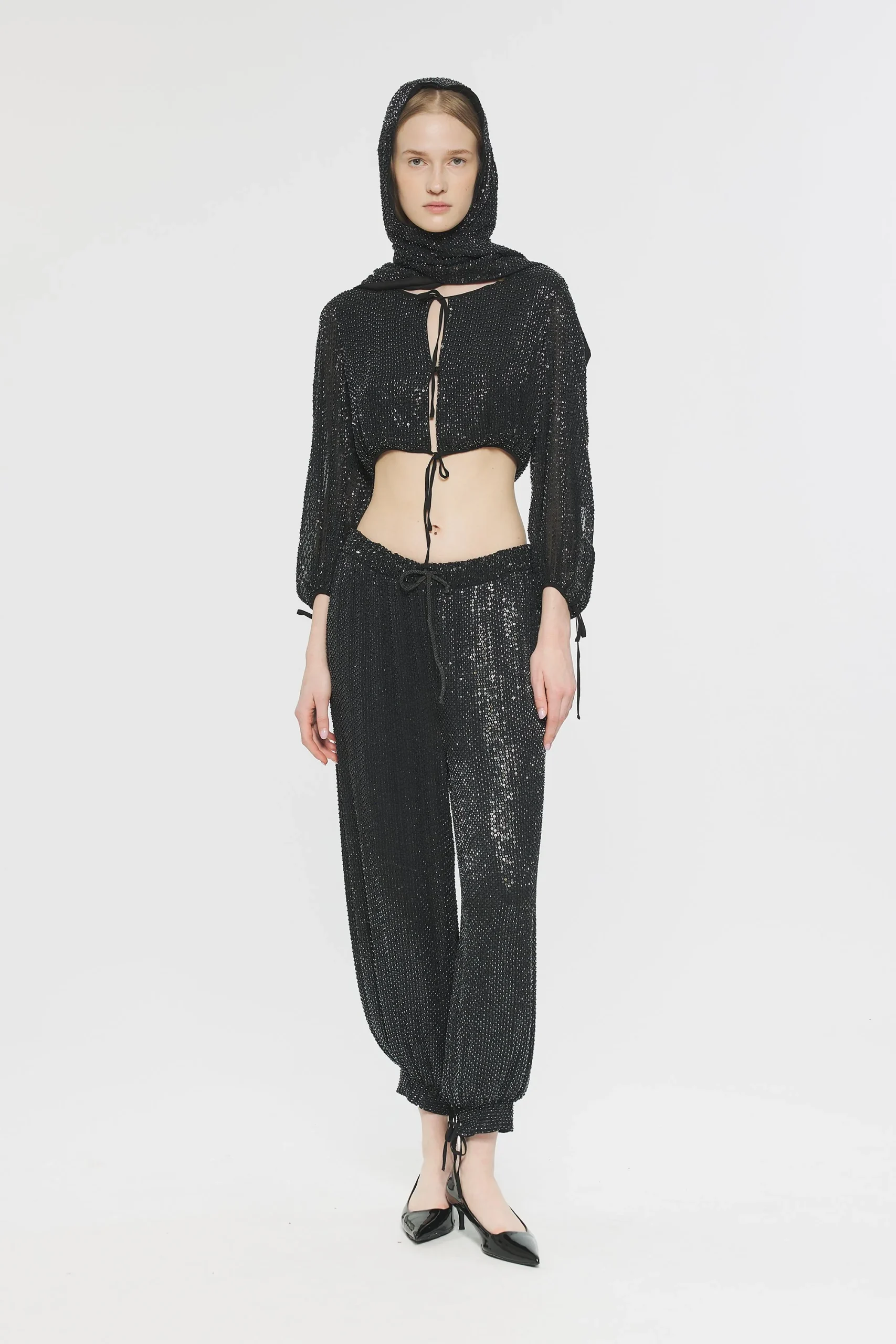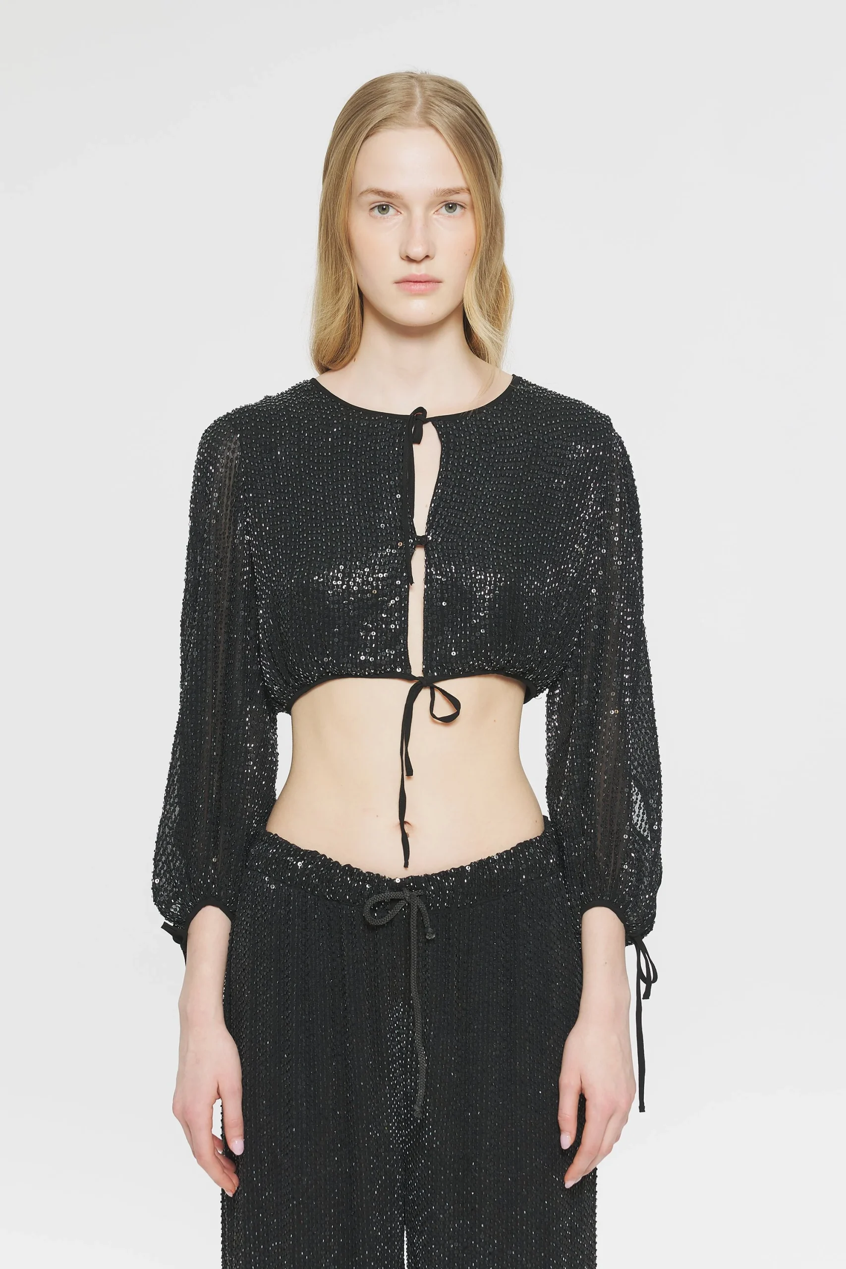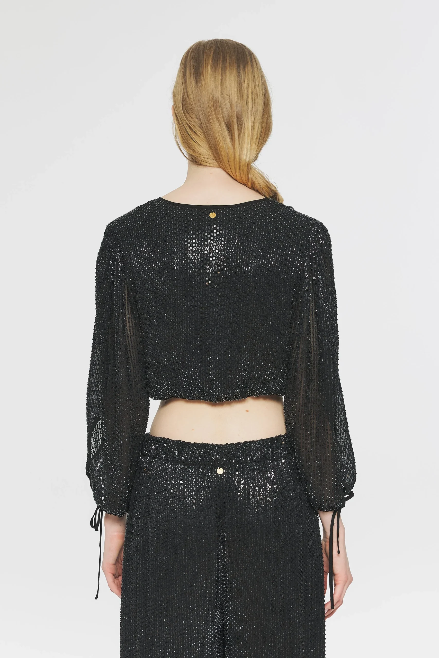Crop top en crêpe de viscose. Brodé de perles de rocaille en verre et sequins entièrement à la main. Ouverture sur le devant qui se ferme à l’aide de liens. Doublure en viscose.