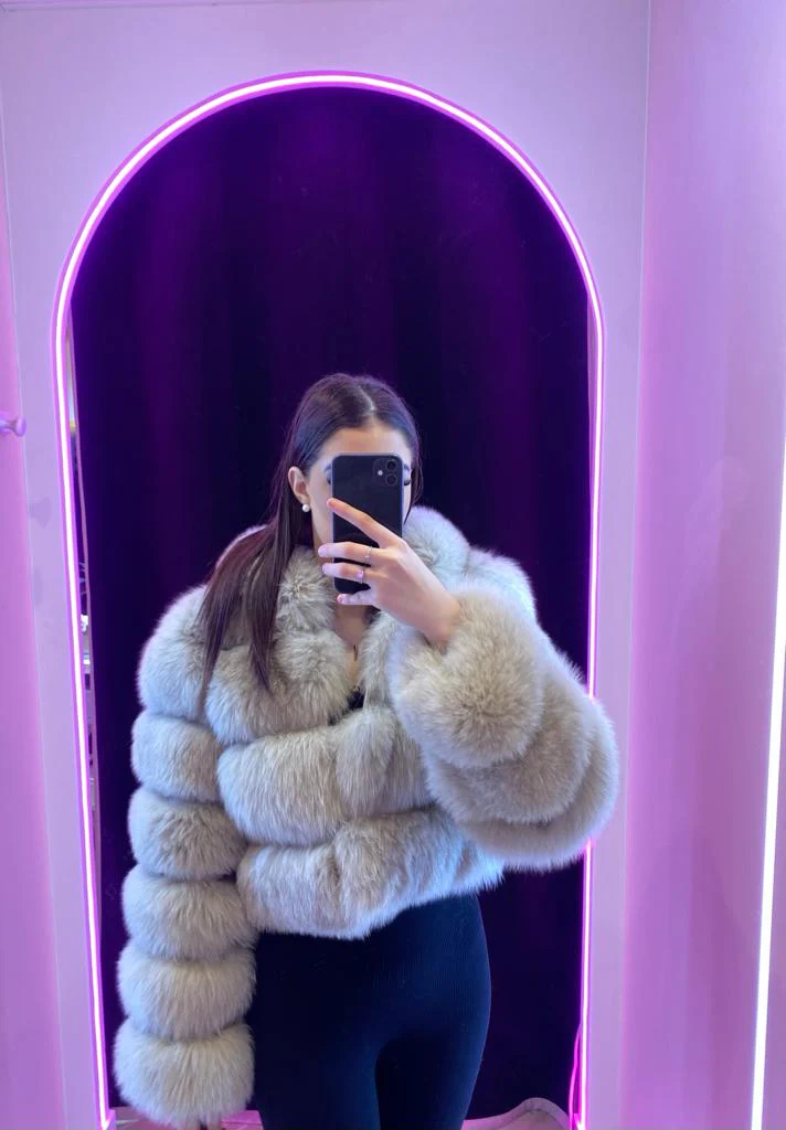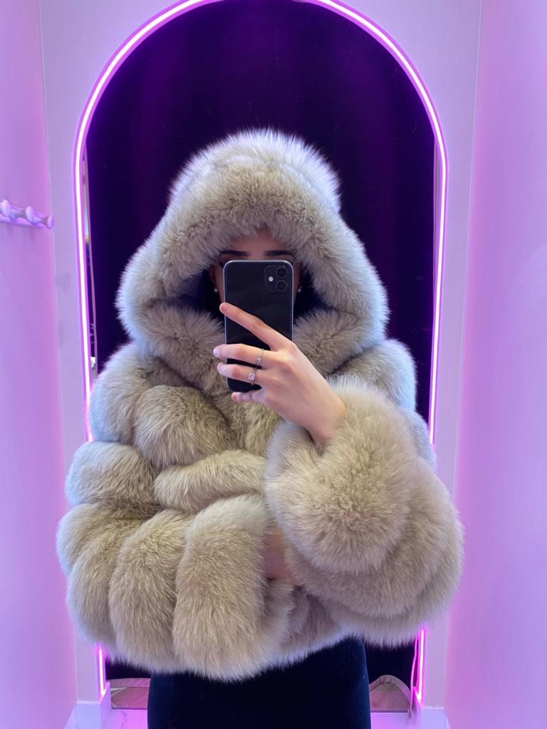 Fourrure de luxe cuir renard La Fourrre Léana à capuche est une pièce de luxe en fourrure renard de haute qualité. Sa tête et manches en cuir doux offrent une sensation de luxe et un port confortable. Soyez confiant et élégant avec ce mélange de qualité et de style.