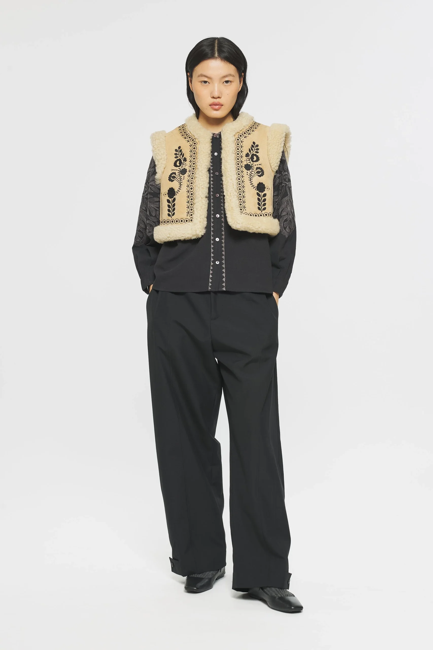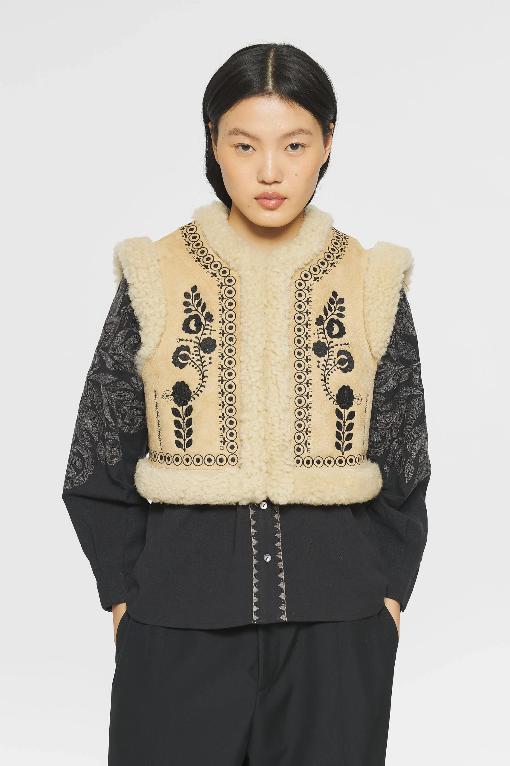 Gilet court sans manches en peau d’agneau retournée. Gilet réversible. Broderies sur le devant. Fermeture crochet.