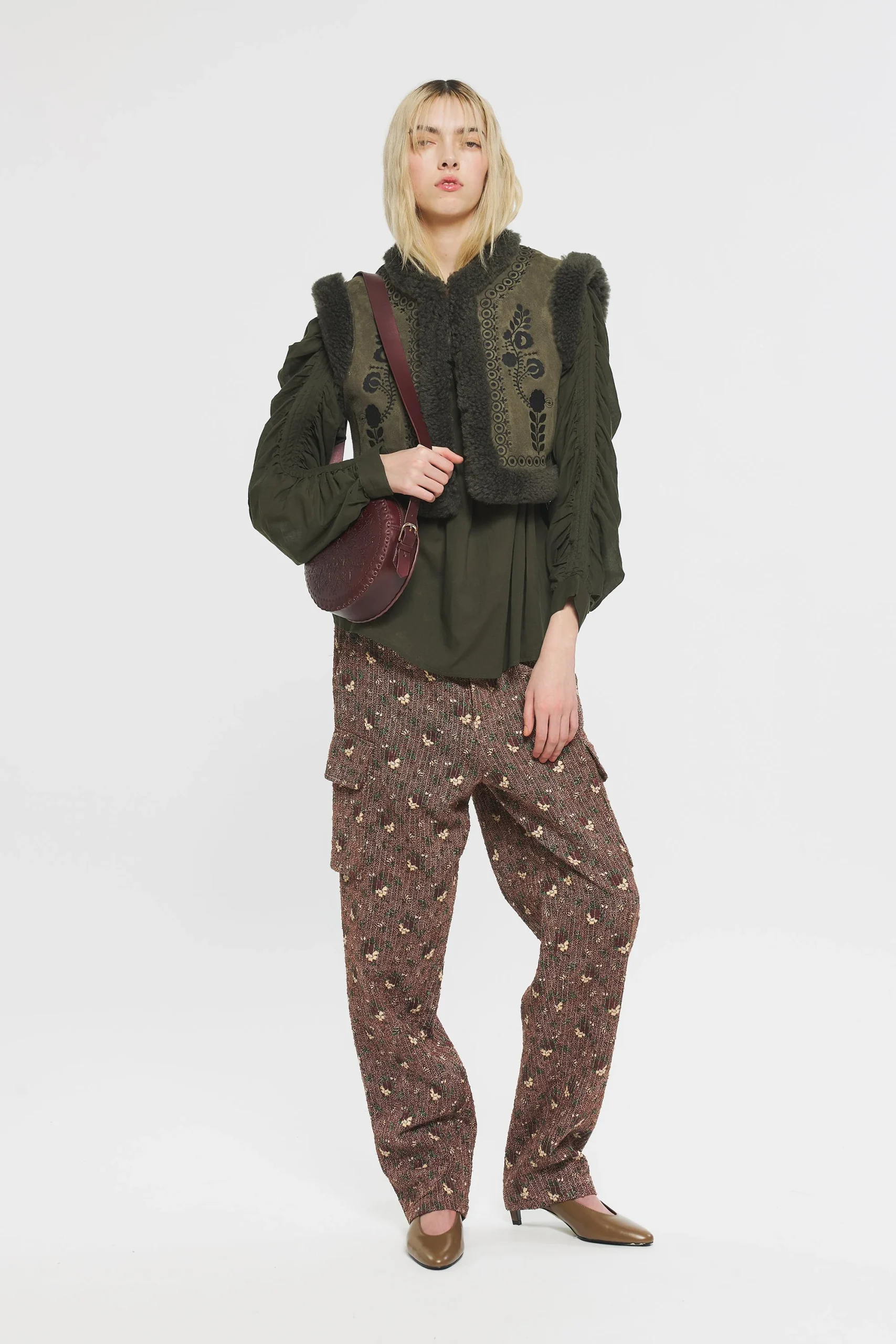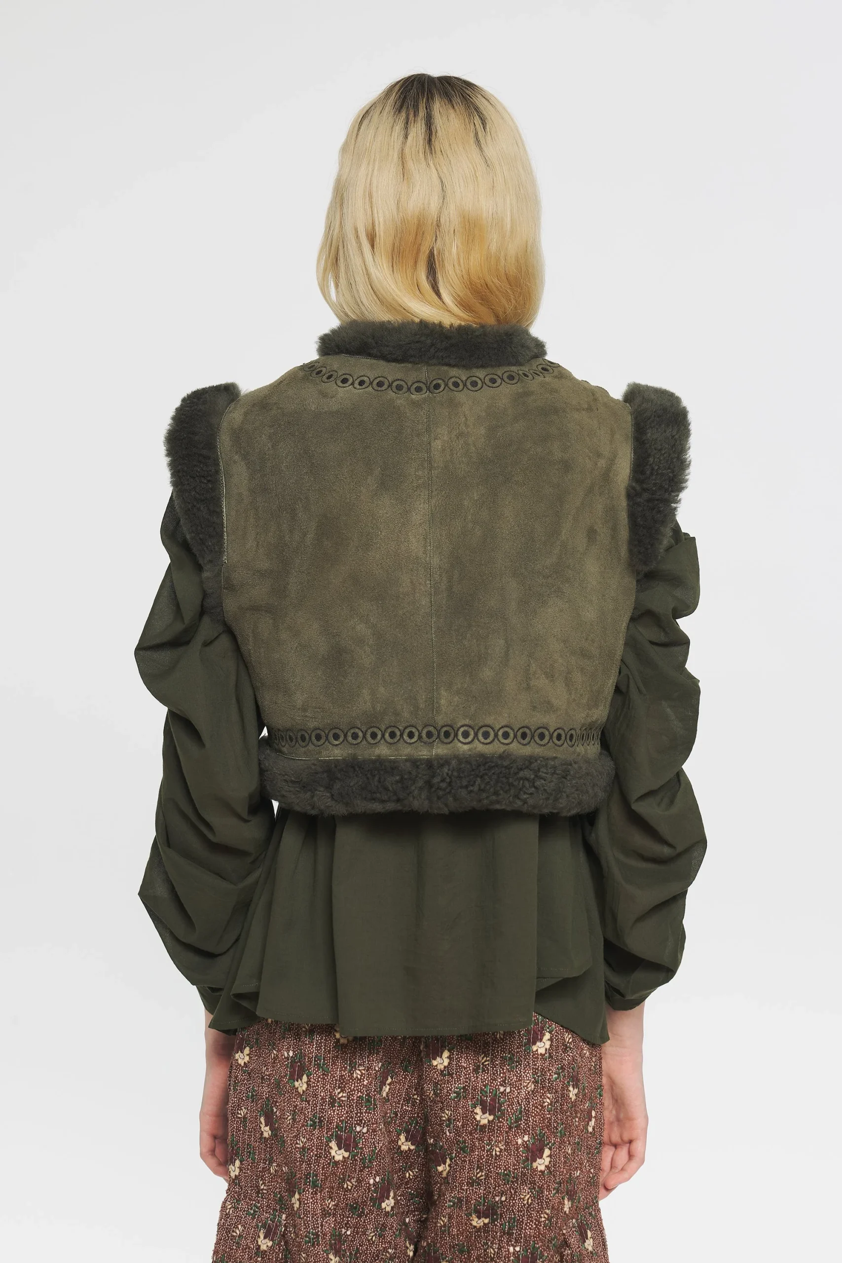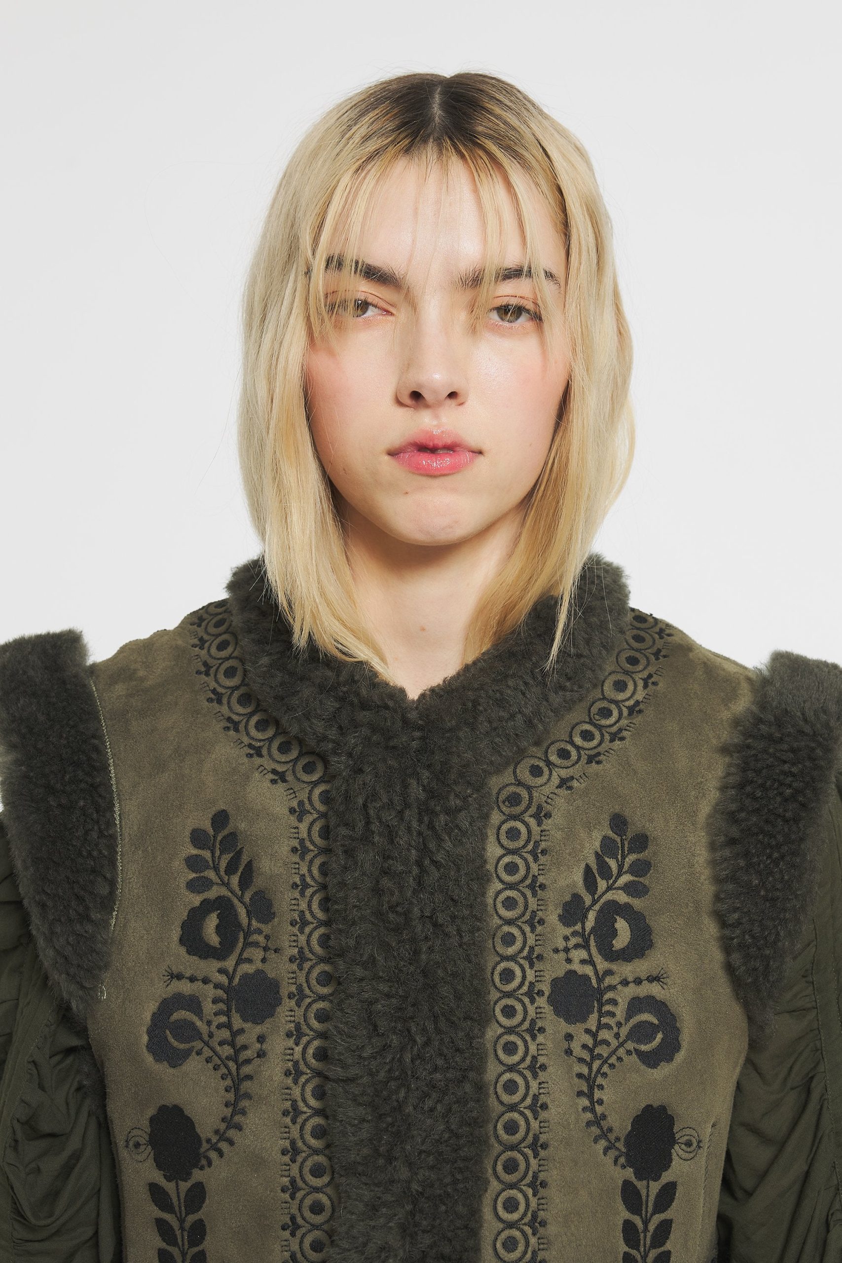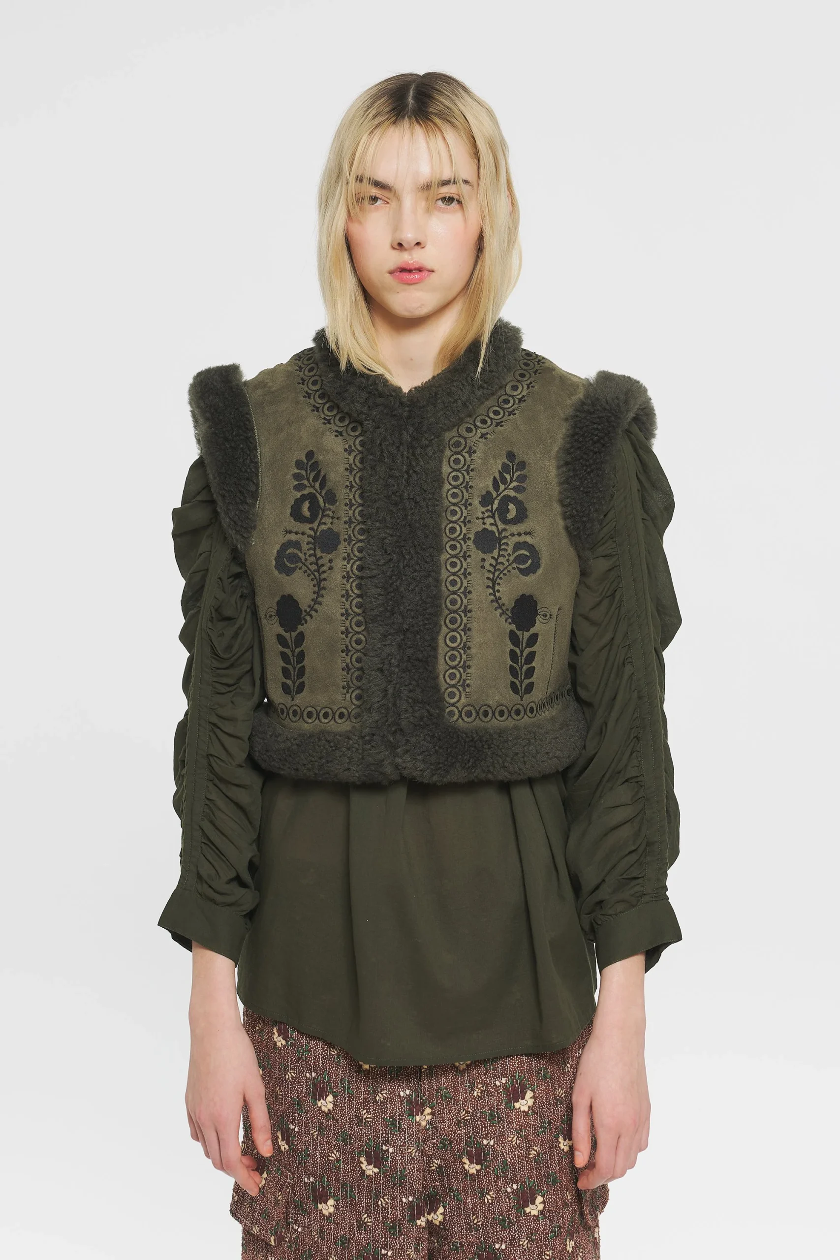 Gilet court sans manches en peau d’agneau retournée. Gilet réversible. Broderies sur le devant. Fermeture crochet.