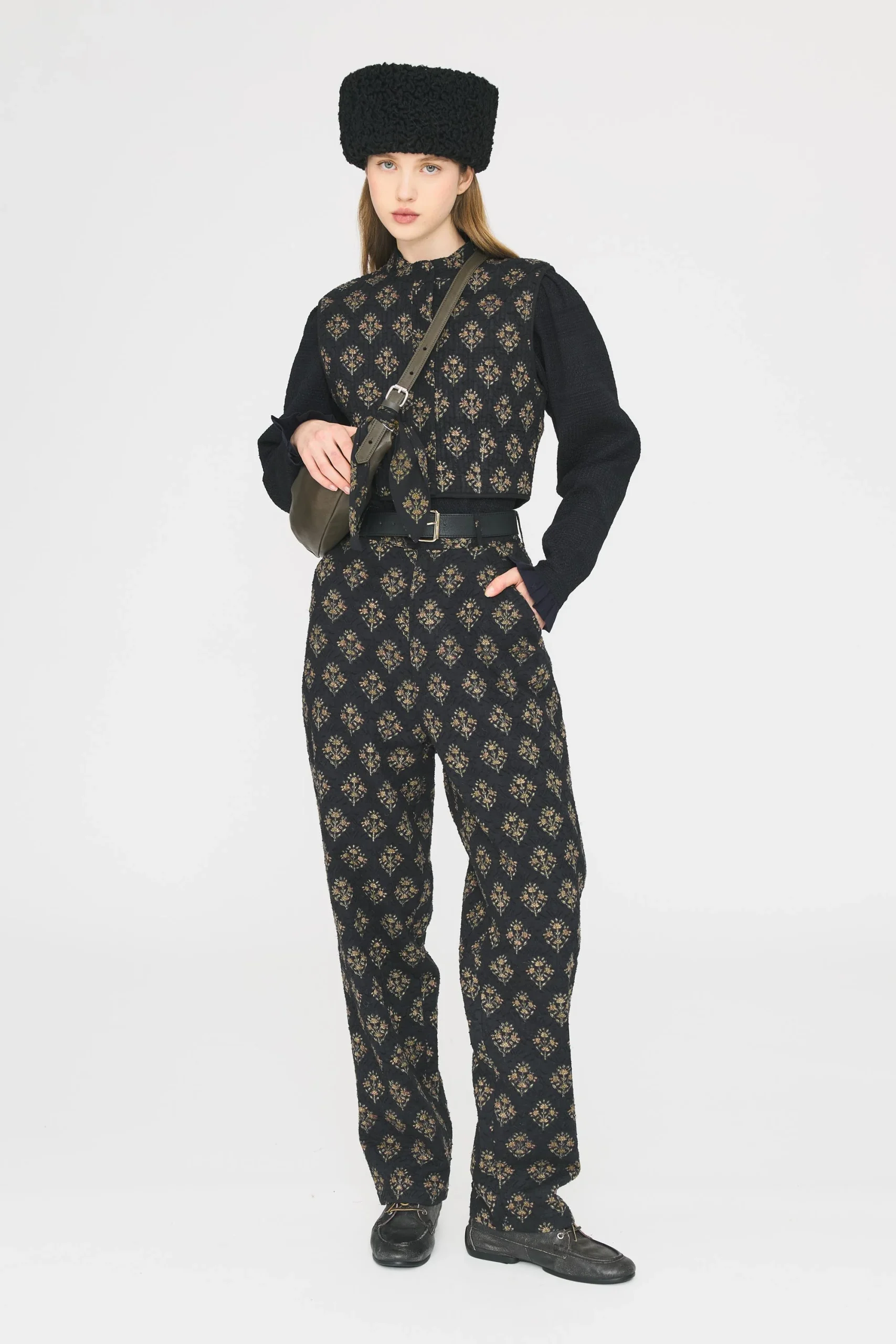 Petit gilet sans manches en jacquard de coton quilté et surpiqué. Patte de boutonnage invisible. Doublure en coton.