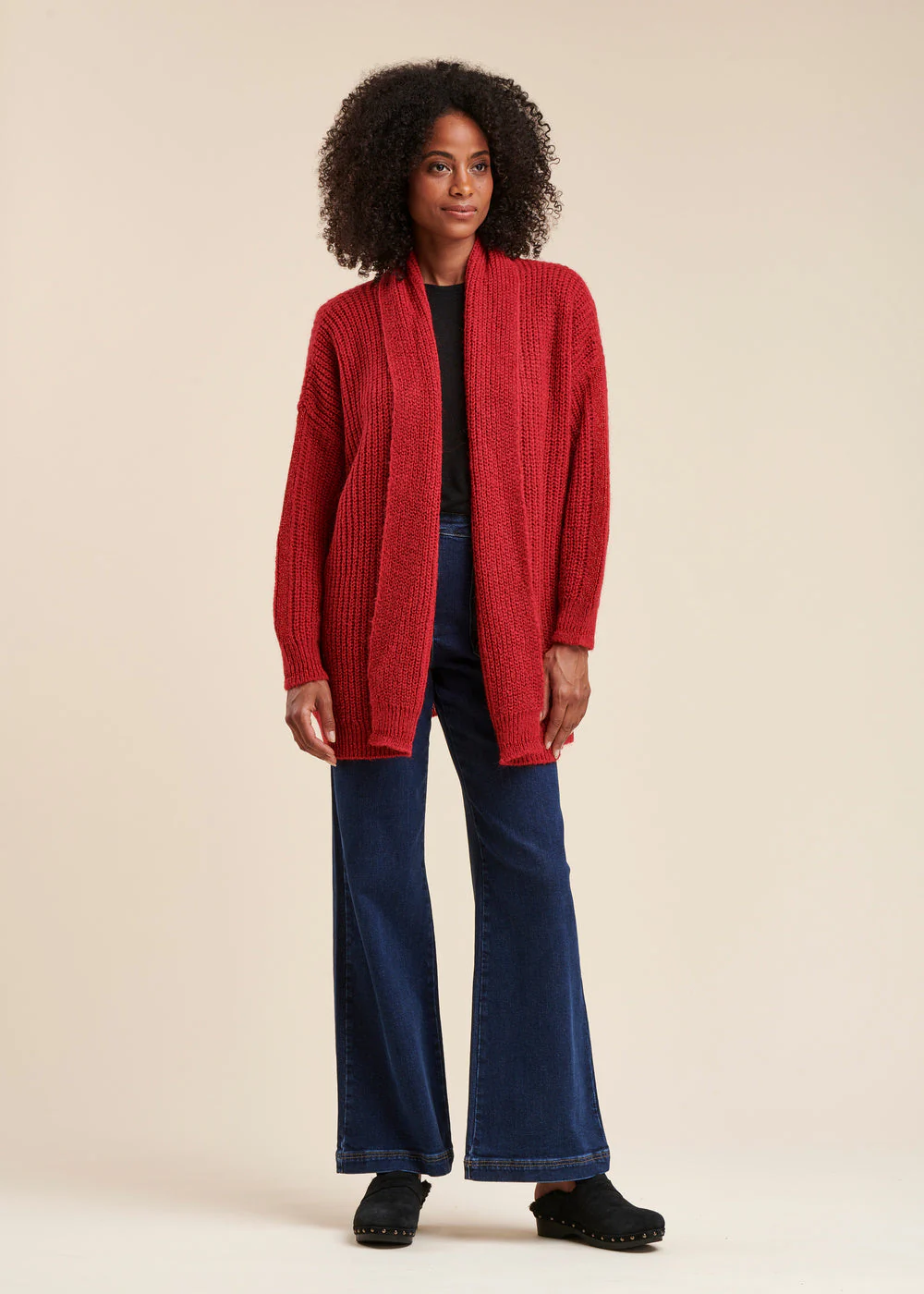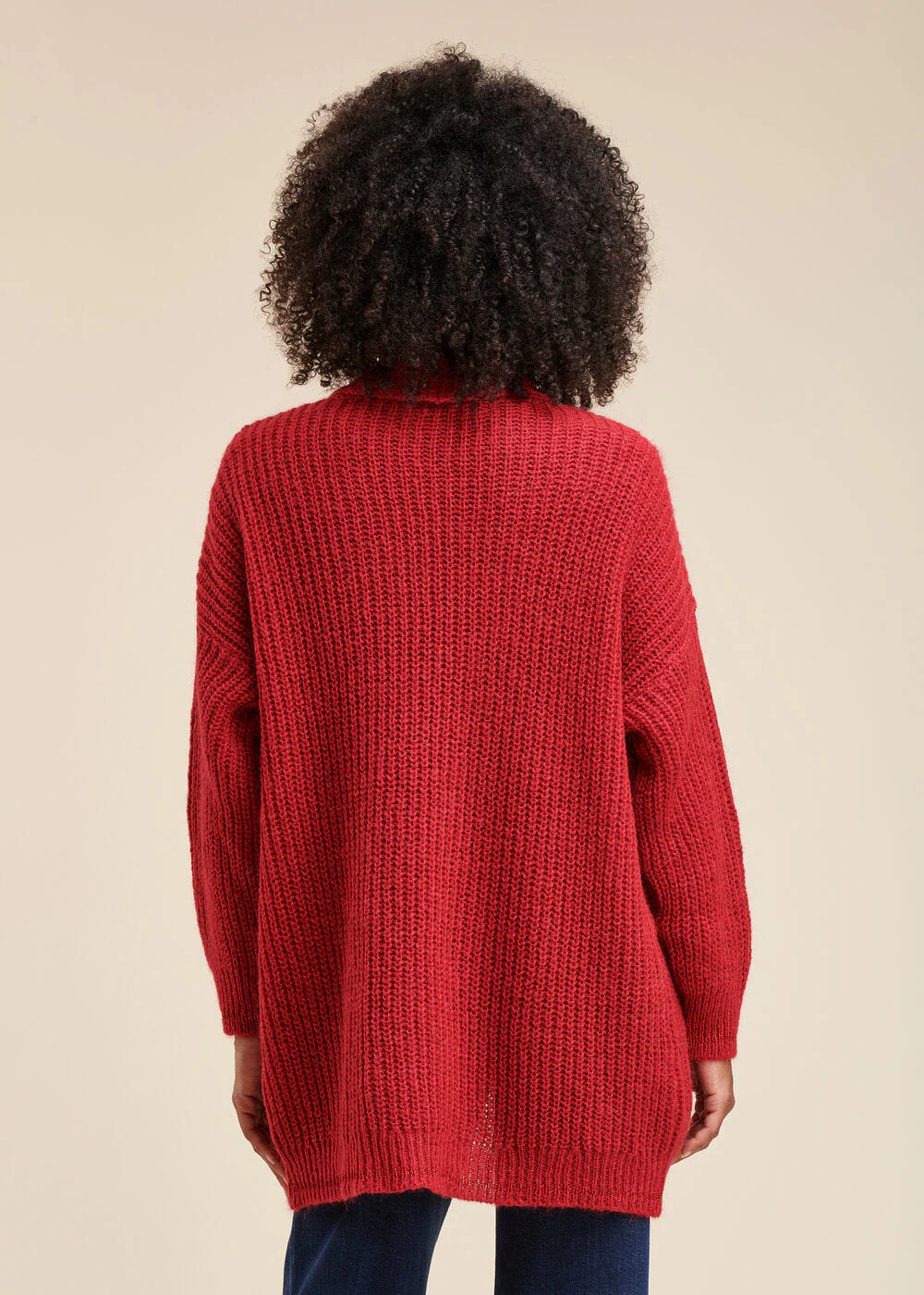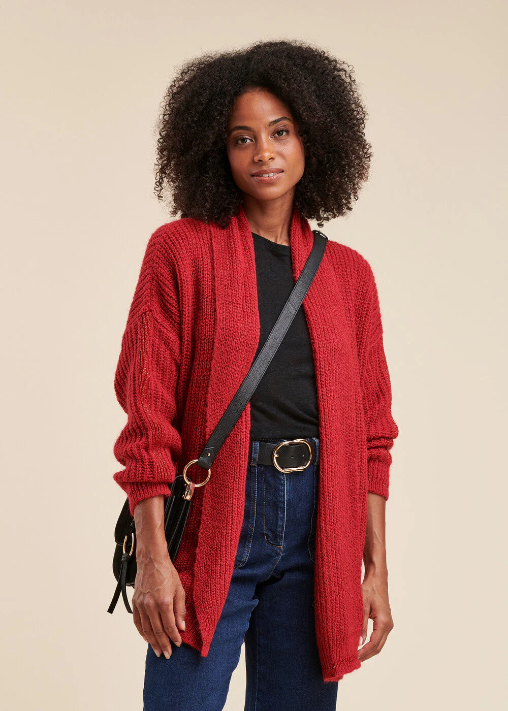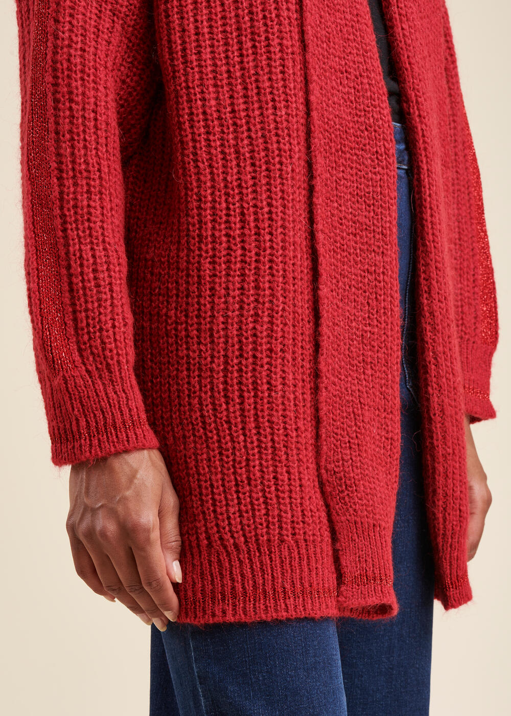 Gilet ouvert, col châle enveloppant, coupe ample. Maille côtes perlées et détails de maille irisée sur les manches.
