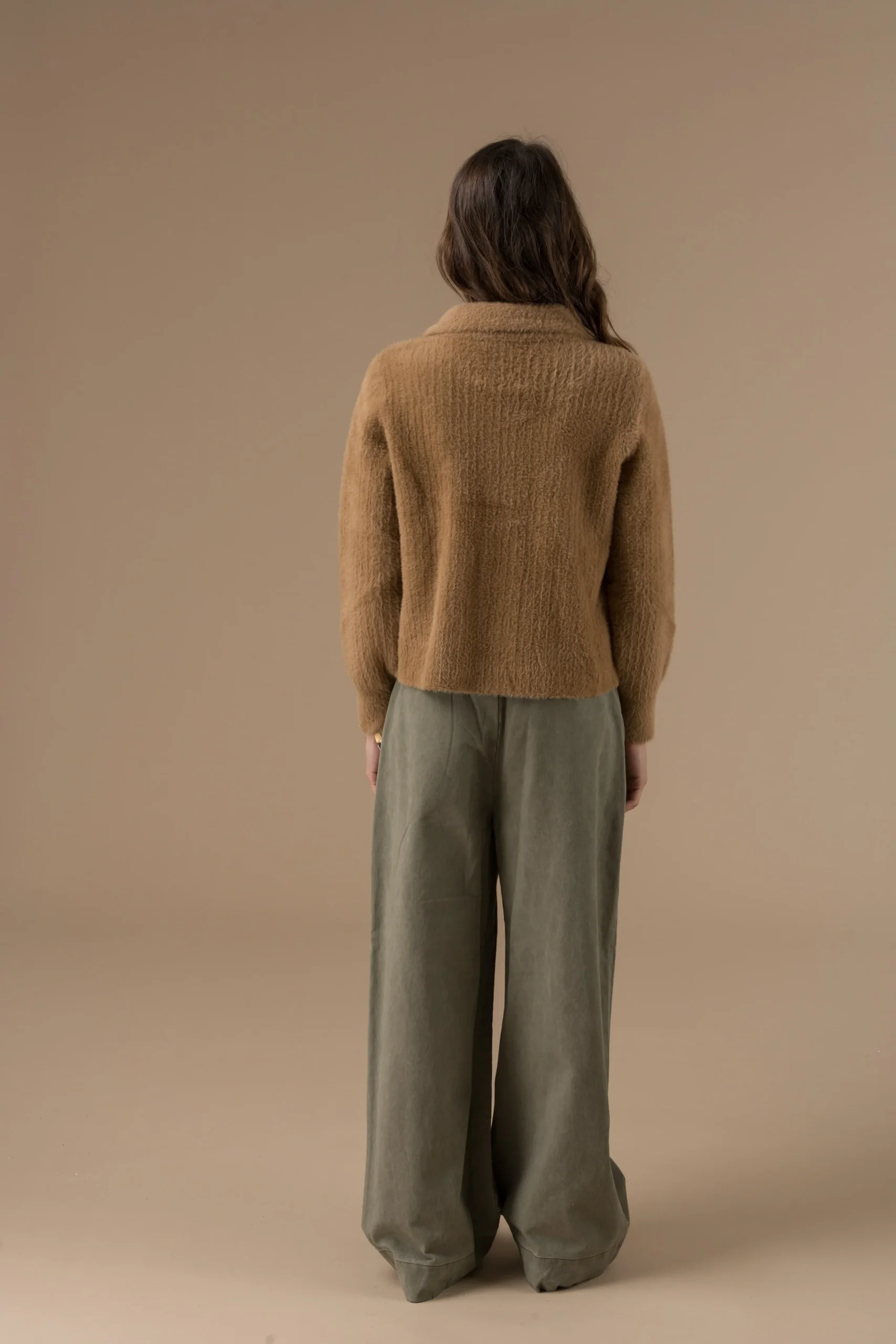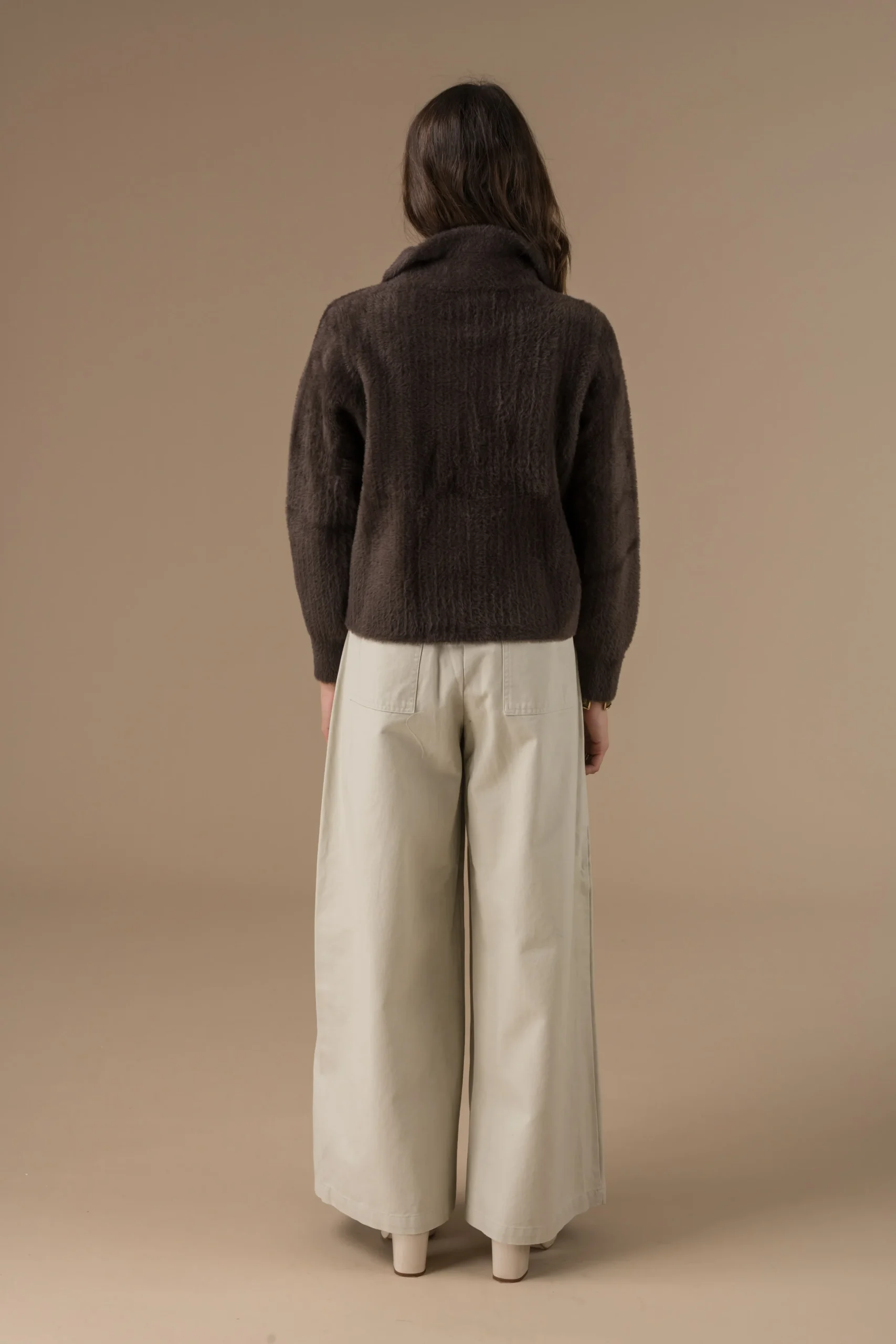 Ce modèle tire son caractère de ses détails de conception bien pensés. Sa coupe courte est particulièrement actuelle et flatteuse, permettant de souligner la taille et de se marier parfaitement avec des pantalons ou des jupes à taille haute. L’ajout d’un col chemise apporte une touche de structure inattendue, contrastant avec la souplesse de la maille et offrant une allure plus soignée qu’un simple gilet.