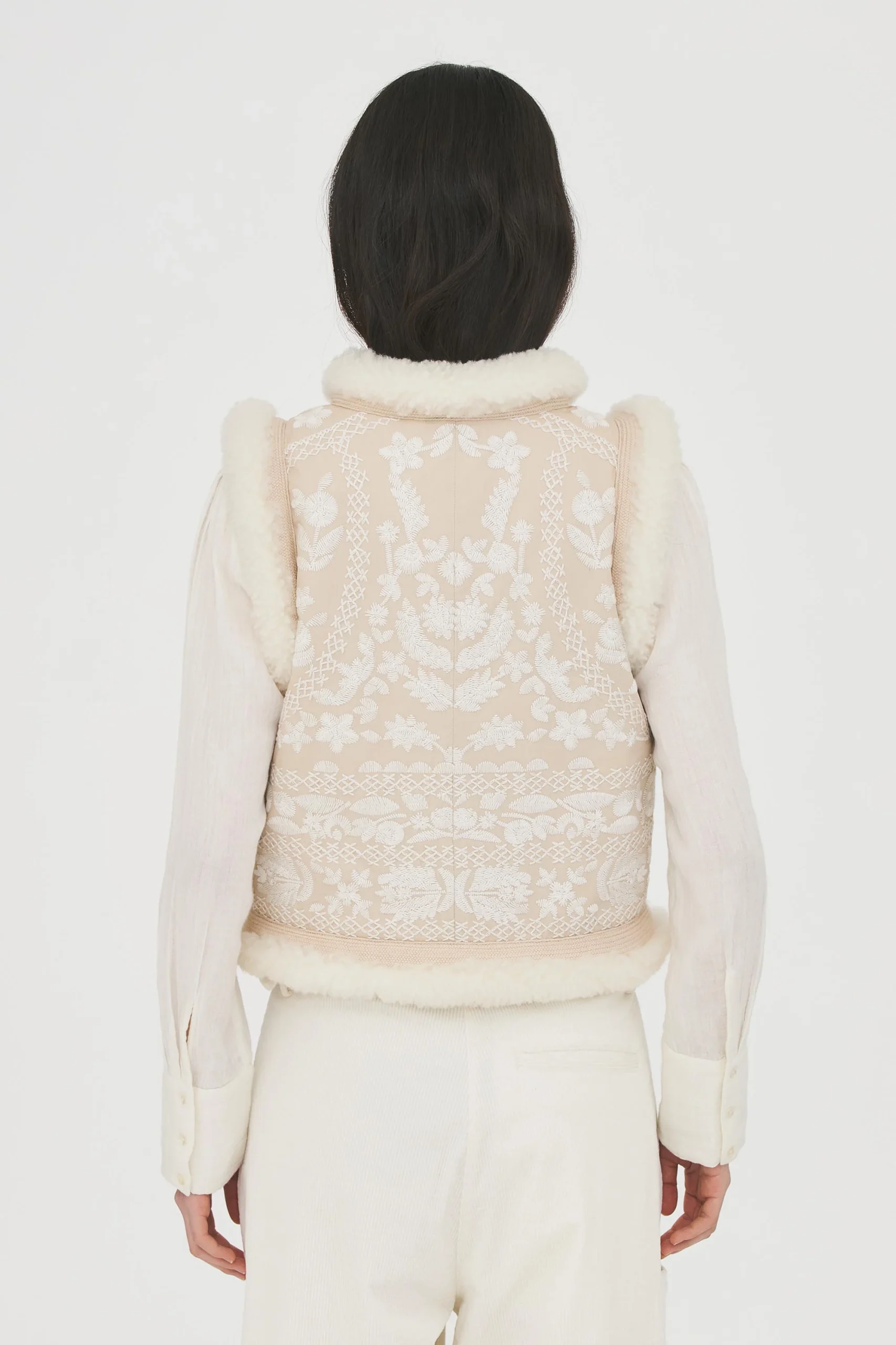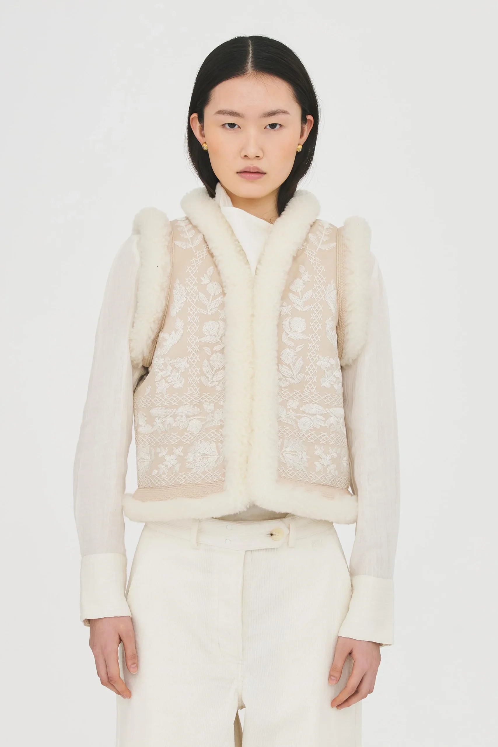 Gilet brodé sans manches d’inspiration afghane. Broderies florales artisanales sur l’ensemble du gilet. Finitions en fourrure d’agneau ton sur ton. Doublure ultra-douce. Fermeture crochets.