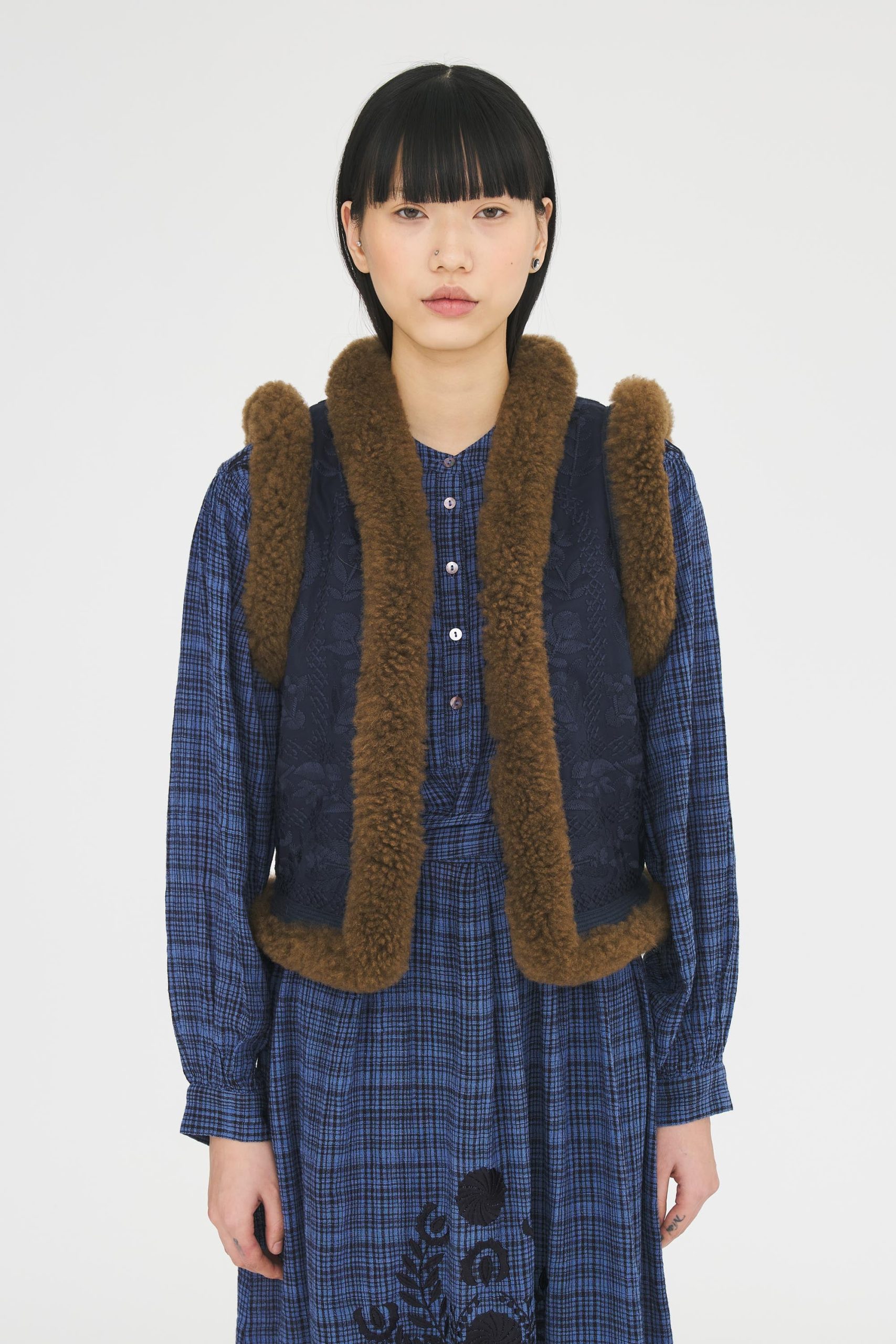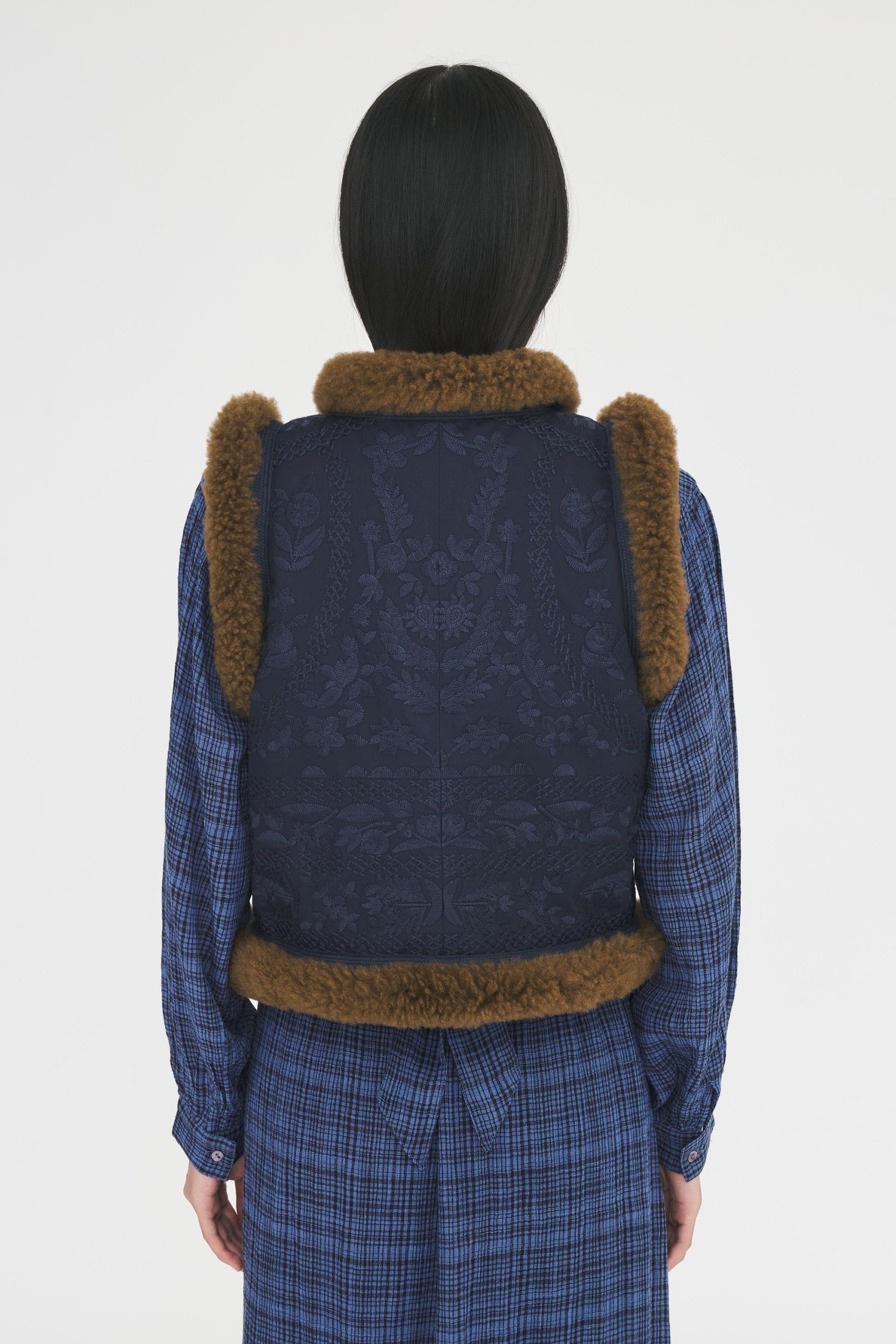 Gilet brodé sans manches d’inspiration afghane. Broderies florales artisanales sur l’ensemble du gilet. Finitions en fourrure d’agneau contrastant. Doublure ultra-douce. Fermeture crochets.