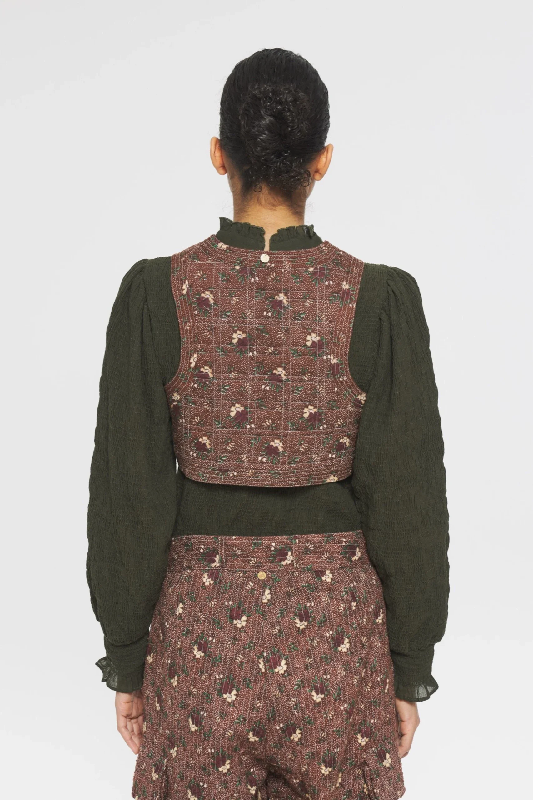 Gilet court en voile de coton imprimé quilté sans manche. Crochet en métal sur le devant pour refermer le gilet. Doublure en coton.