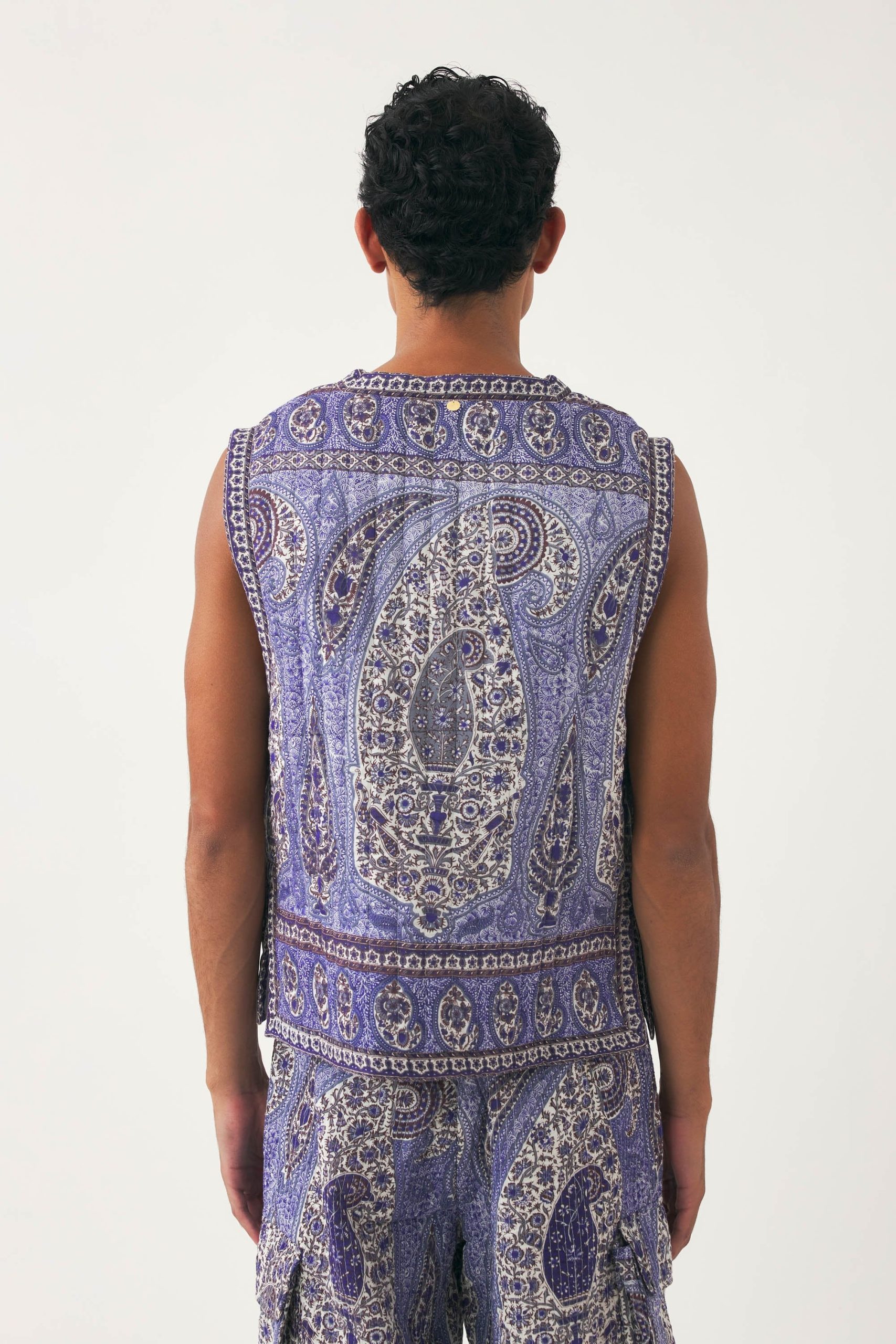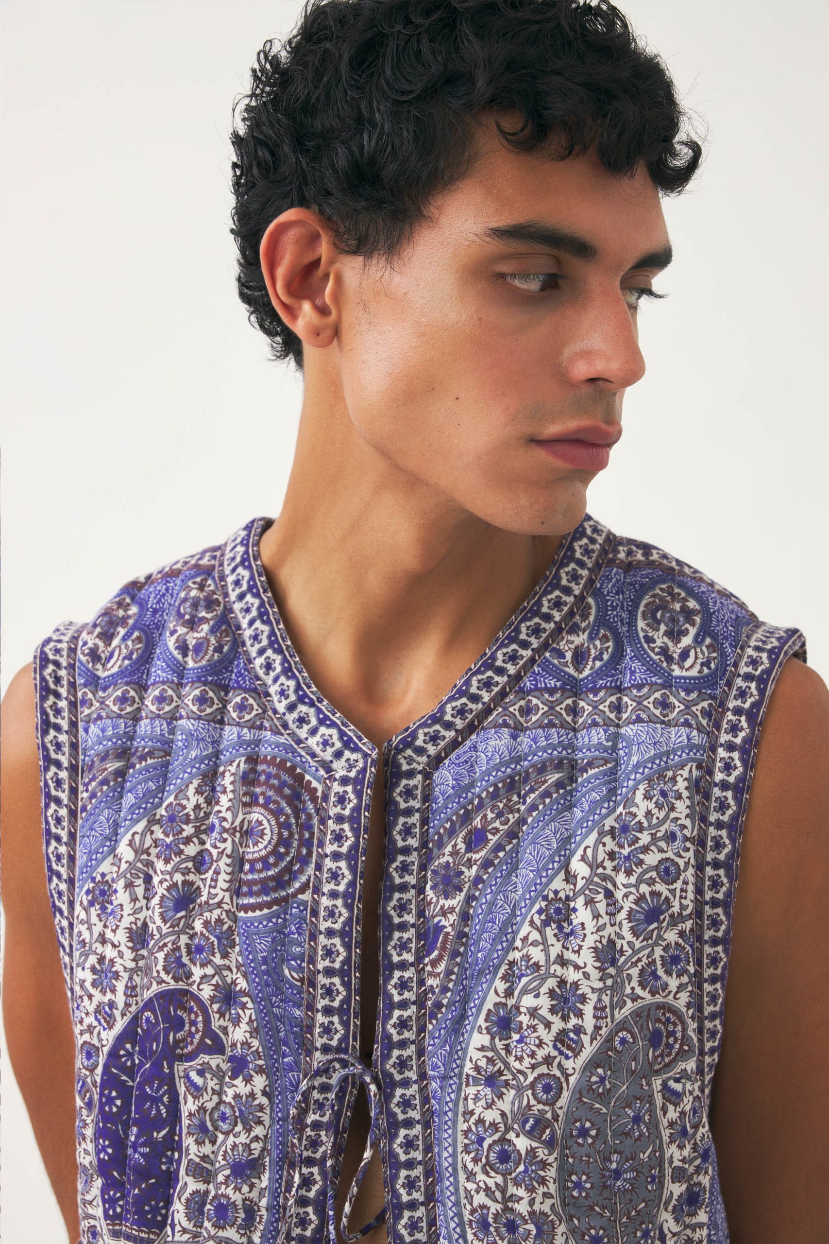 Gilet sans manches en voile de coton. Imprimé dessiné dans notre atelier parisien puis appliqué à la main sur le tissu selon la technique du block print (savoir-faire artisanal indien). Col rond.