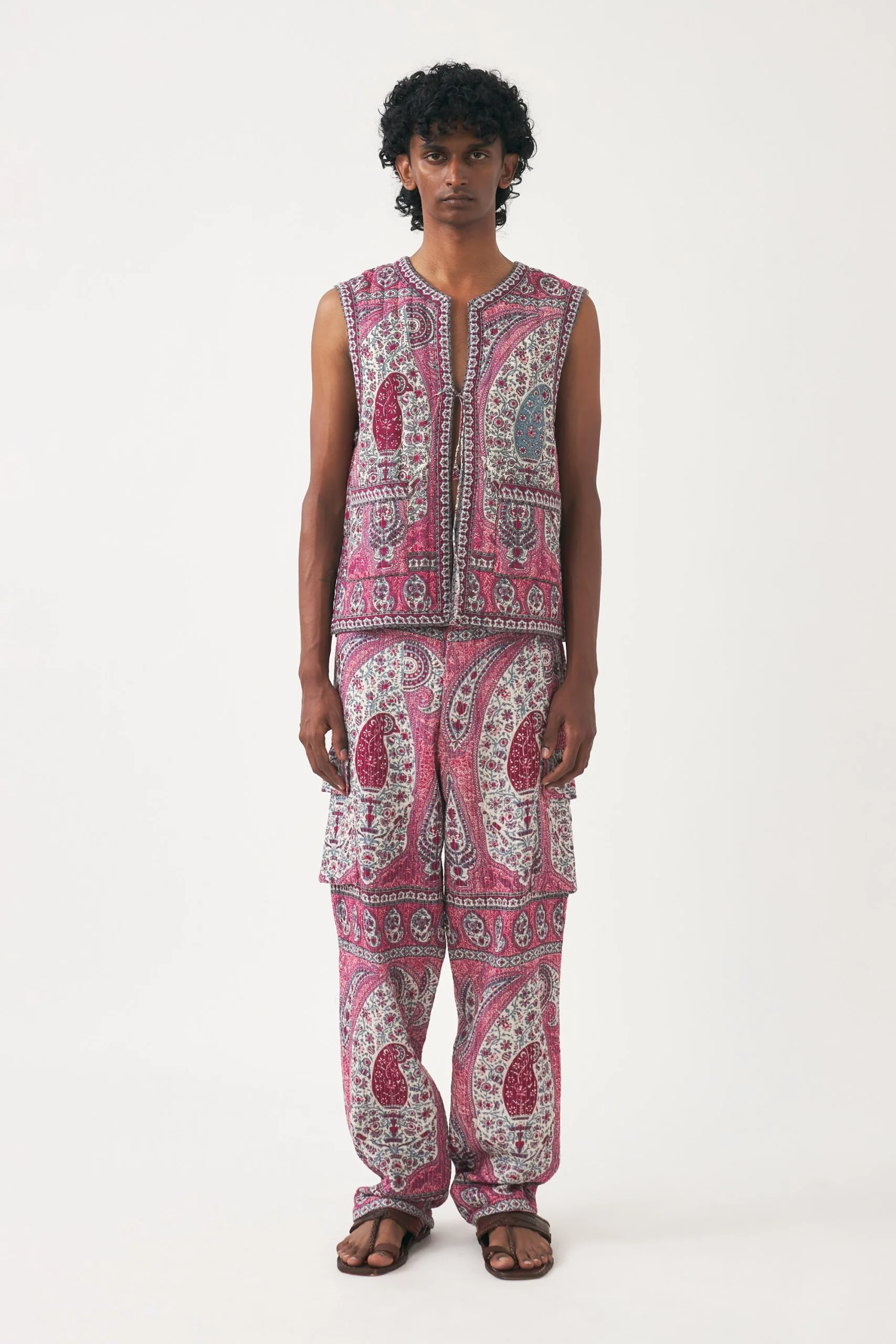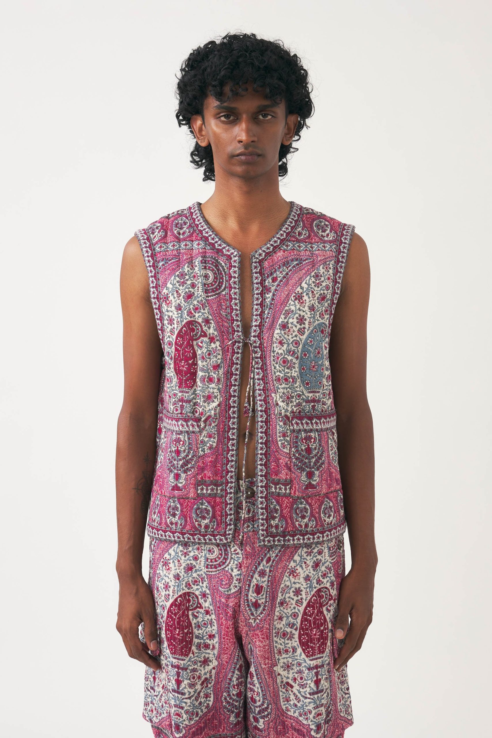 Gilet sans manches en voile de coton. Imprimé dessiné dans notre atelier parisien puis appliqué à la main sur le tissu selon la technique du block print (savoir-faire artisanal indien). Col rond.