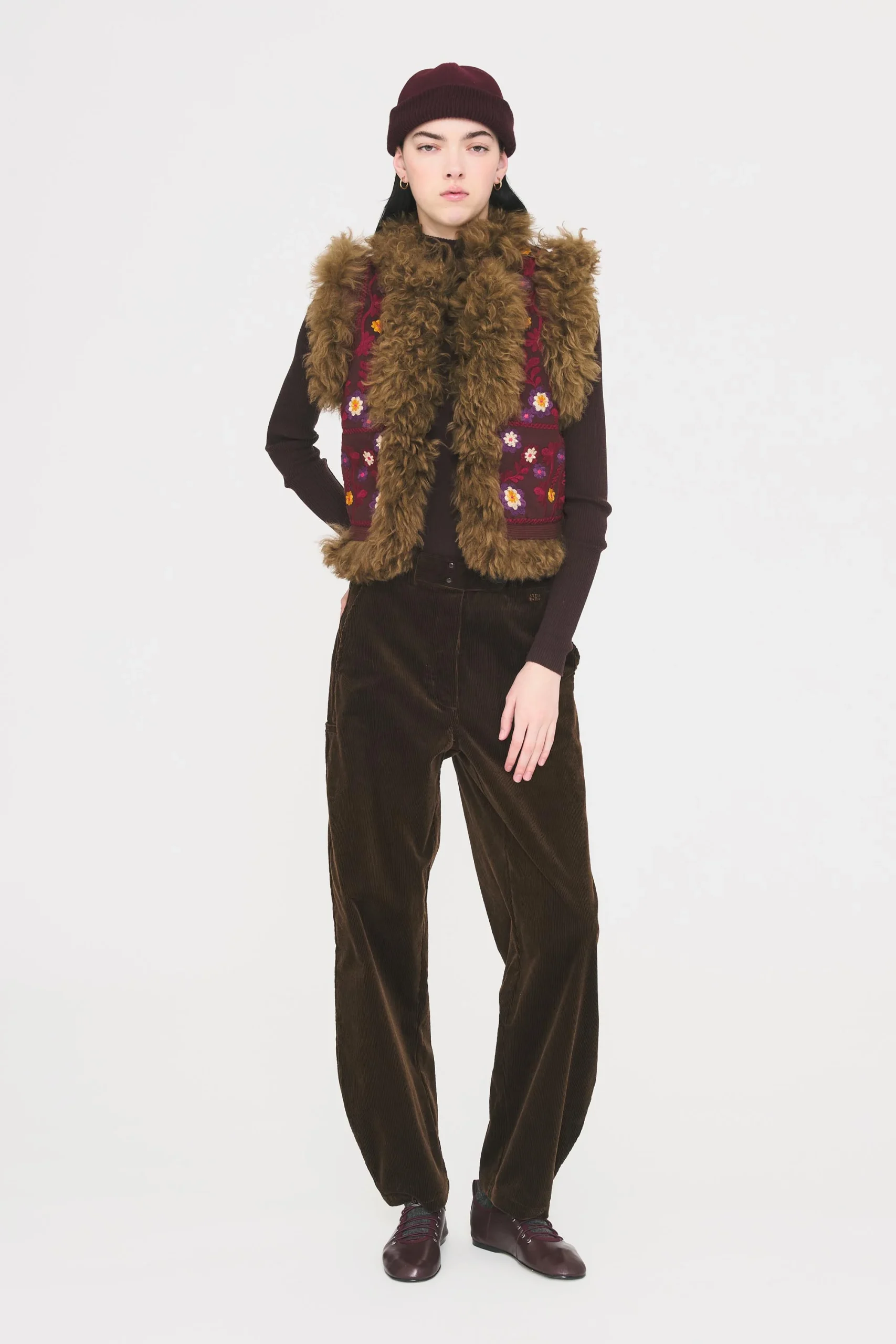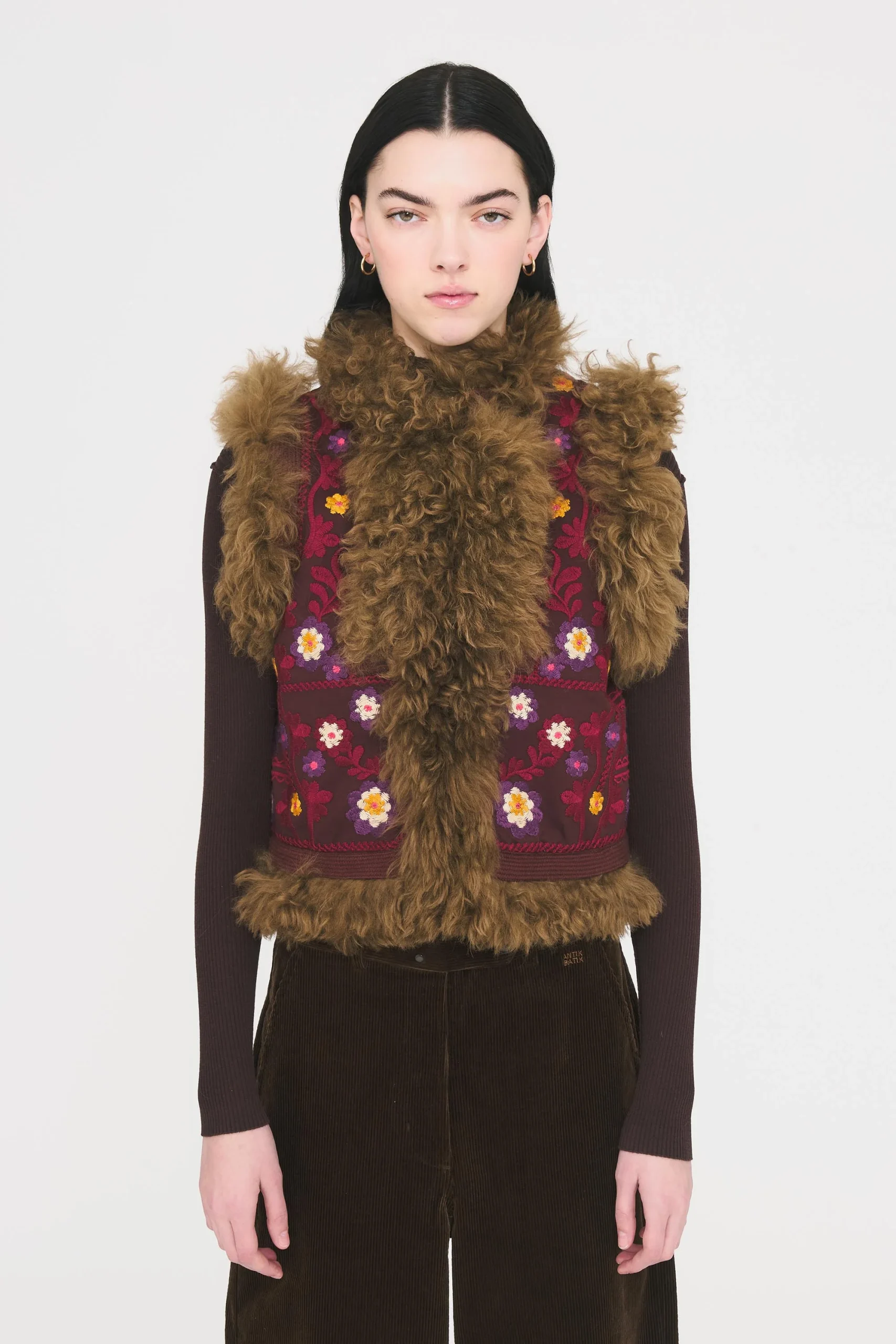Gilet brodé sans manches d’inspiration afghane. Broderies florales artisanales sur l’ensemble du gilet. Finitions en fourrure d’agneau contrastant. Doublure ultra-douce. Fermeture crochets.