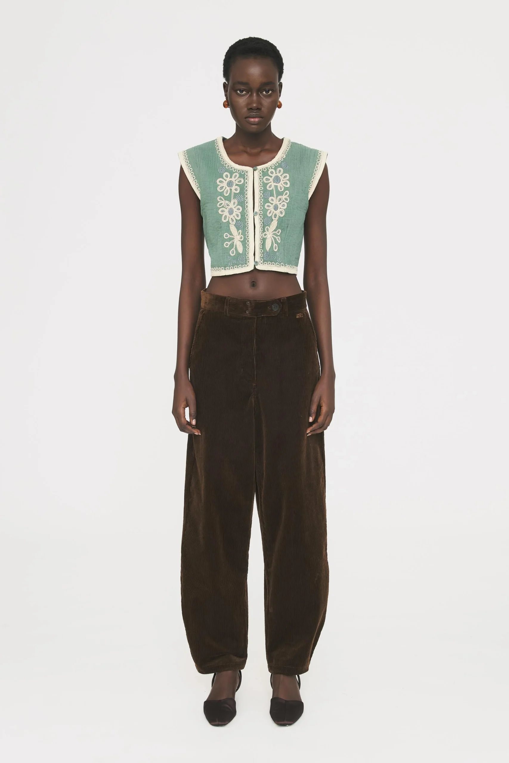 Gilet court sans manches brodée fils lurex artisanalement. Galon en coton appliqué au col, patte de boutonnage, sur le devant et aux emmanchures. Fermeture bouton. Doublé.
