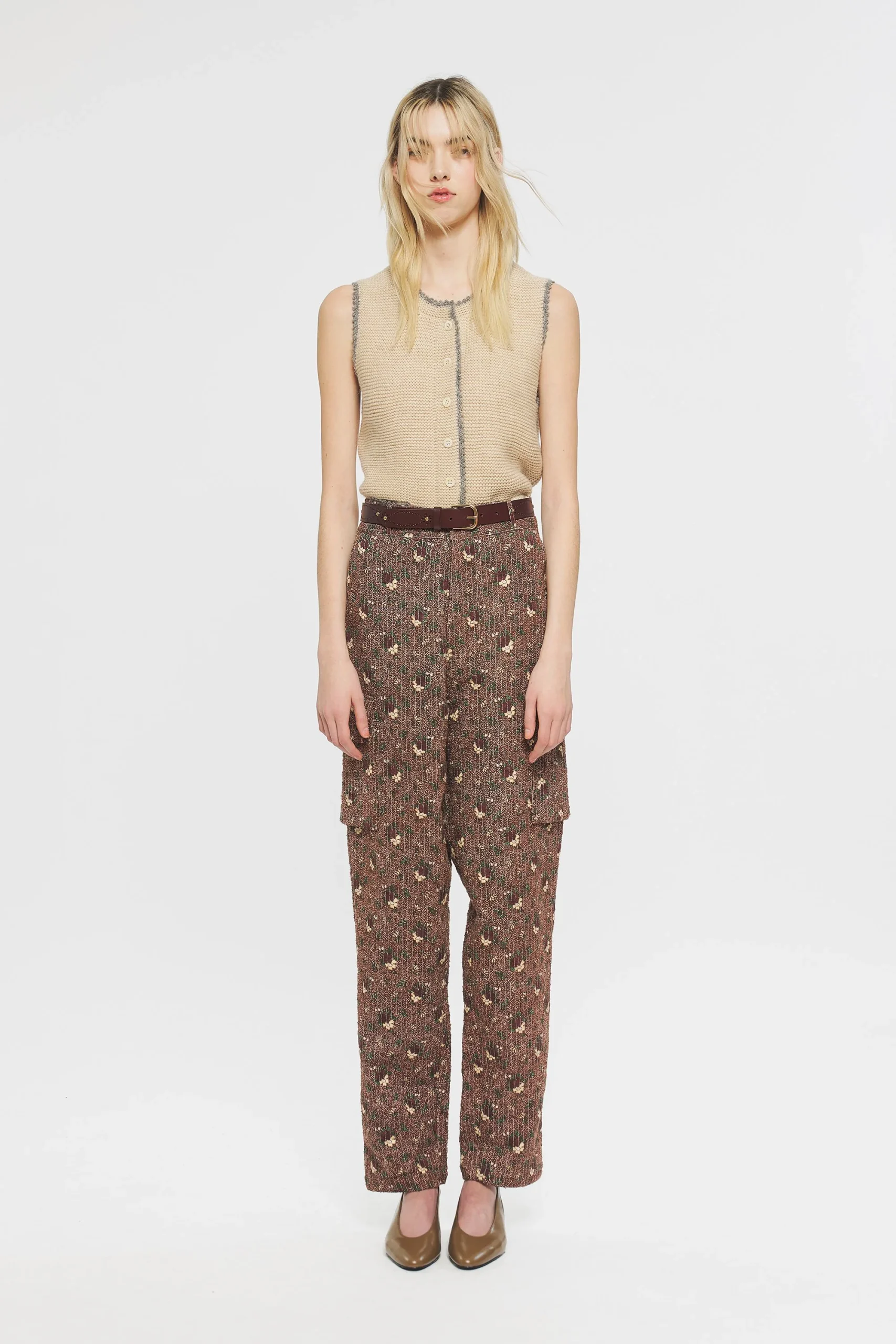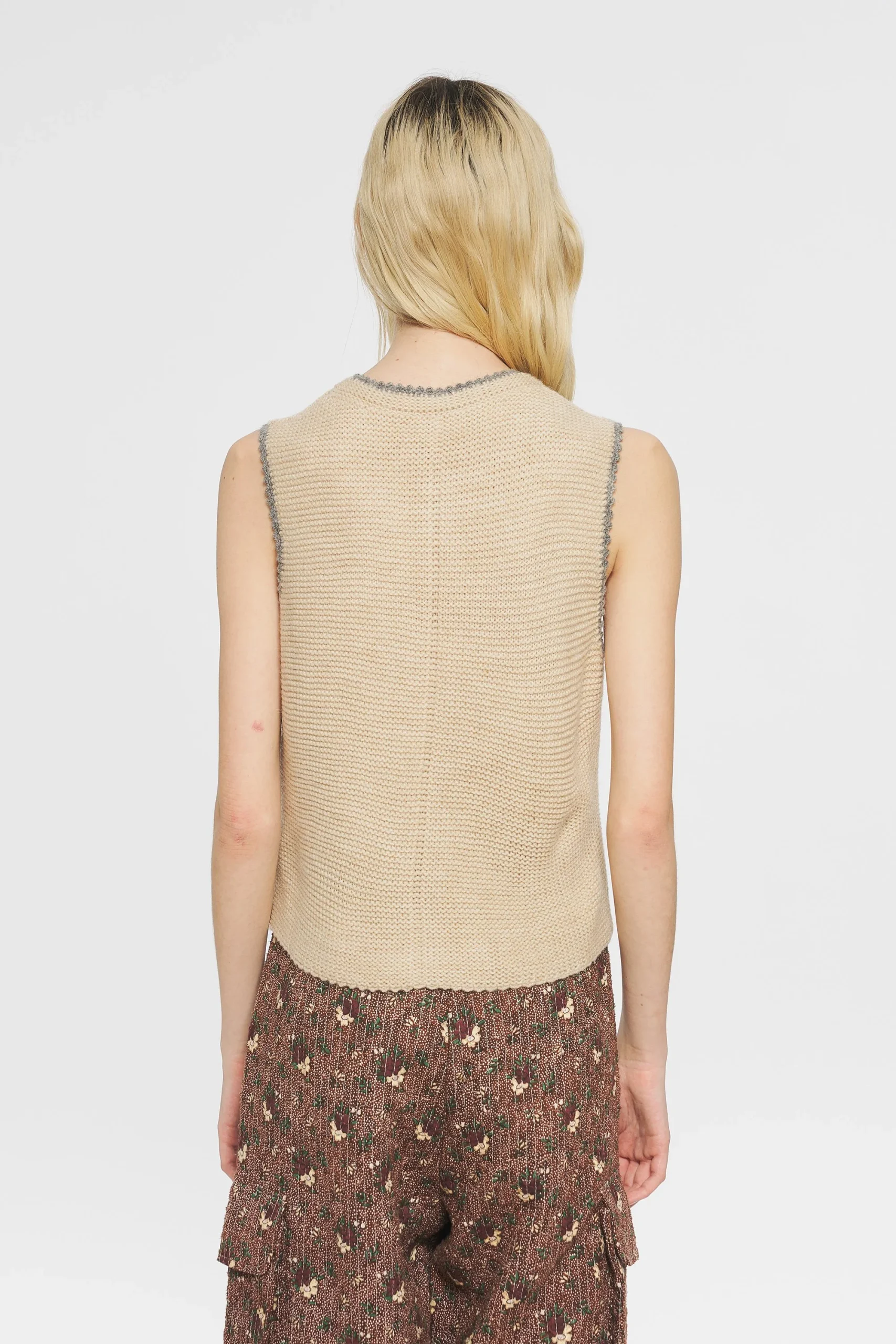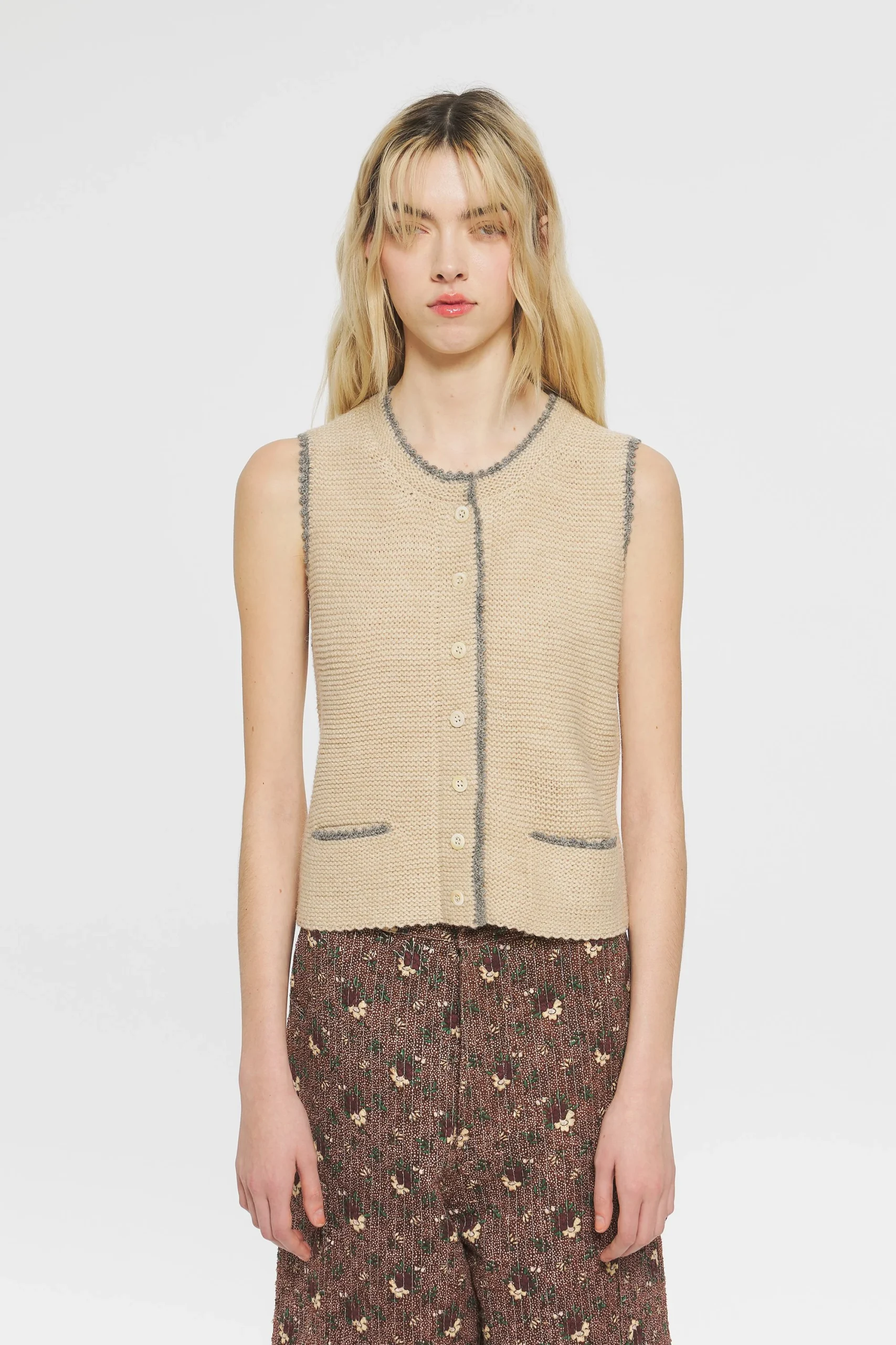 Gilet en laine d’alpaga tricoté à la main. Col rond. Patte de boutonnage sur le devant. Mini poches latérales sur le devant.