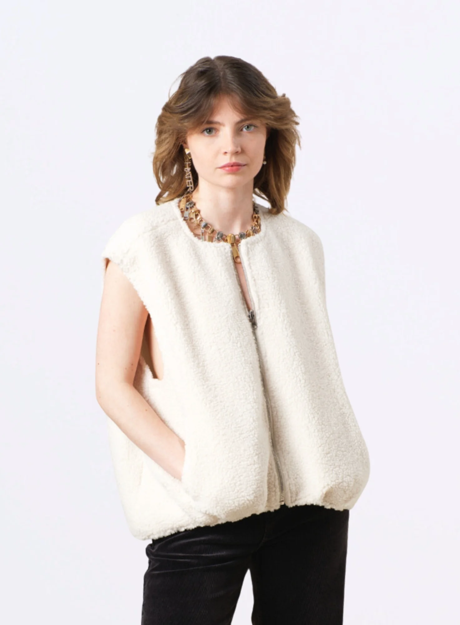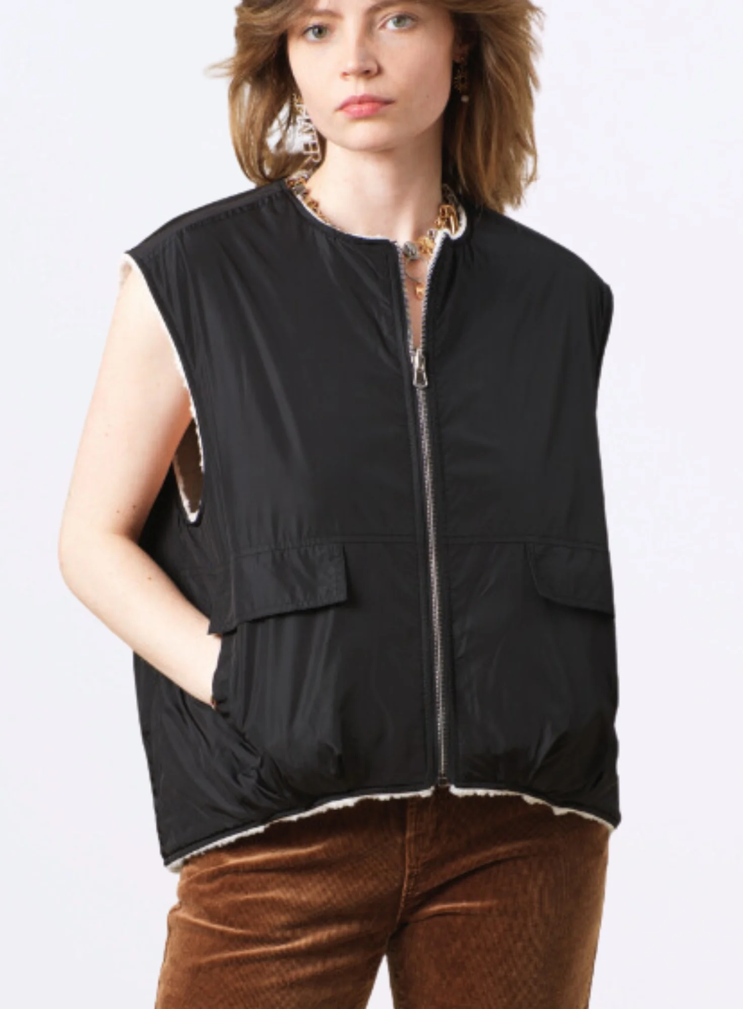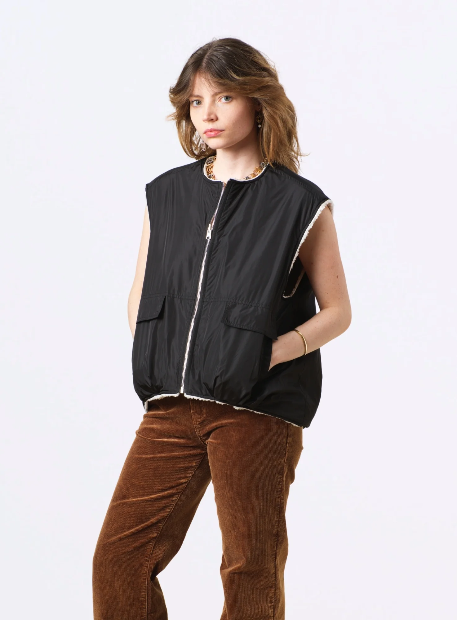 Ce gilet est doté de poches doubles à l’avant, idéales pour garder vos petites affaires à portée de main tout en ajoutant une note fonctionnelle à votre tenue. La fermeture éclair sur le devant permet une mise en place rapide et facile, rendant ce vêtement aussi pratique que stylé.