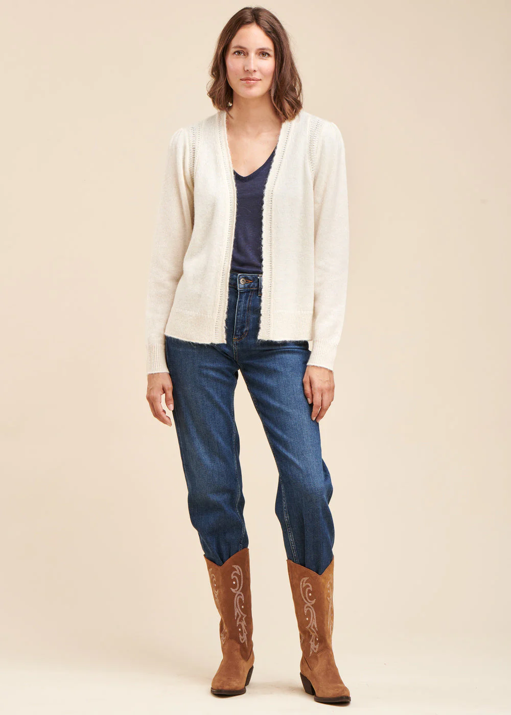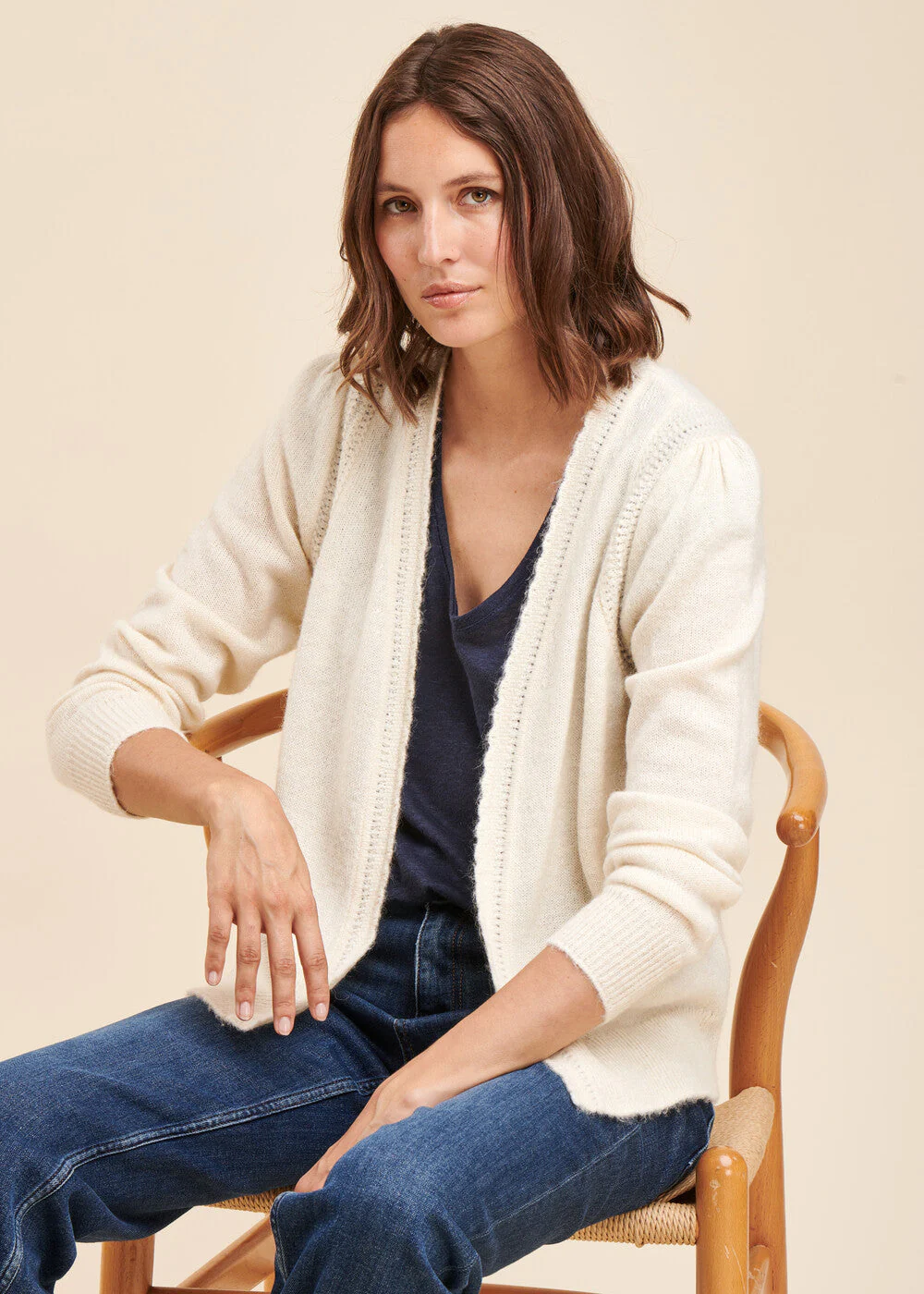 Gilet sans boutonnage, détail points fantaisie autour emmanchures, manches longues, finitions bord-côte bas corps et bas manches. Modèle écoresponsable en polyamide recyclé.