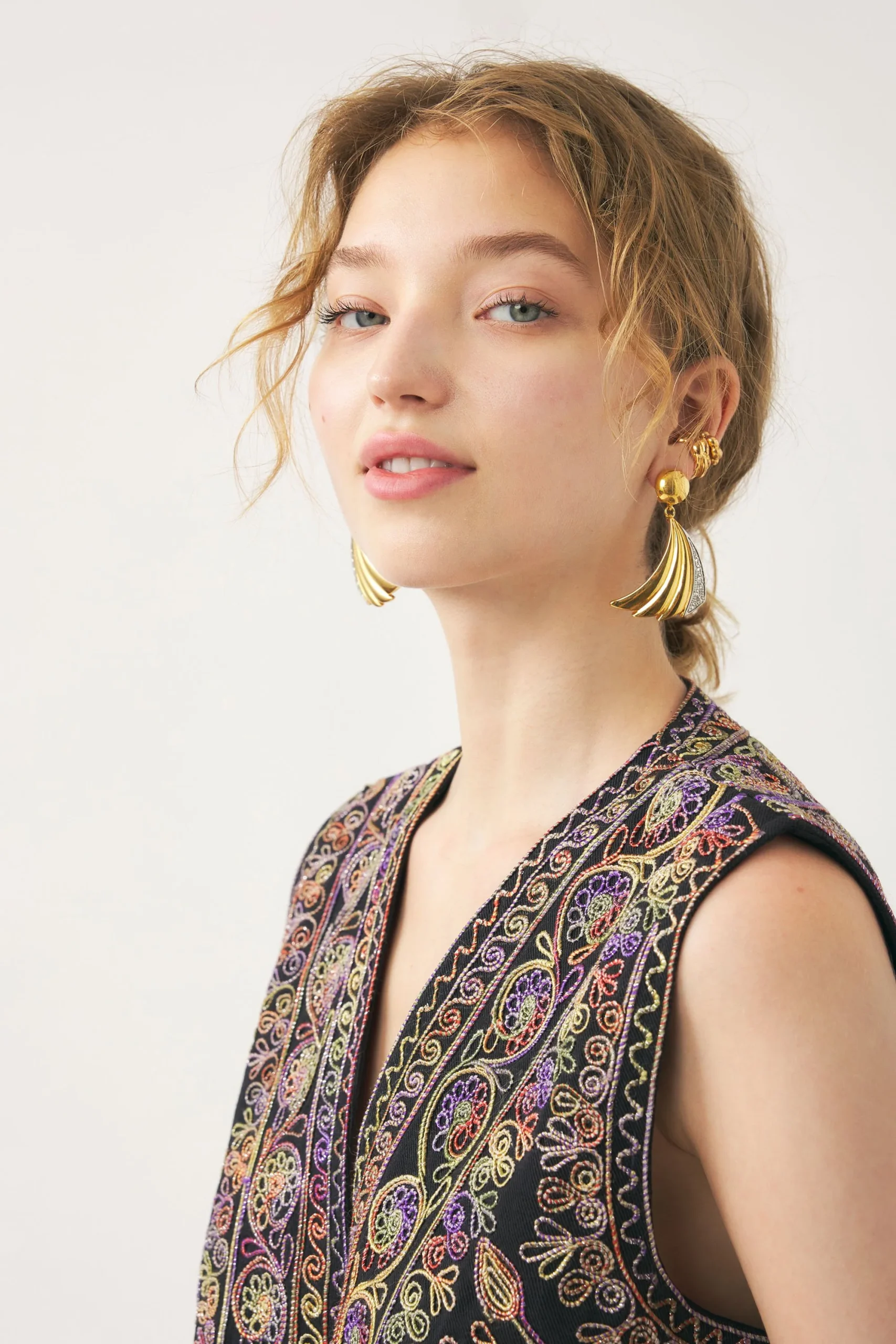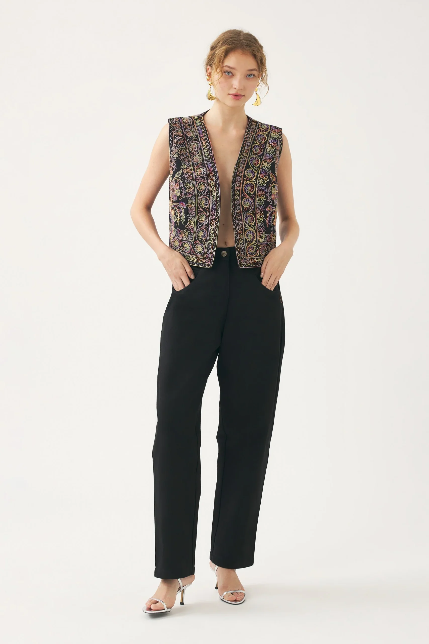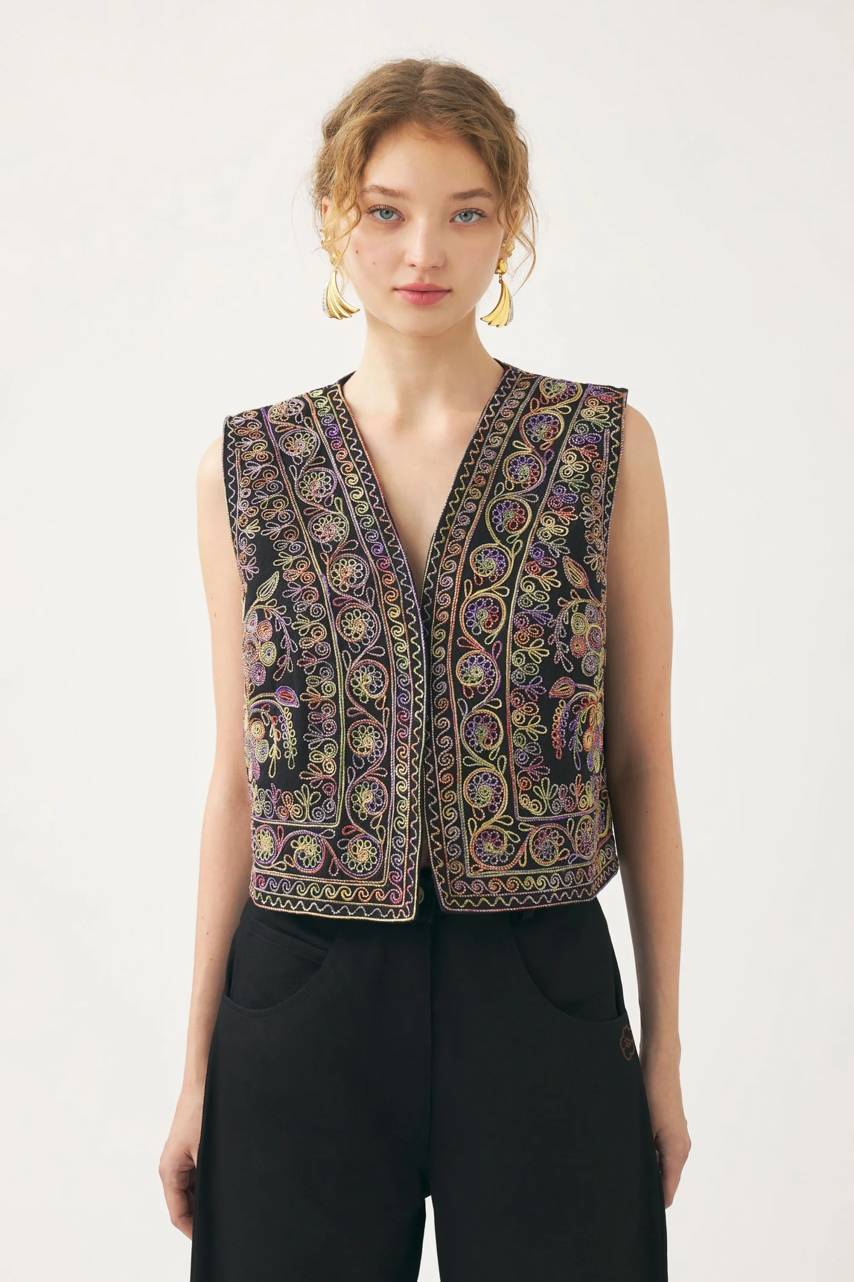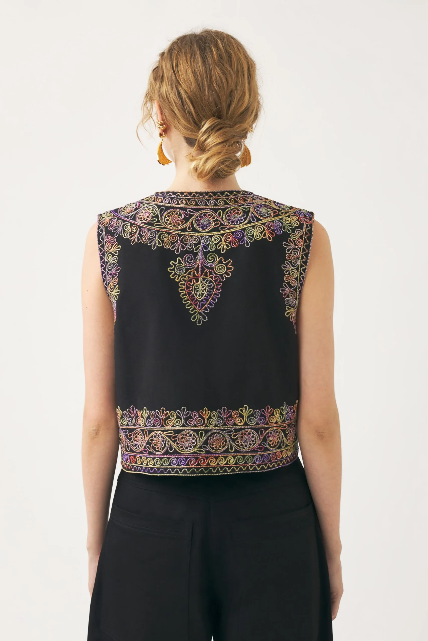 Gilet brodé en coton twill. Broderies faites main en coton tie and dye sur toute la surface. Doublure en coton.