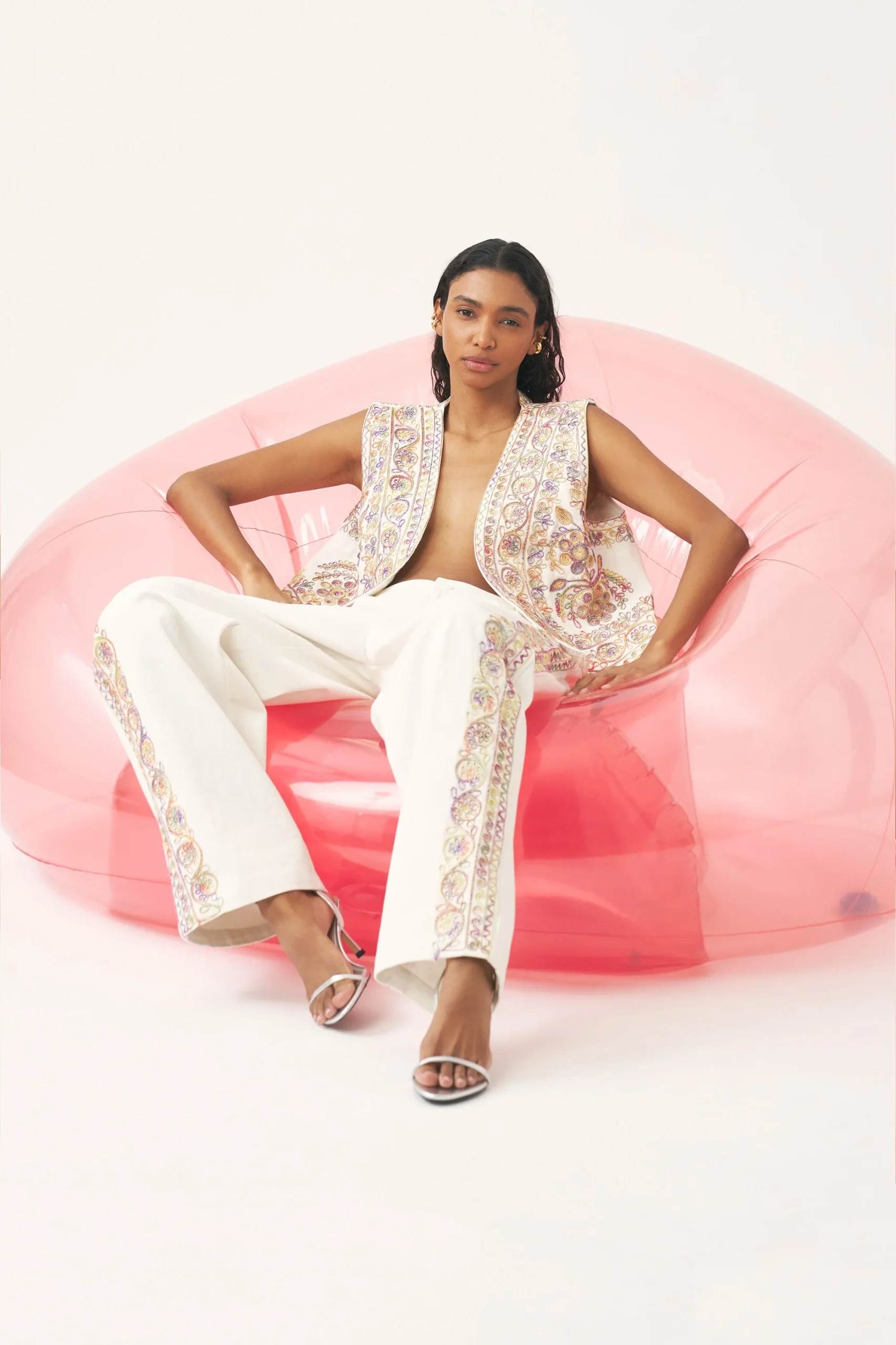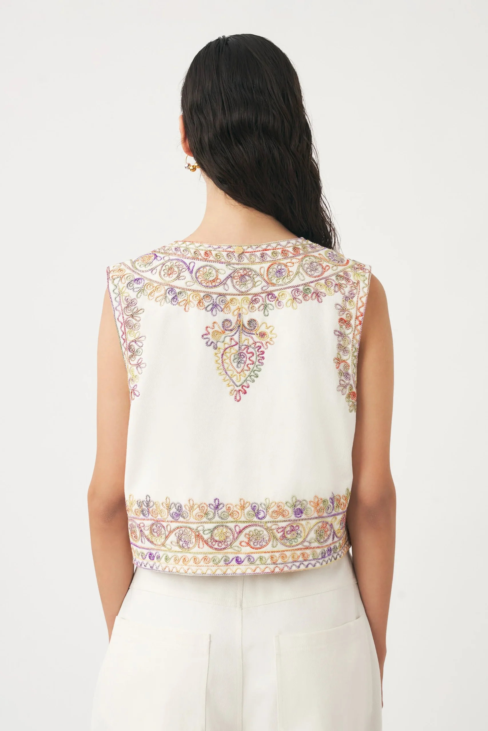 Gilet brodé en coton twill. Broderies faites main en coton tie and dye sur toute la surface. Doublure en coton.