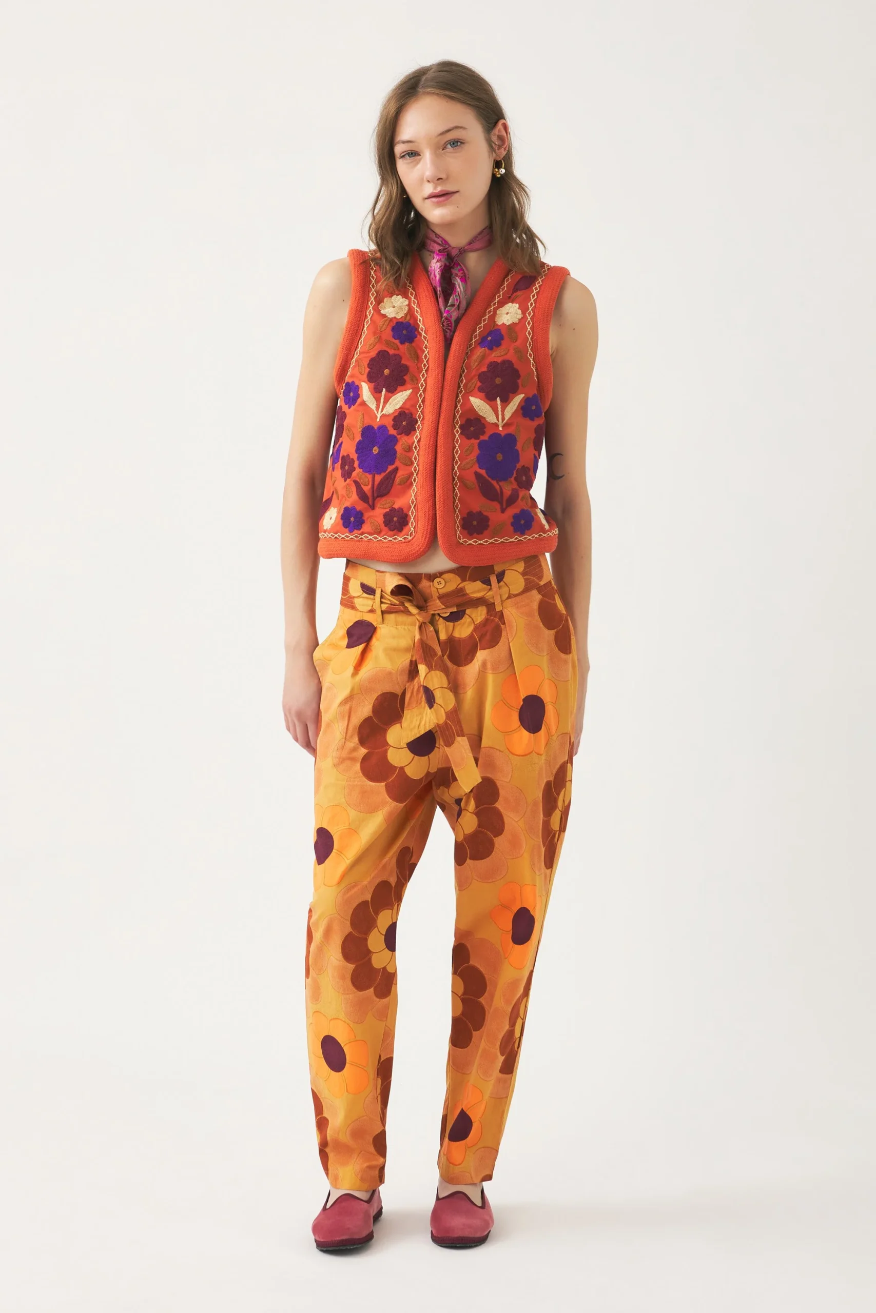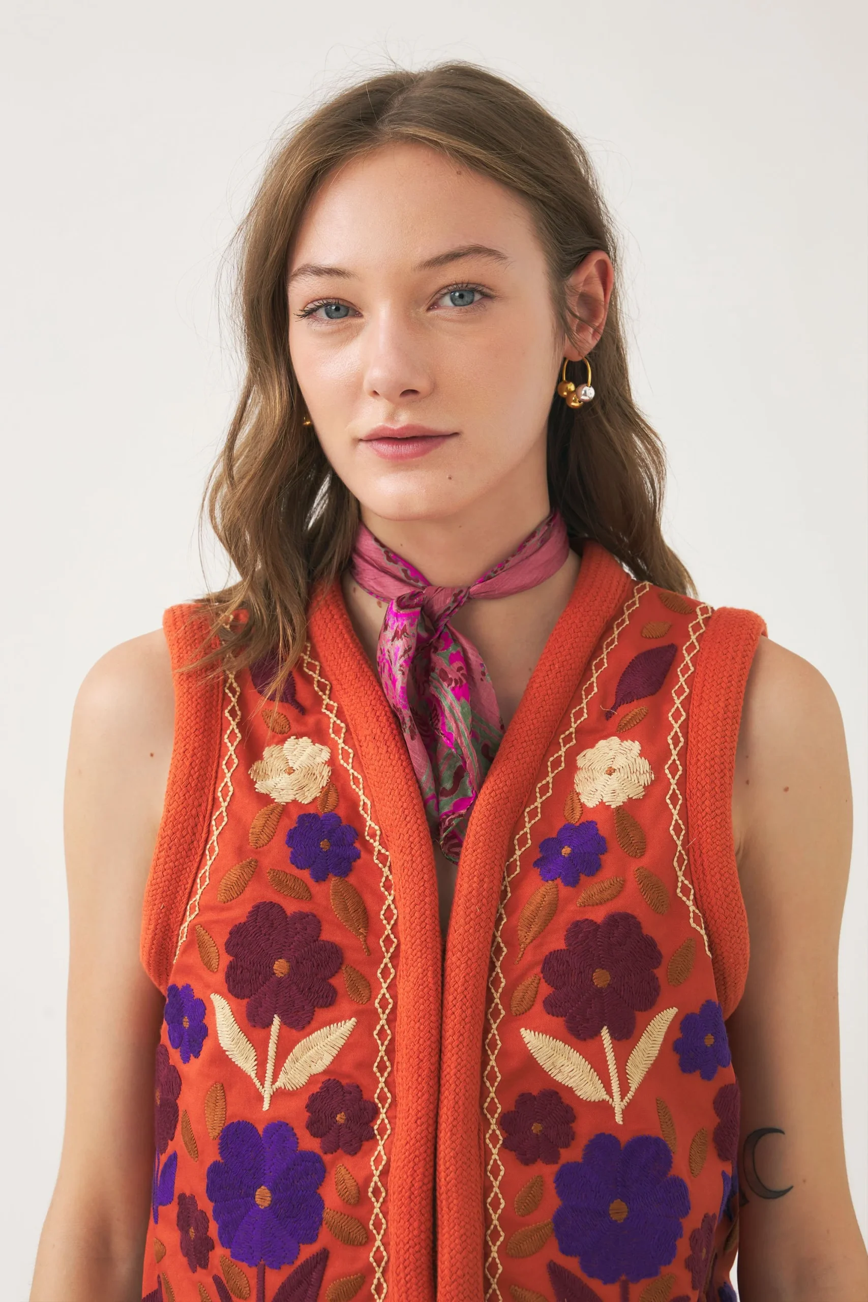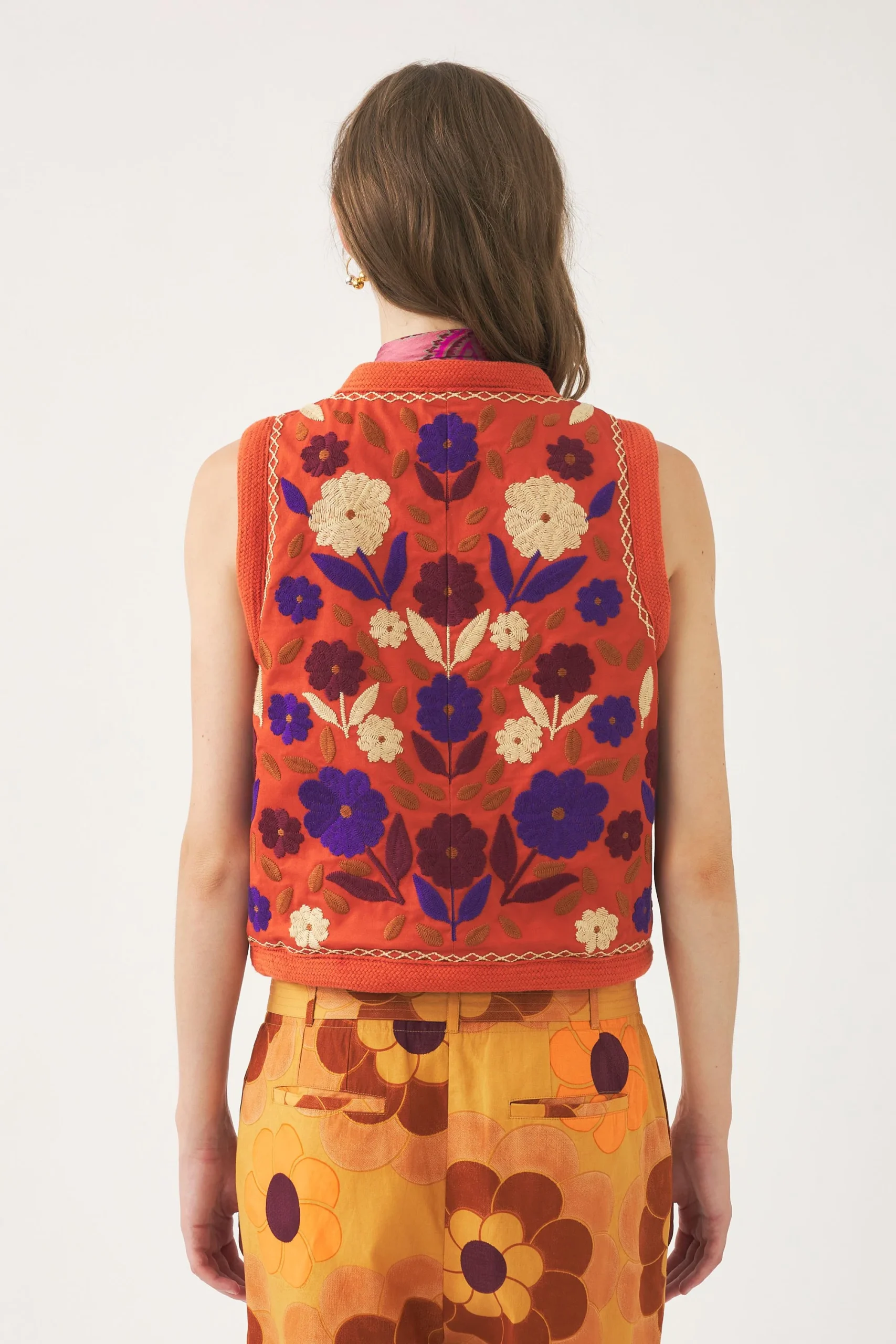 Gilet brodé sans manches d’inspiration afghane. Broderie florale artisanale sur l’ensemble du gilet. Broderie en lurex. Finition avec bordure en galon de coton. Fermeture par fermoir. Doublure intérieure.