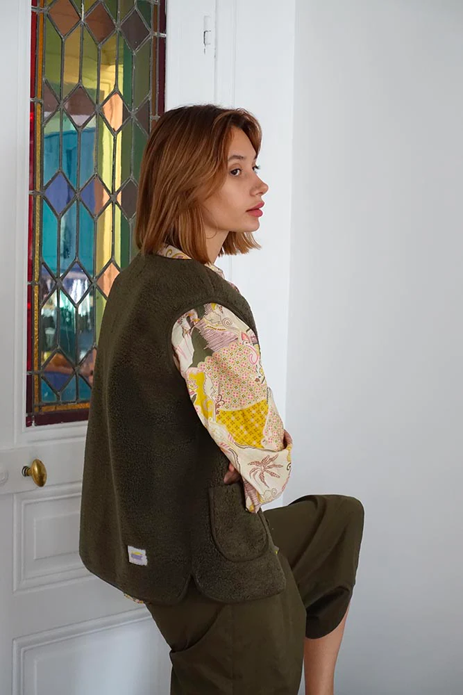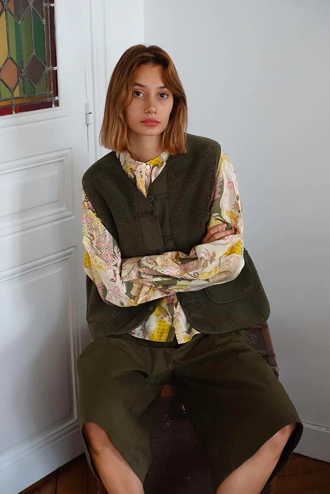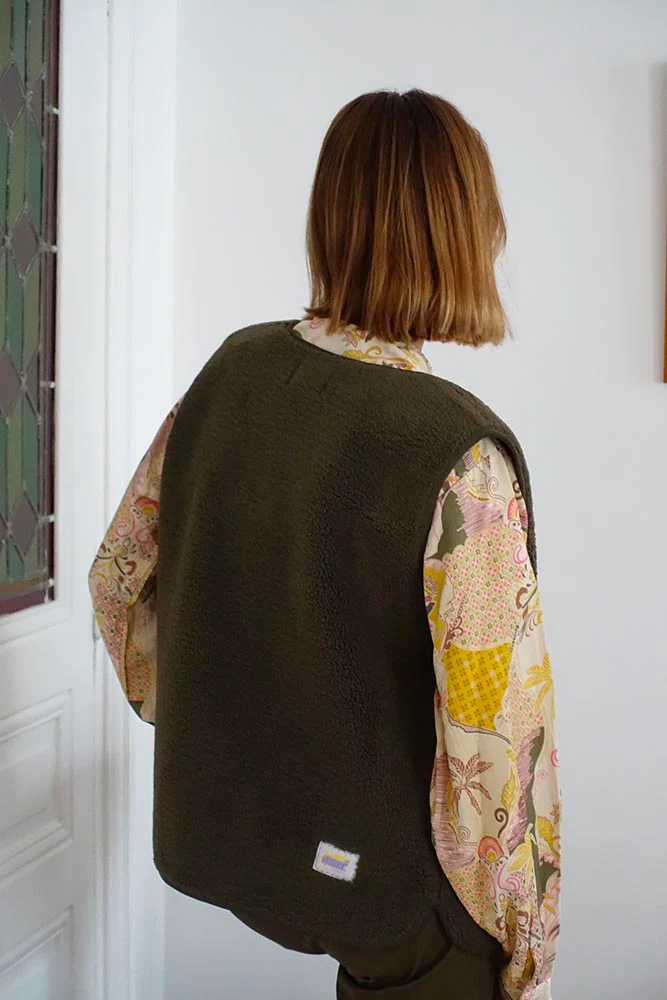 Ce gilet sans manches SOLAL en couleur kaki allie élégance et fonctionnalité pour un look décontracté et polyvalent. Conçu dans un tissu sherpa 100% polyester, il offre une douceur et un confort optimaux, idéal pour les saisons intermédiaires.