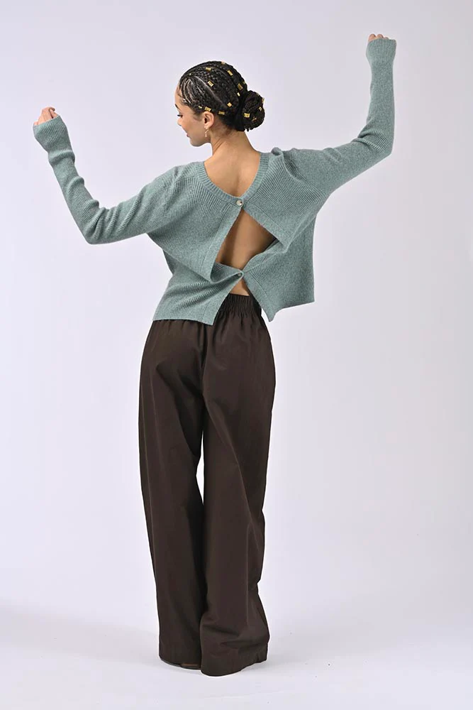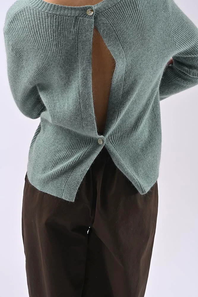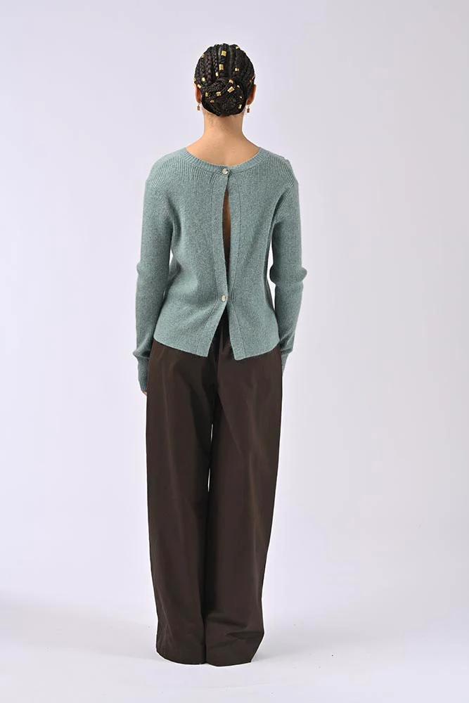 - Détail élégant dans le dos avec une ouverture fermée par un bouton