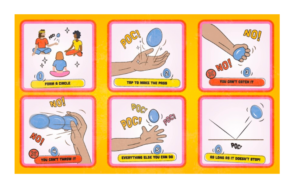 * Il fait partie de la règle que chacun peut apporter ses propres « règles » et jouer comme il lui plaît : Record du nombre de passes , record de l’échange le plus long, un seul rebond ou sans rebond, jouer que de la main gauche, passes dans le sens des aiguilles d’une montre, etc…