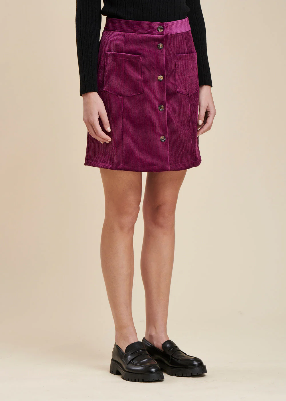 Jupe courte en velours côtelé, boutonnée sur le milieu devant, petites poches plaquées. Longueur : 49 cm.