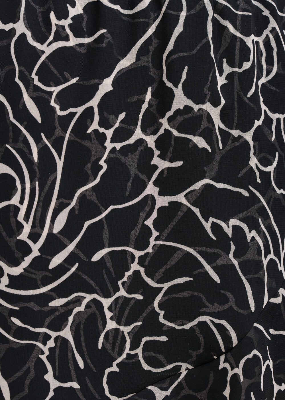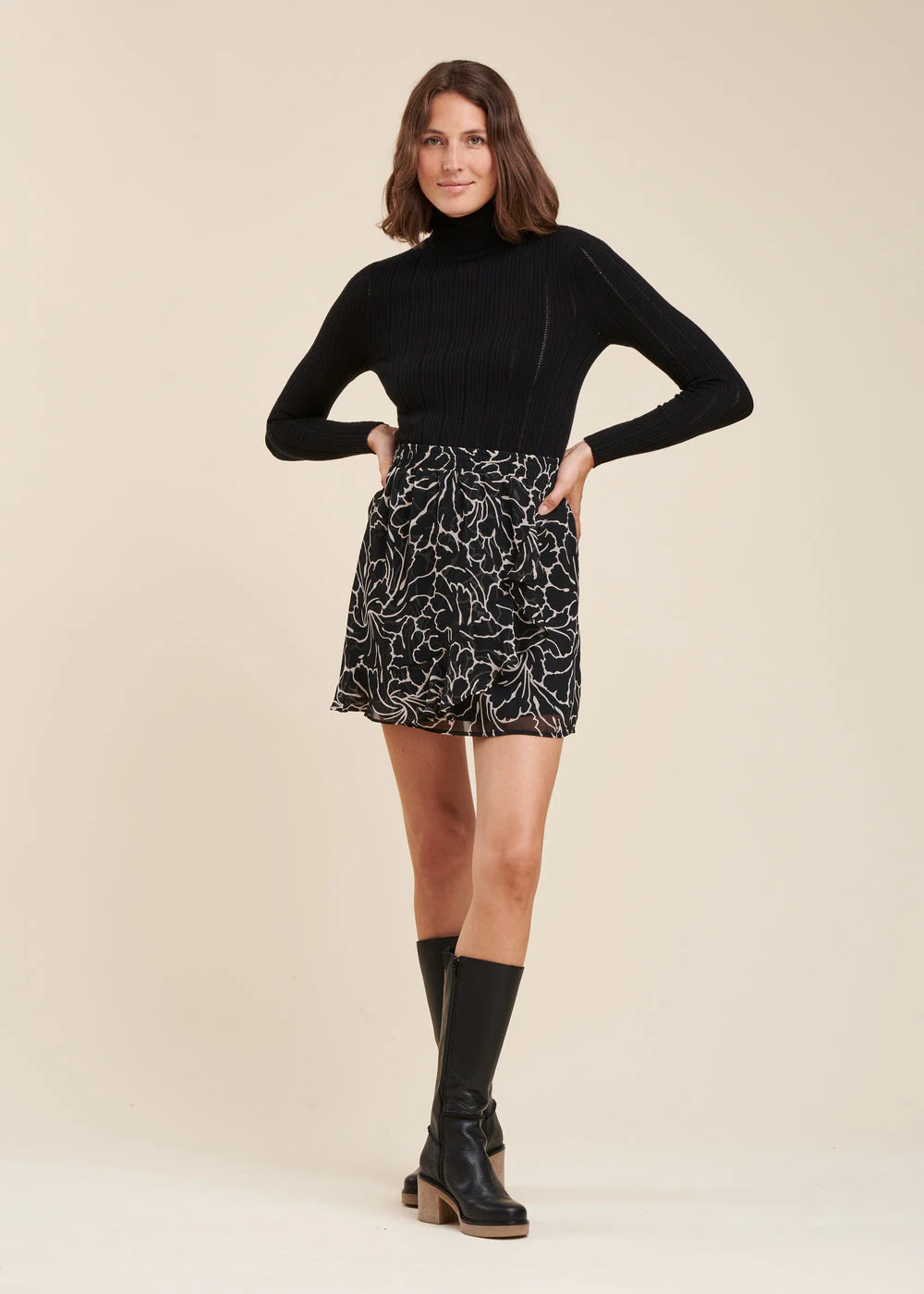 Jupe courte faux portefeuille en voile de polyester recyclé à imprimé floral, ceinture élastiquée, pan du portefeuille avec volant, jupe doublée. Modèle écoresponsable en polyester recyclé. RCS EGL/252903. Longueur : 46 cm.