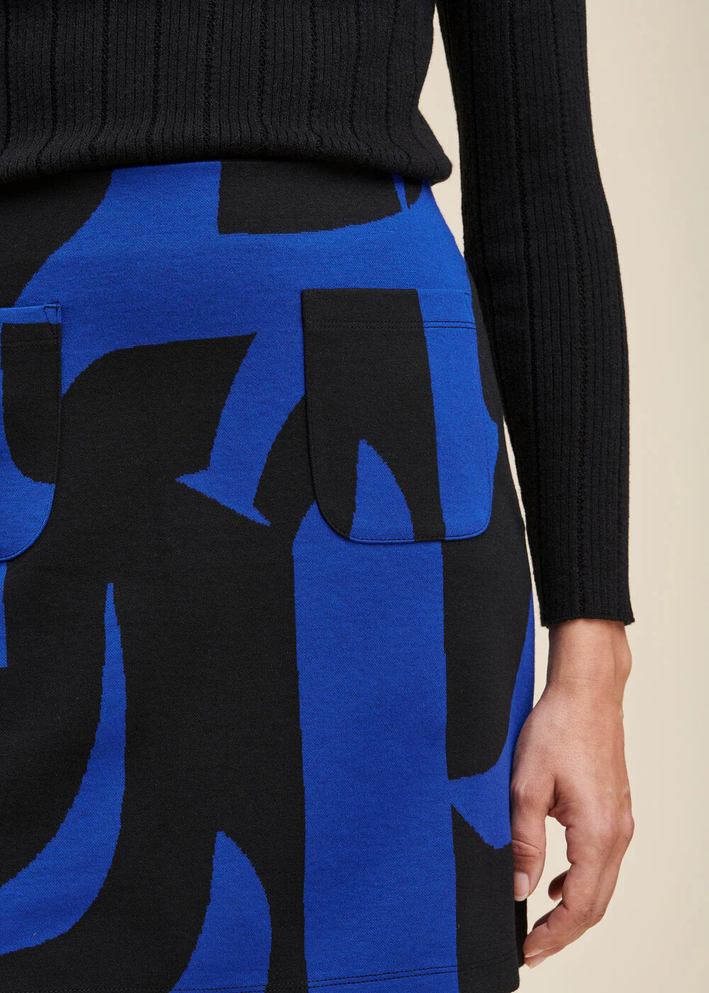 Jupe courte en jersey à motif géométrique, très légèrement évasée, petites poches plaquées, zip côté apparent. Longueur : 45 cm.