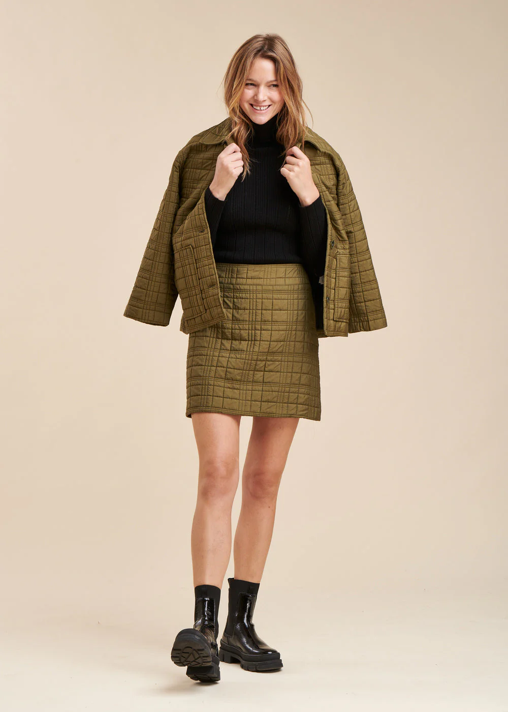 Jupe courte dans un tissu matelassé, très légèrement évasée, zip côté apparent. Longueur : 44 cm.