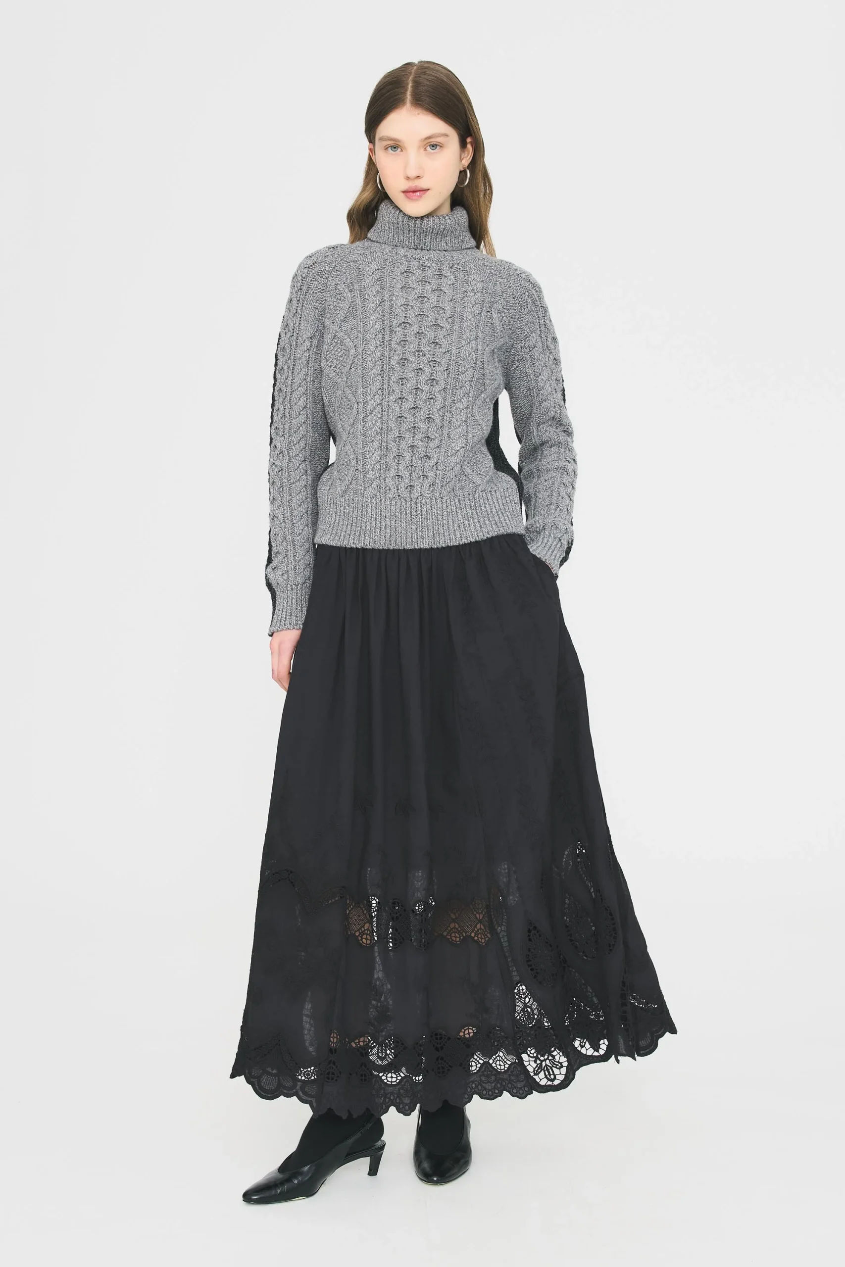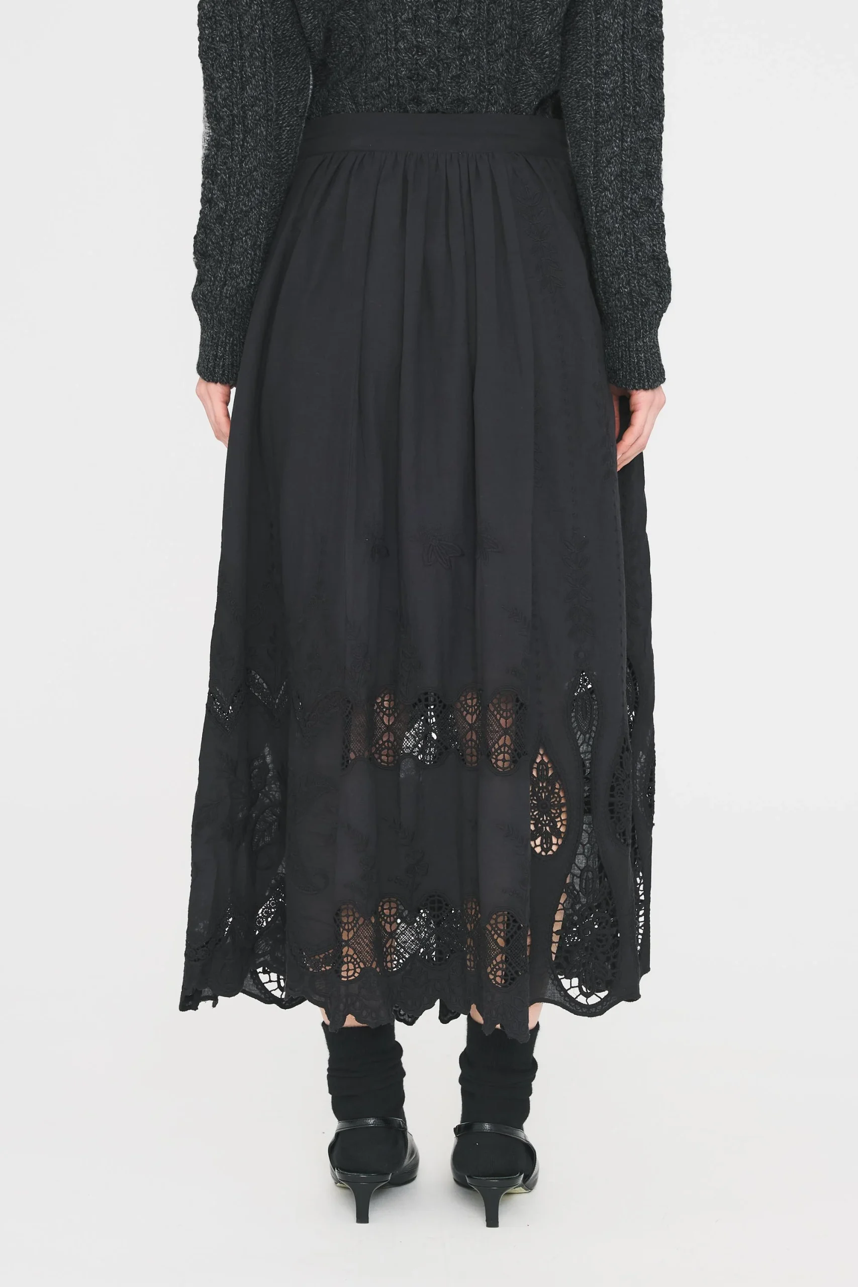 Jupe longue doublée en voile de coton. Broderies ajourées et faites artisanalement. Fermeture par zip et crochet. Jupon intégré. Plis religieuses.