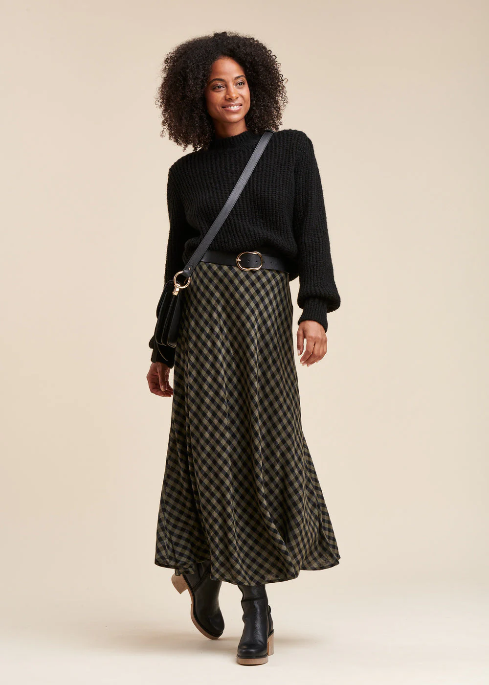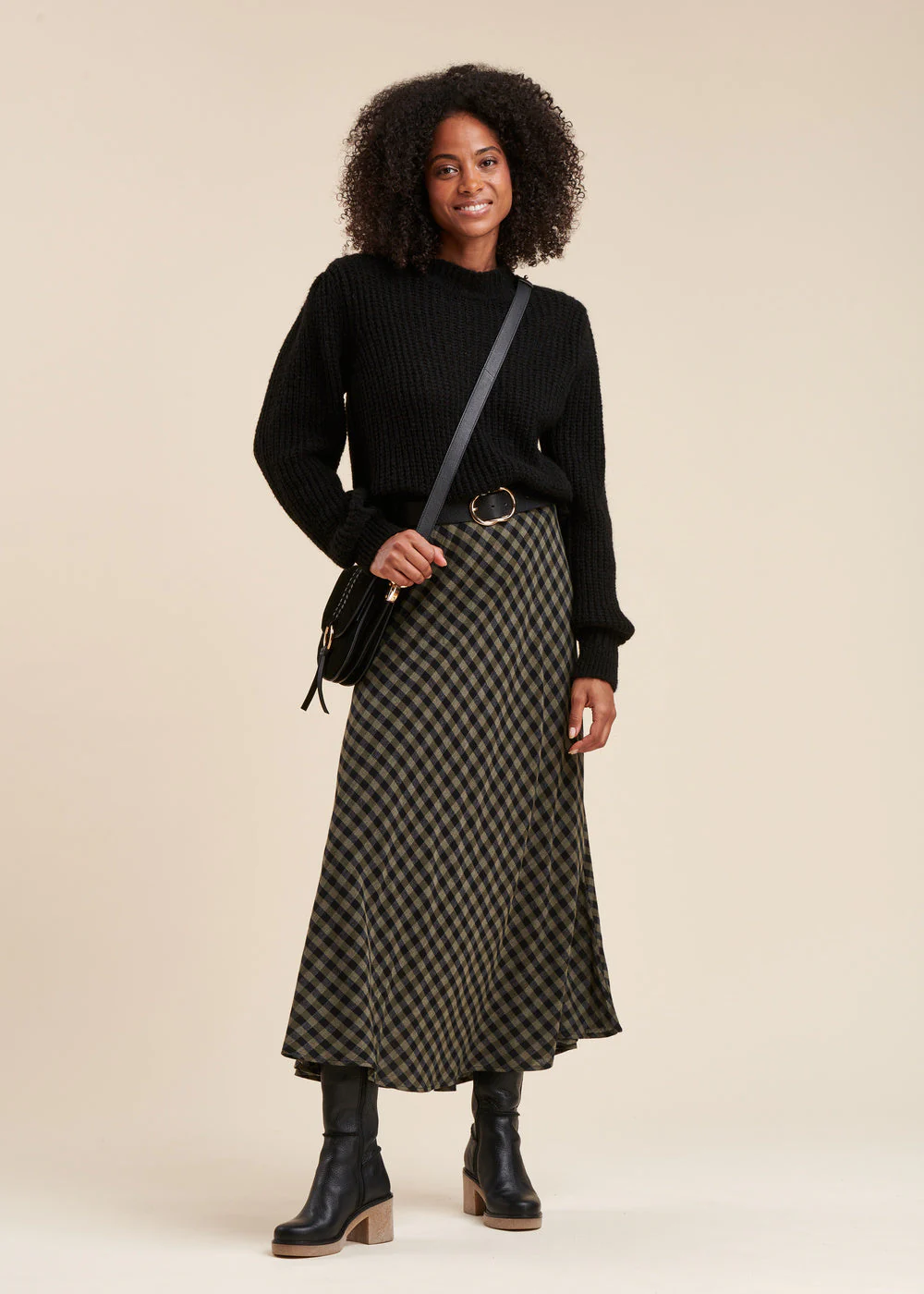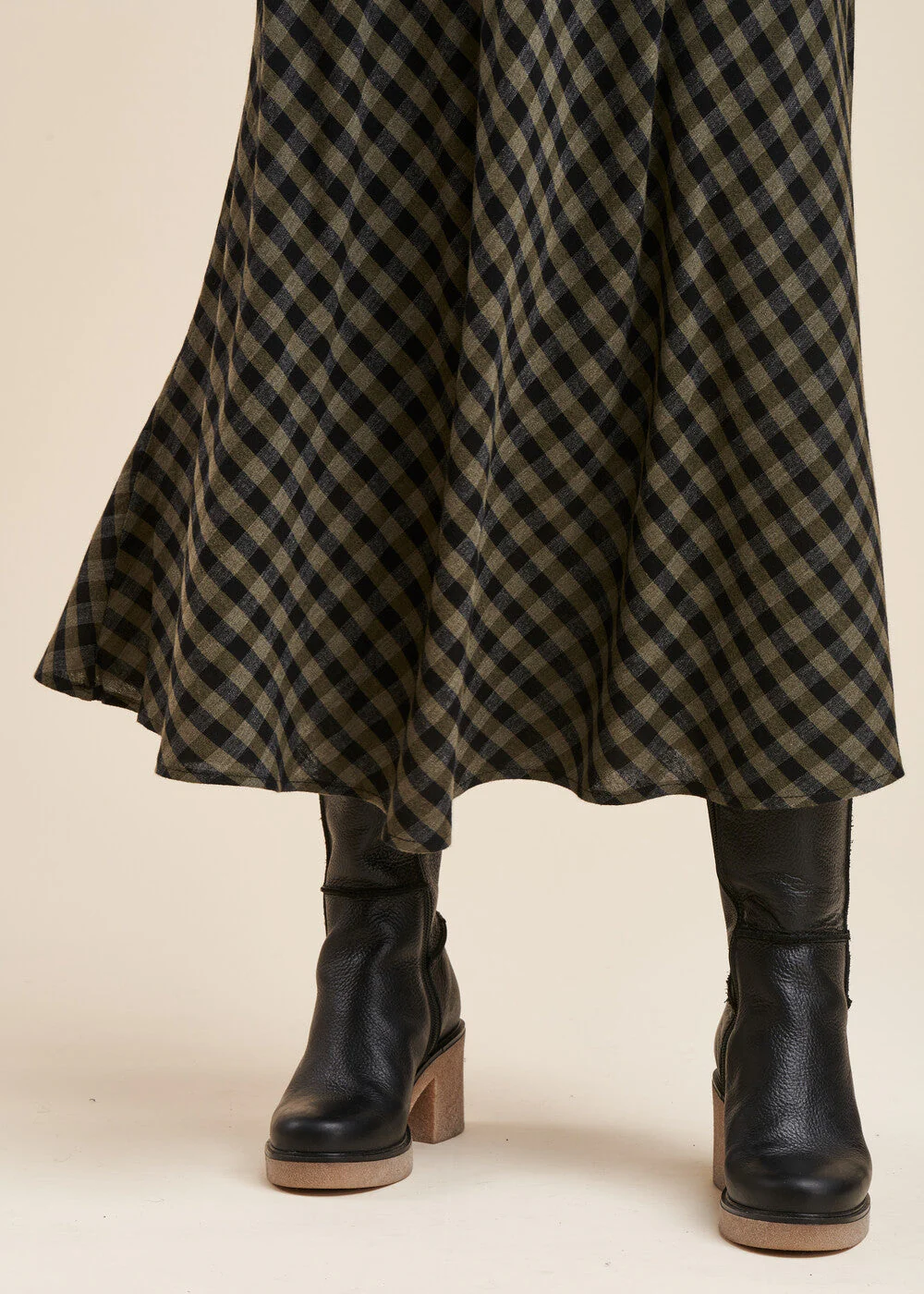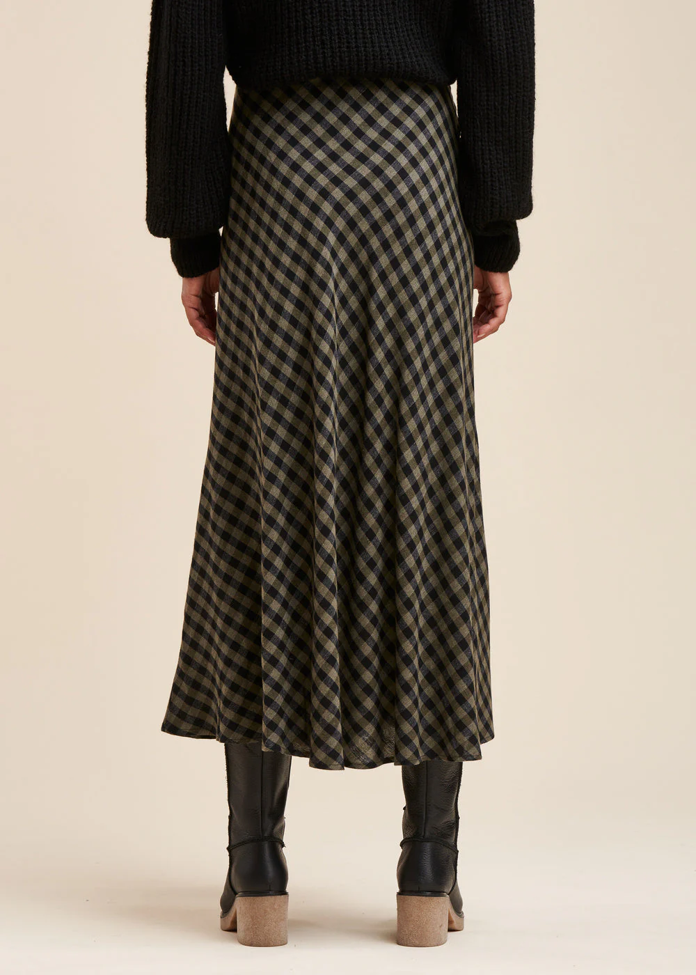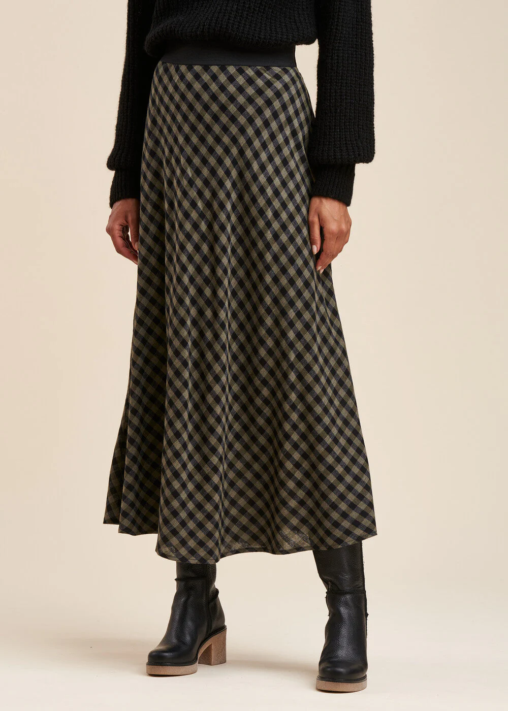 Jupe longue à carreaux, ceinture élastique, bas de jupe évasé, jupe doublée. Longueur : 95 cm.