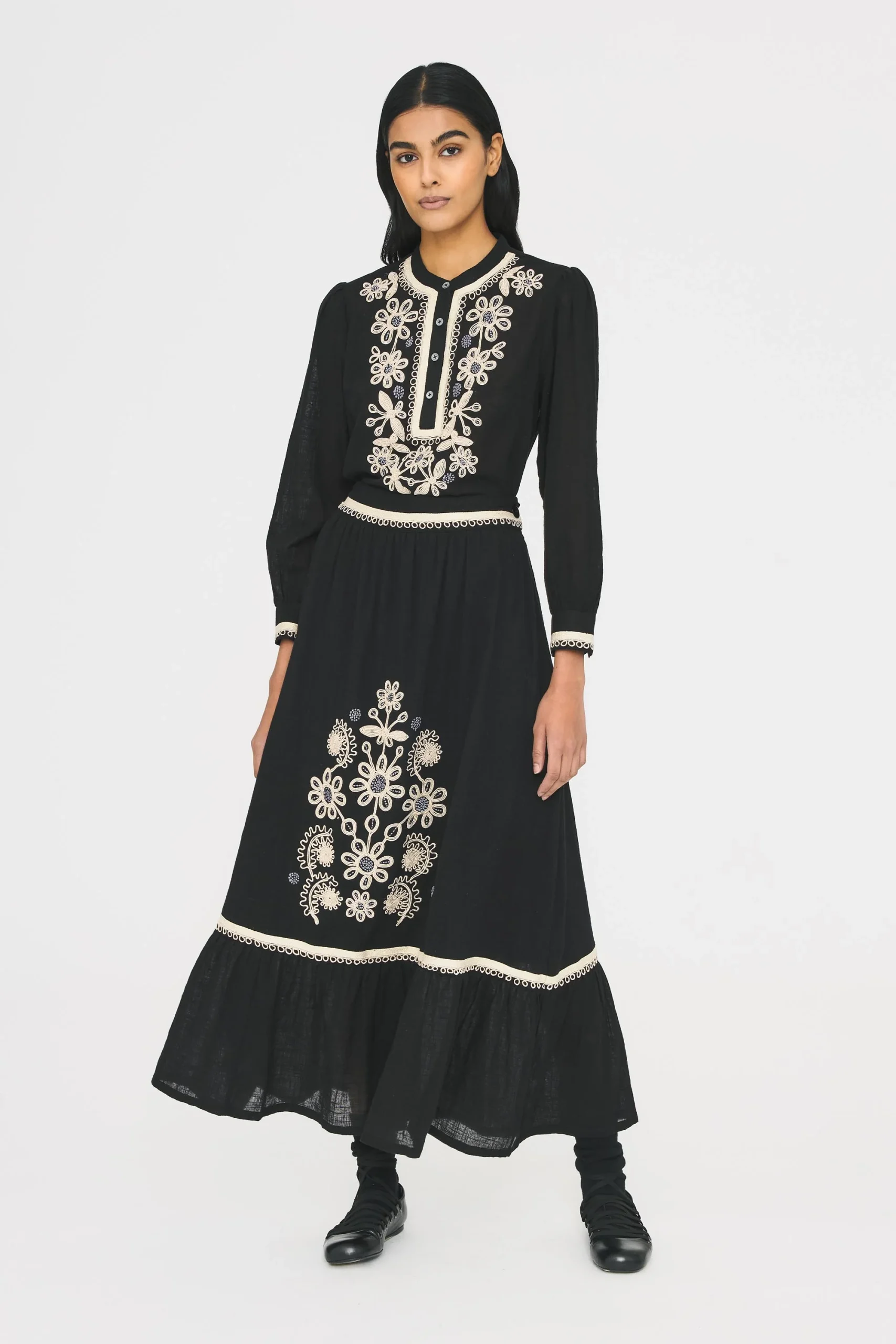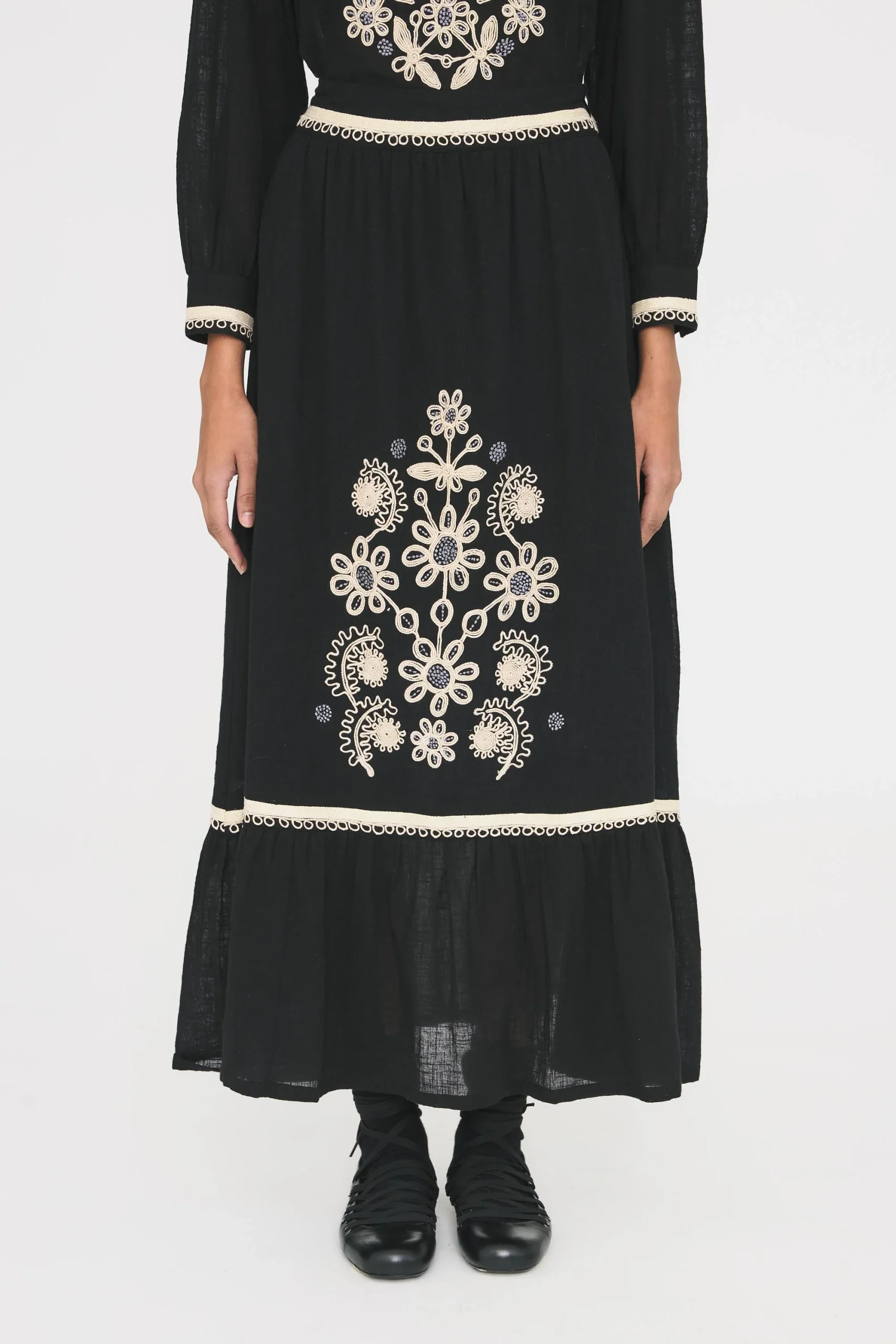 Jupe longue brodée fils lurex artisanalement. Doublée. Fermeture zip à au dos.