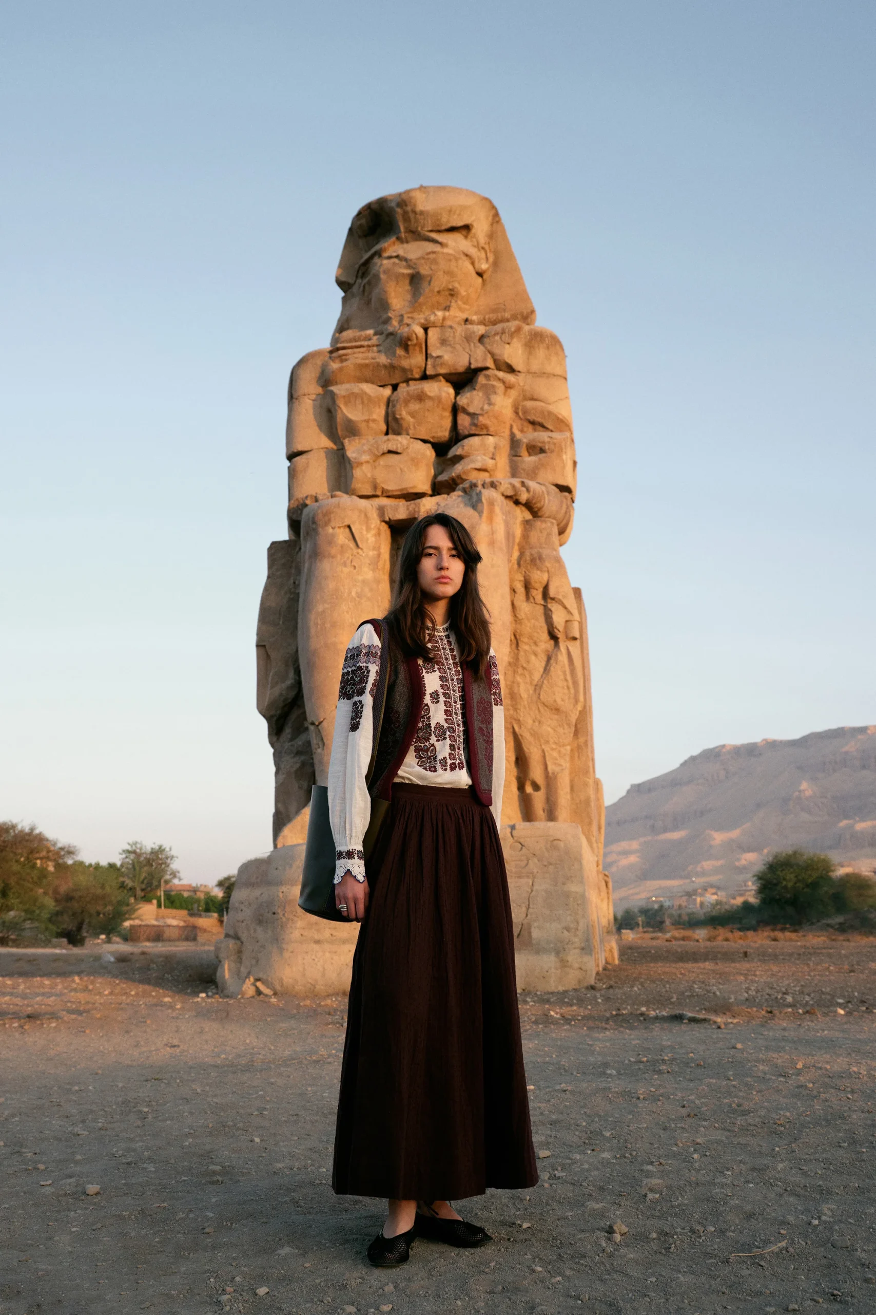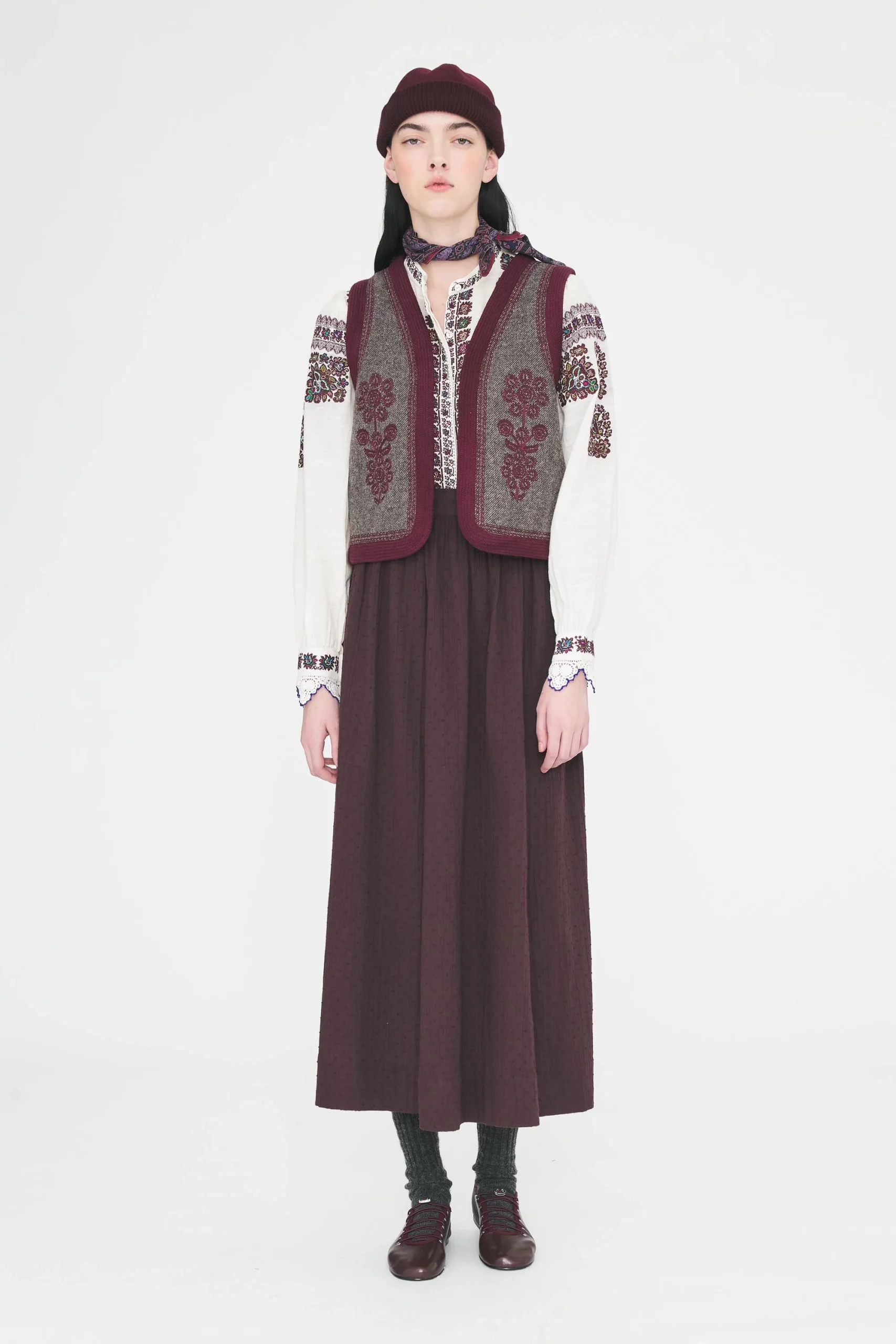 Jupe longue doublée en gaze de coton effet plumetis . Ceinture large. Fronces au départ de la ceinture. Fermeture zip.
