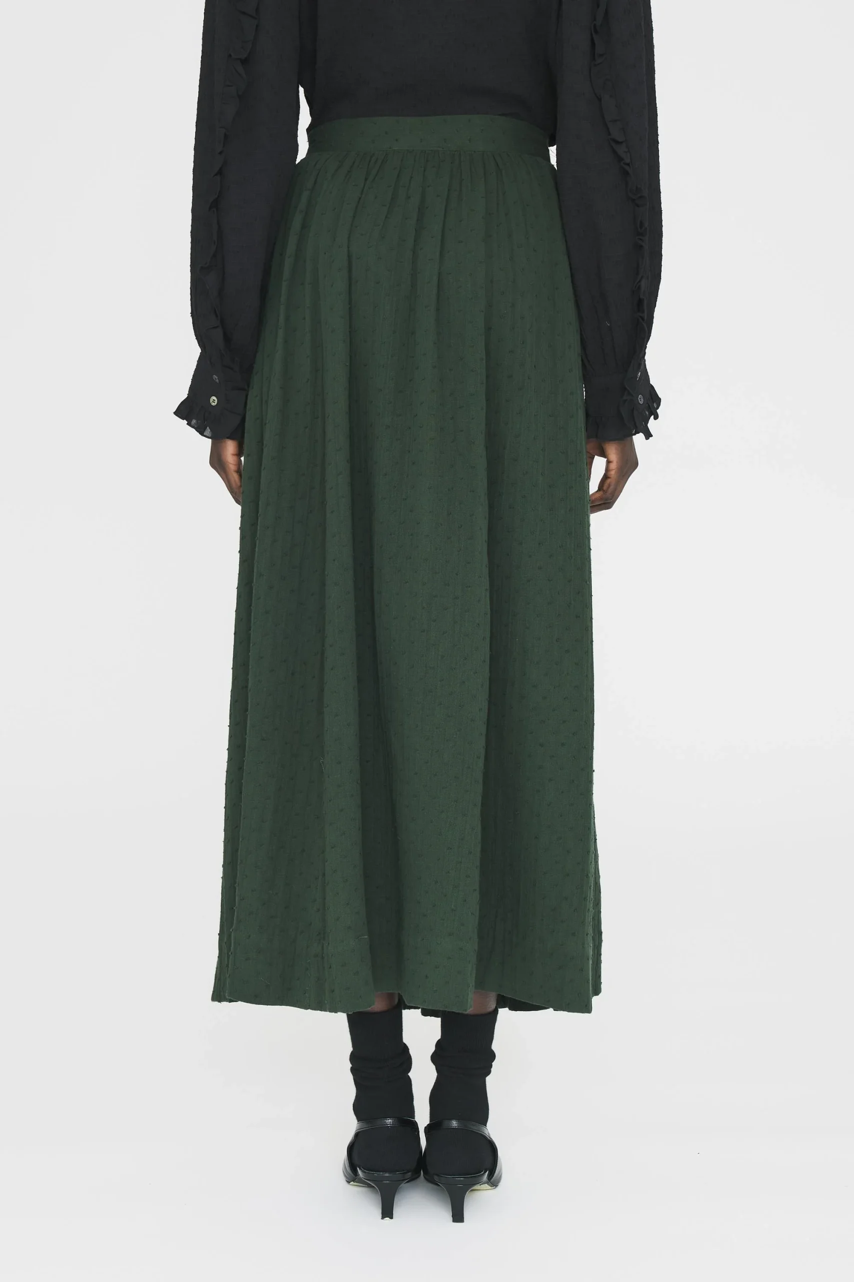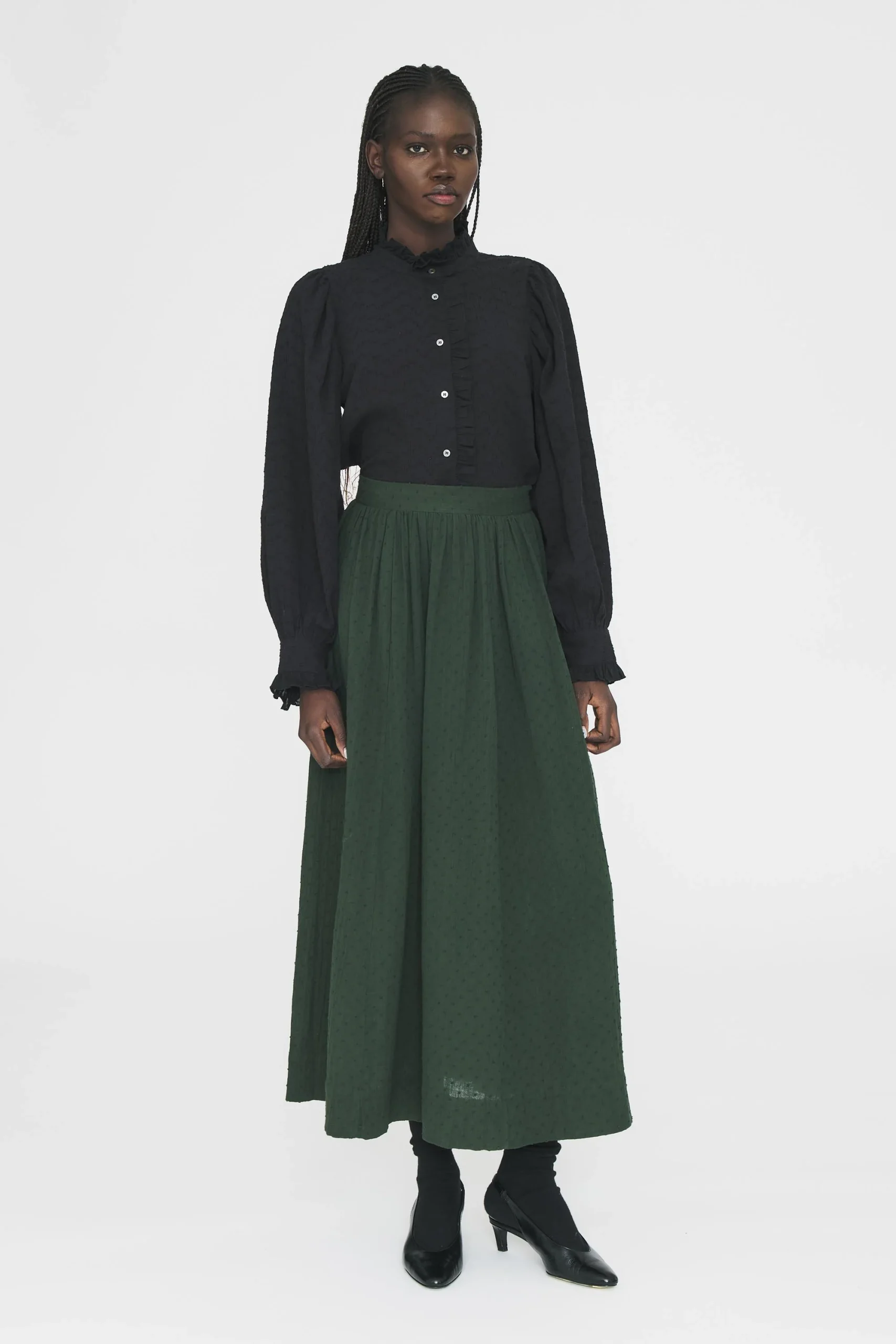 Jupe longue doublée en gaze de coton effet plumetis . Ceinture large. Fronces au départ de la ceinture. Fermeture zip.