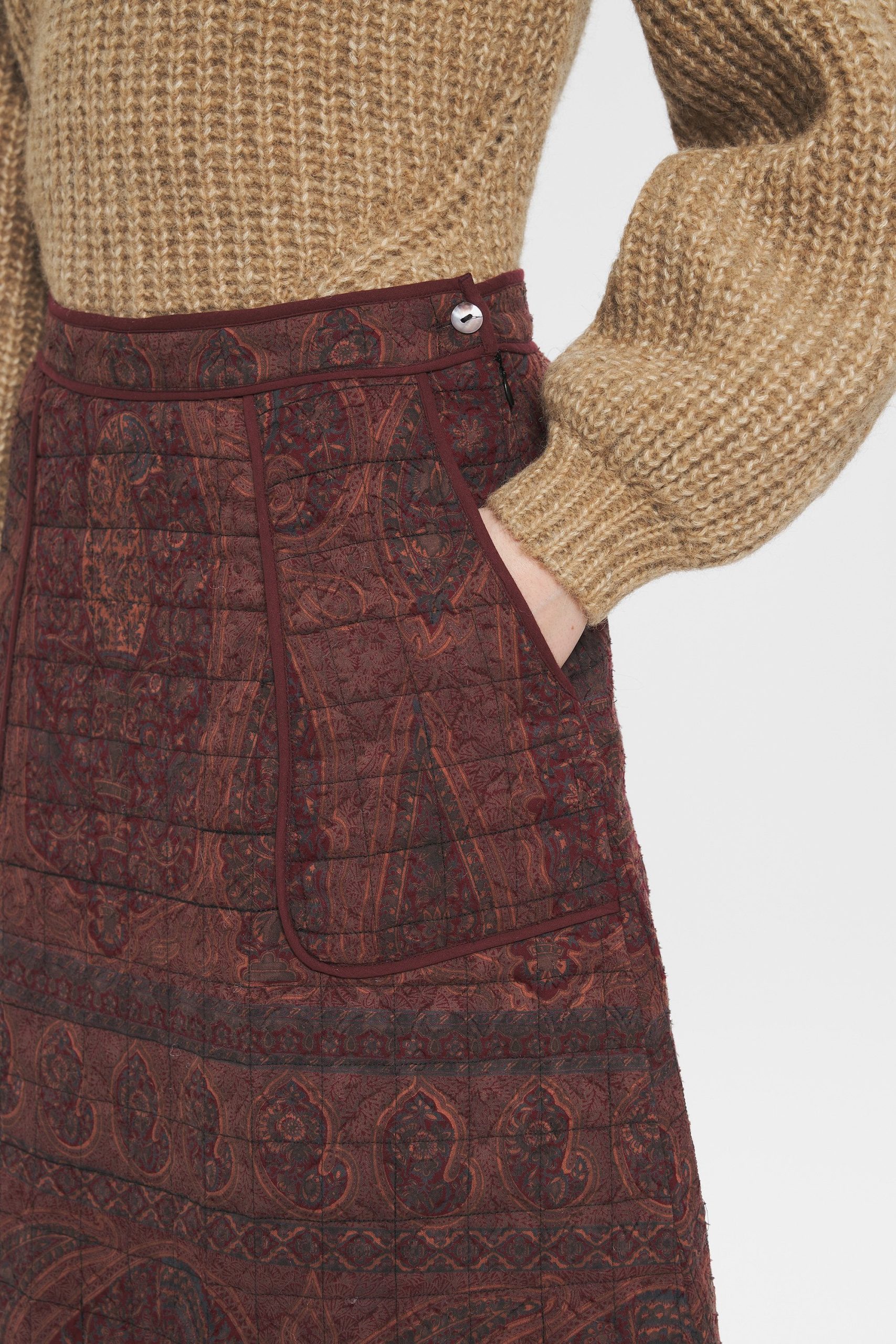 Jupe mi-longue en jacquard de coton imprimé avec surpiqûres. Imprimé dessiné dans notre atelier parisien puis appliqué à la main sur le tissu selon la technique du block print (savoir-faire artisanal indien). Deux poches latérales sur l’avant. Fermeture avec un zip et un bouton sur le côté gauche. Bouton de nacre naturelle. Doublure en coton à imprimé contrasté.