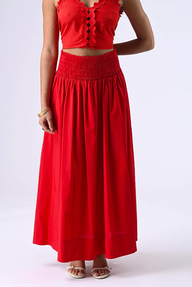 Jupe longue fluide, taille élastique, poches pratiques et détail broderie élégant. Couleur rouge