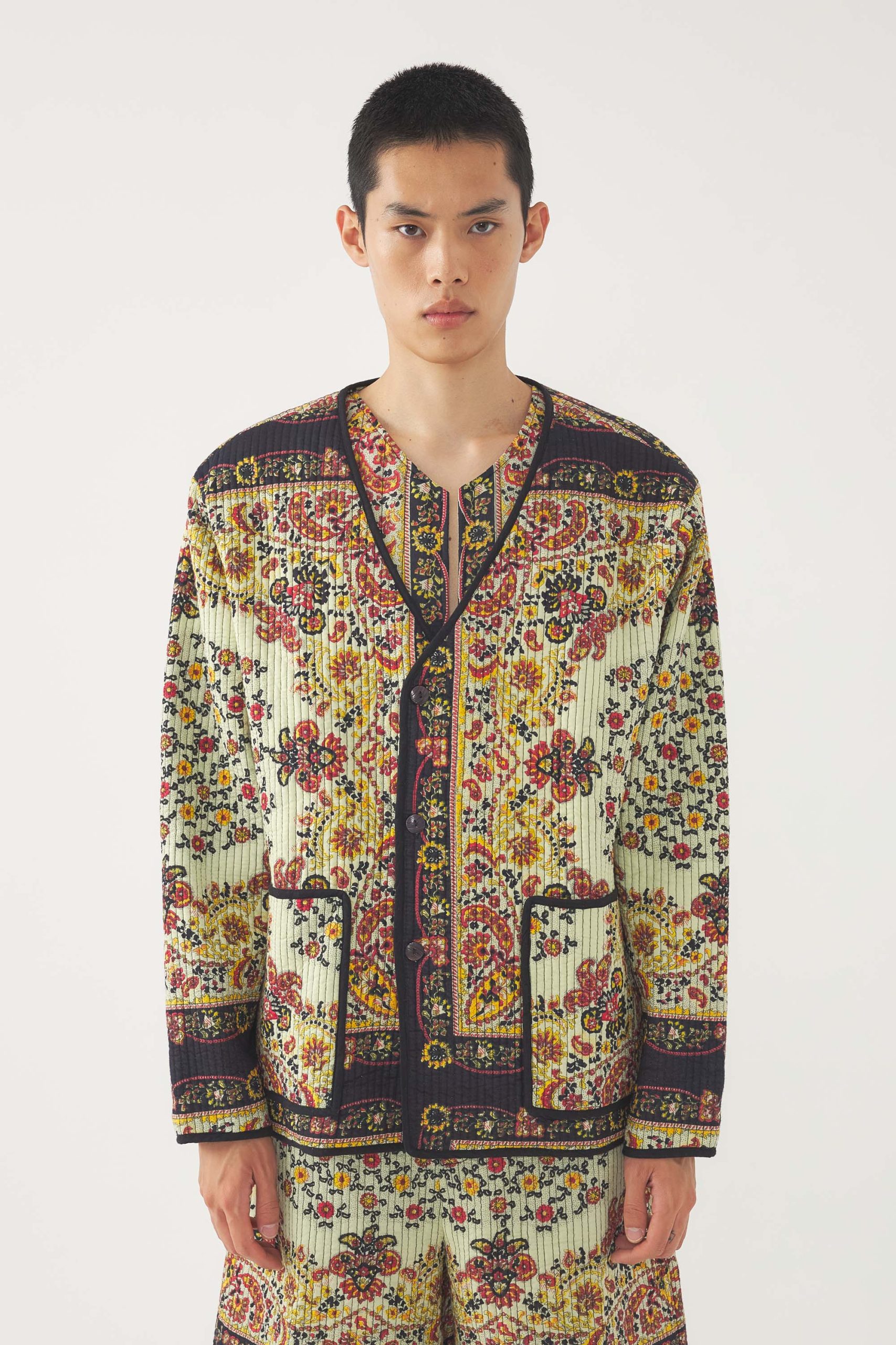Veste façon kimono en coton voile de coton quilté. Imprimé au batik. Deux poches latérales. Fermeture par boutons pression non-visibles. Ceinture amovible. Doublure intérieure à imprimé contrasté.