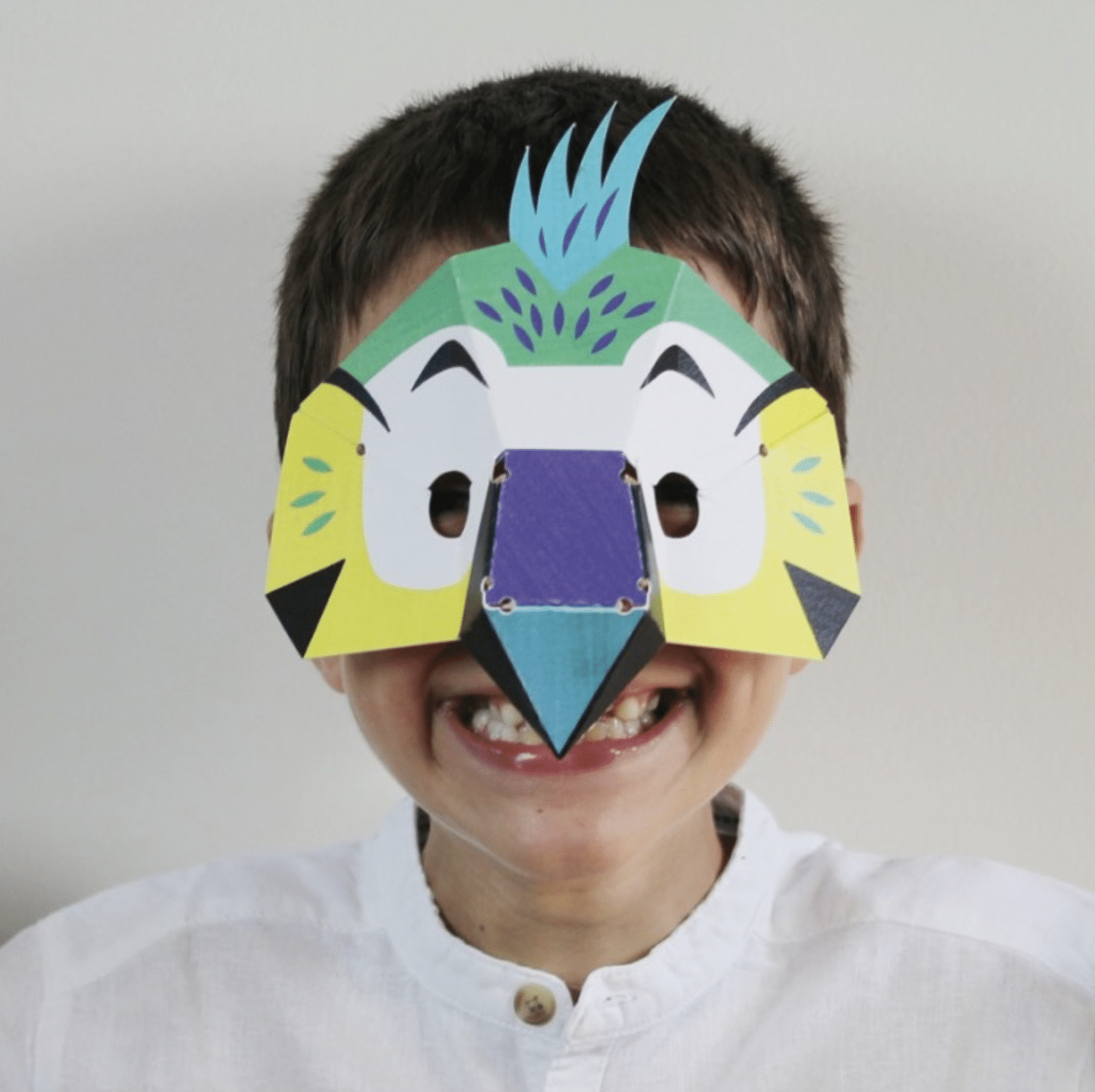 4 masques en papier à mettre en volume et à colorier.